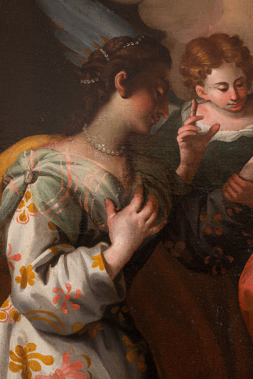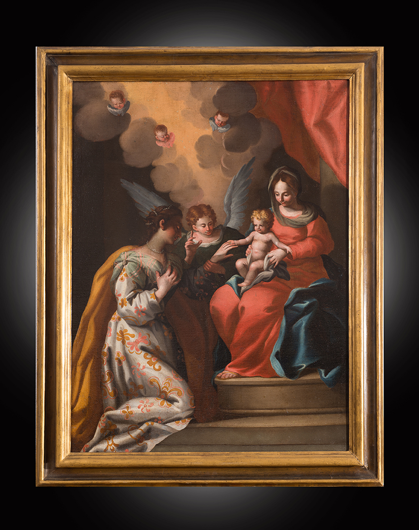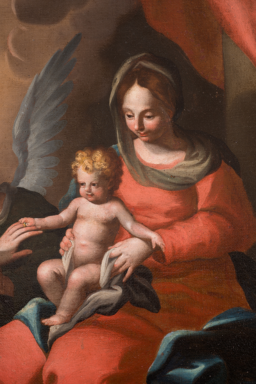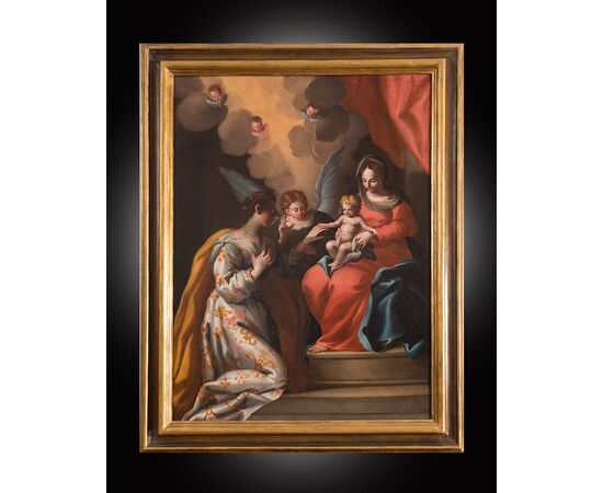 Description: Antique oil painting on canvas depicting the mystical marriage of Saint Catherine.The work is rich in iconographic inventions and tuned to full-bodied and bright colors, with effects of great preciousness. The mystical marriage of Saint Catherine, to whom the Child, held by Mary in a dazzling red dress with blue trim, is inserting the wedding ring.