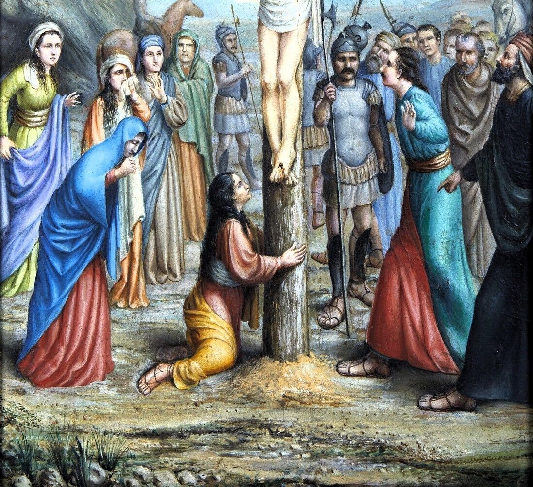 The scene, as per tradition, shows Mary Magdalene kneeling at the foot of the cross, sharing her grief with the Madonna and Saint John.