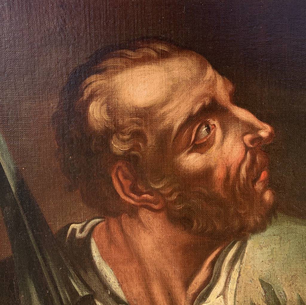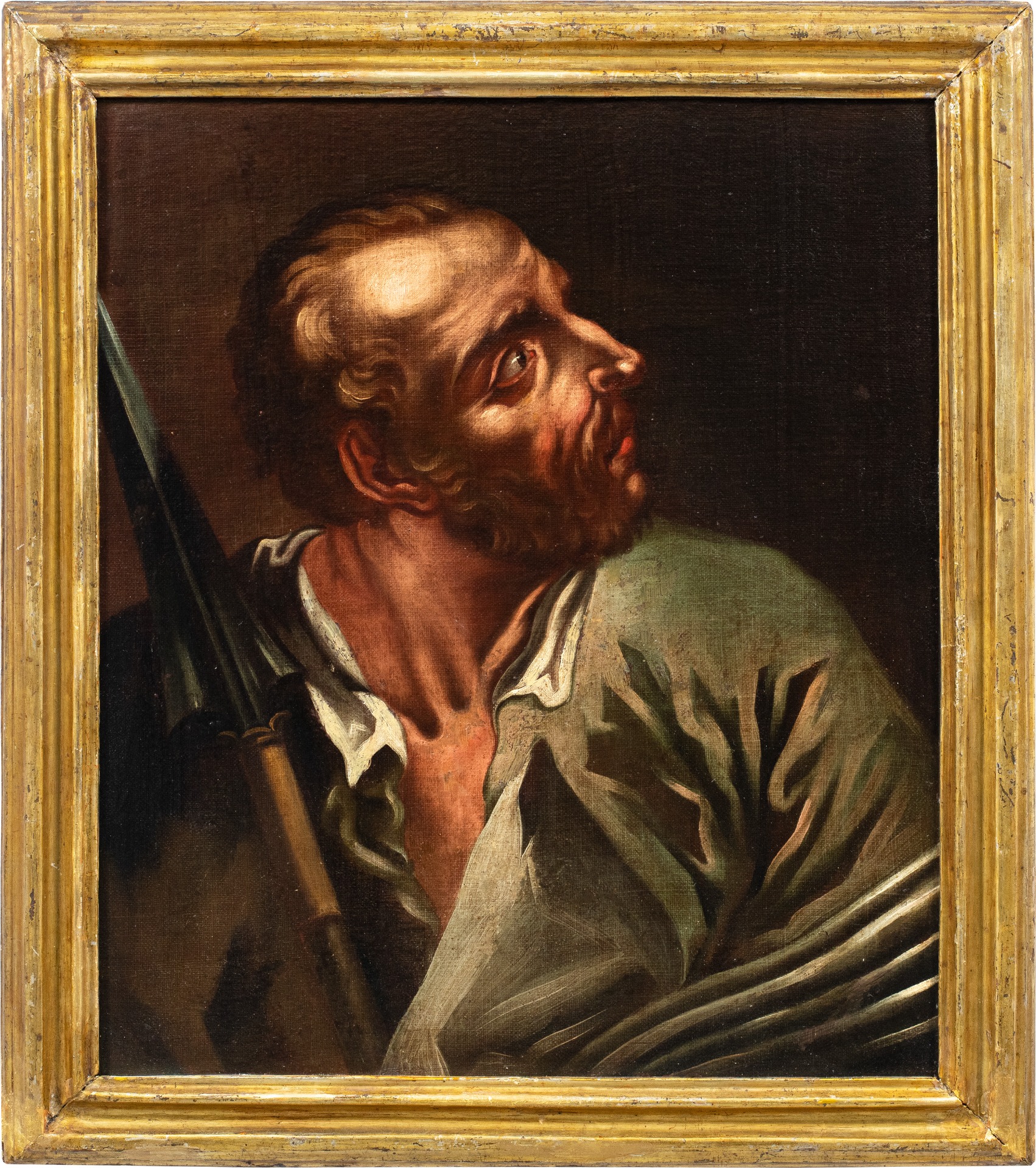 Giambattista Piazzetta (Venice 1683 - Venice 1754) circle of - Saint Thomas. 62.5 x 52.5 cm without frame, 72.5 x 62.5 cm with frame. Antique oil painting on canvas, in contemporary carved and gilded wooden frame from the 18th century. Condition report: Lined canvas. Good condition of the painted surface, with scattered paint losses (restoration recommended). The painting is presented in its original 18th-century frame. - All shipments within the EU are free and professionally packaged. - Each item is sold with a certificate of authenticity with legal validity. - Further information on the condition report is available upon request. - Viezzi Arte guarantees quality and professionalism at competitive prices, contact us at info@viezziarte.it or via WhatsApp at +39 3402841279. *Message for non-Italian buyers: Please note that this work has not yet obtained the export certificate from Italy from the Superintendence of Cultural Heritage. This document certifies that the work is not part of the Italian cultural heritage. Normally the release times for the certificates are 40 days from the date of appointment: The new legislation in force since 2021 provides, for amounts declared less than €13,500, shorter times at the discretion of the experts' commission. All costs of this operation are included.