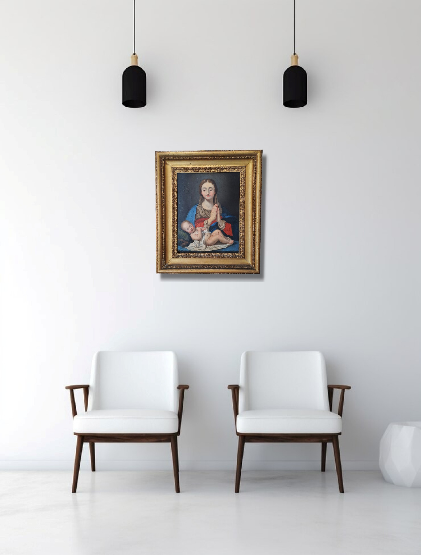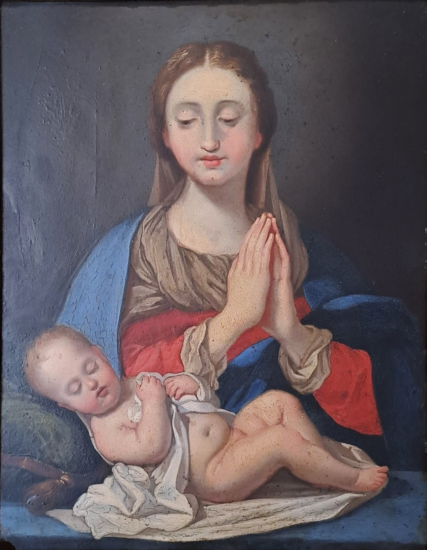 Subject: The Virgin Mary is depicted in a pose of prayer, with her hands clasped, while she tenderly observes the Child Jesus asleep on her knees.
