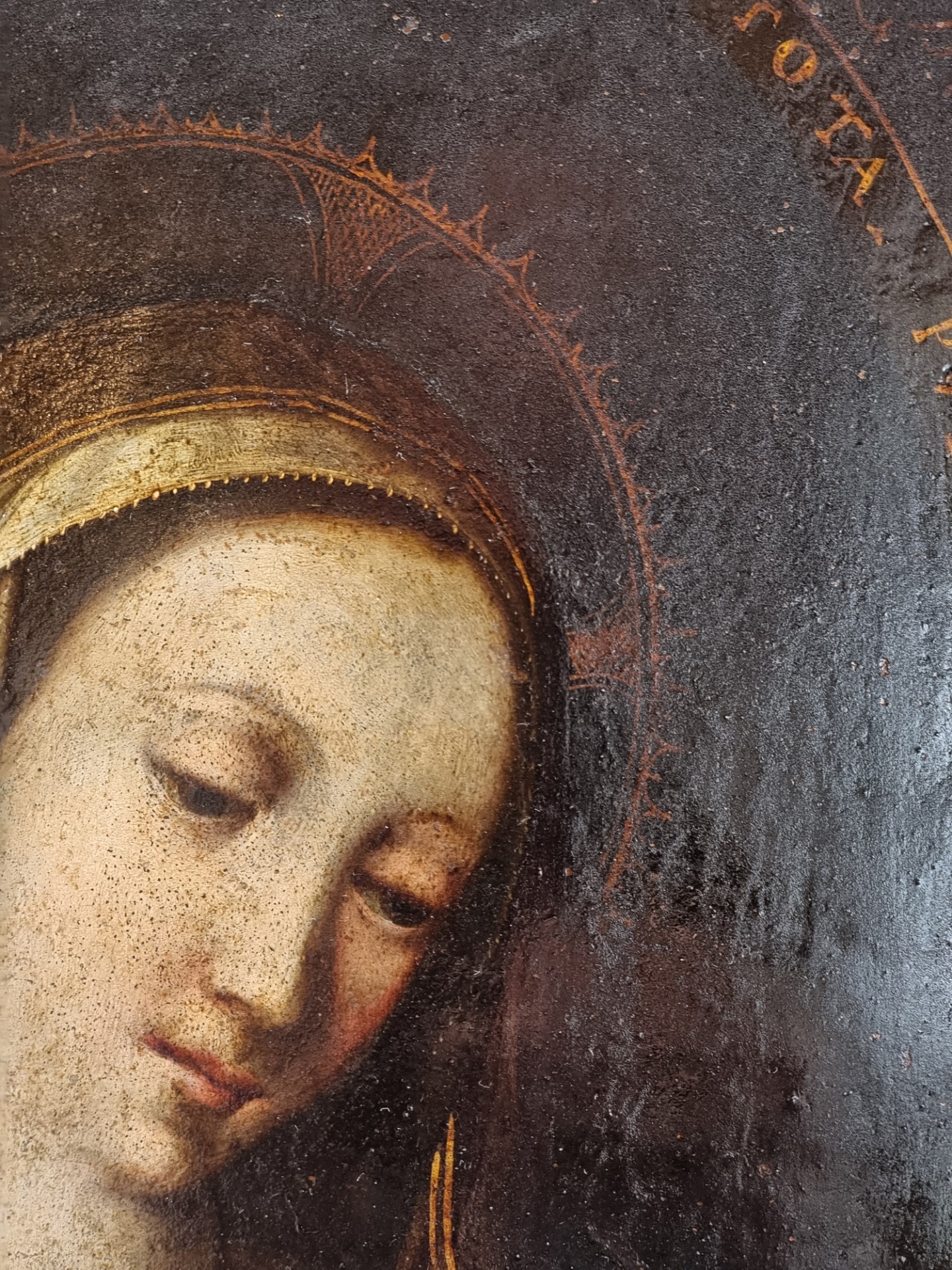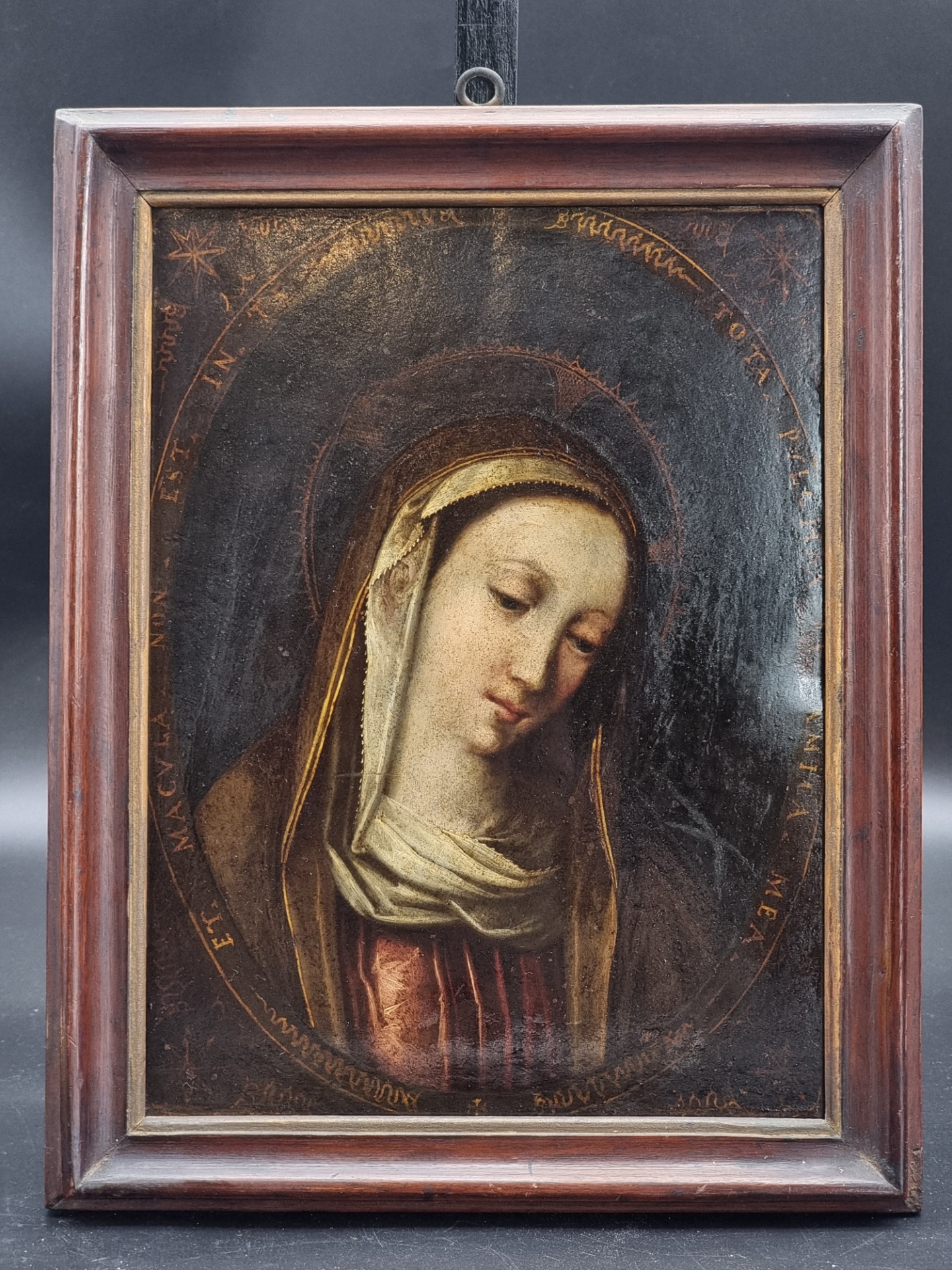Raffinato dipinto ad olio su lastra di rame, raffigurante la Vergine Maria in delicata espressione di meditazione, racchiusa entro un’aureola decorata da una scritta dorata con il testo latino “Tota pulchra es amica mea, et macula non est in te”, tradizionalmente riferito all’Immacolata Concezione. La pittura, impostata su uno sfondo scuro che esalta la luminosità del volto e del velo, mostra una pennellata precisa e levigata, tipica della scuola veneta tra la fine del Seicento e l’inizio del Settecento. La resa morbida dei lineamenti e il raffinato trattamento dei panneggi richiamano modelli di area veneziana e padovana, con suggestioni derivate dal classicismo di Guido Reni e dal tonalismo locale. Opera su rame (cm 23 × 30), in cornice postuma in legno di noce (cm 27 × 35).Provenienza: collezione privata.Stato di conservazione: buono. Un dipinto di elegante fattura e intensa spiritualità, concepito per la devozione privata. Per ulteriori informazioni, fotografie ad alta risoluzione o dettagli tecnici, non esitate a contattarci. Spedizioni disponibili in tutto il mondo con imballaggio professionale.