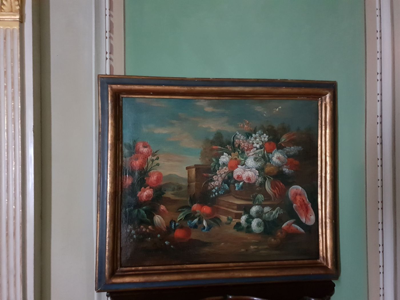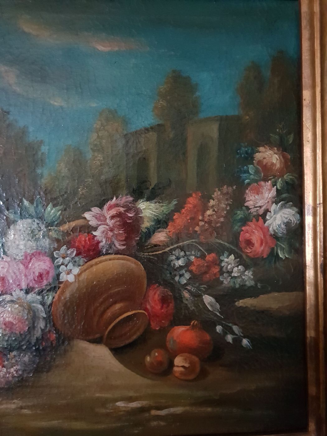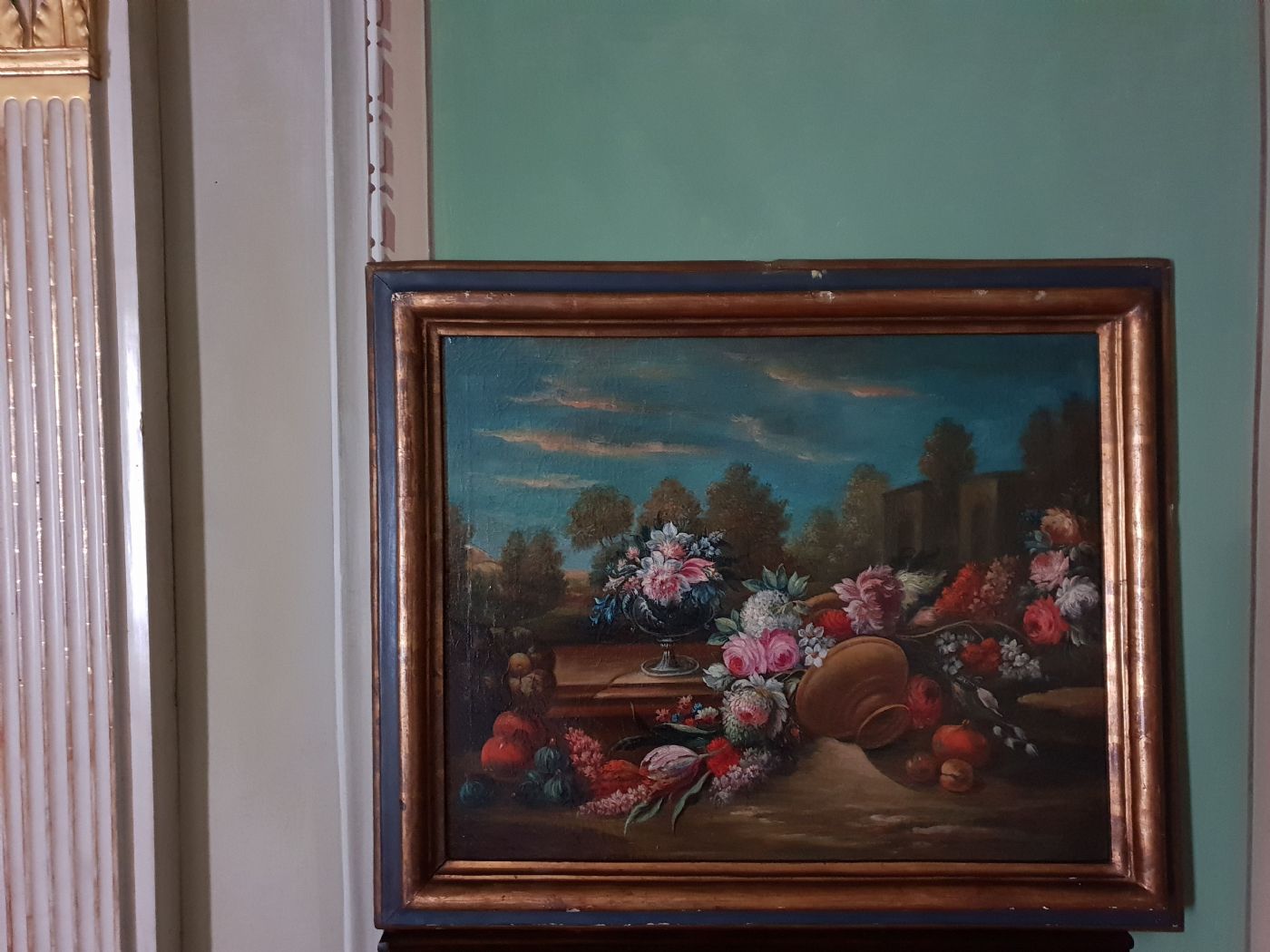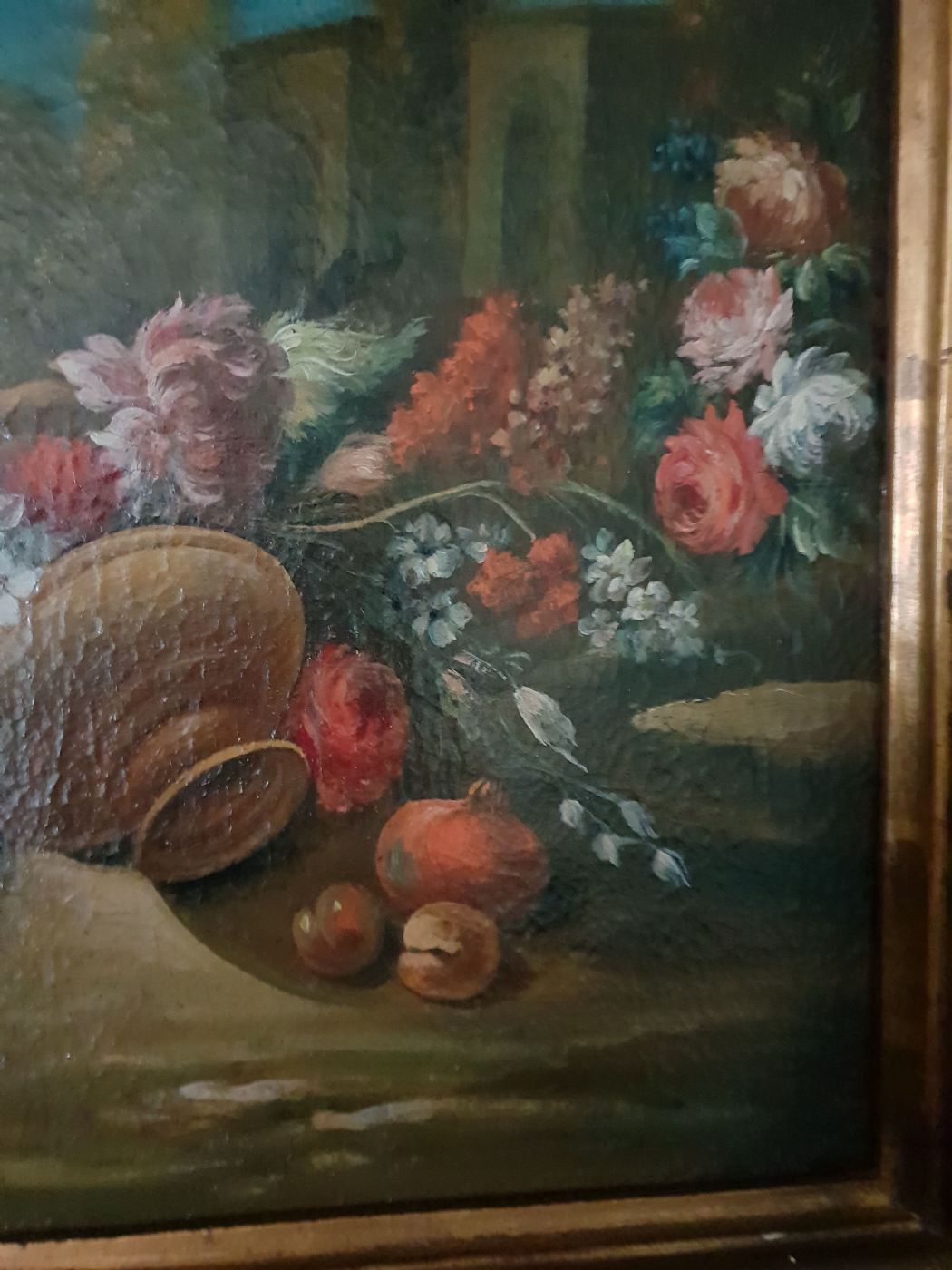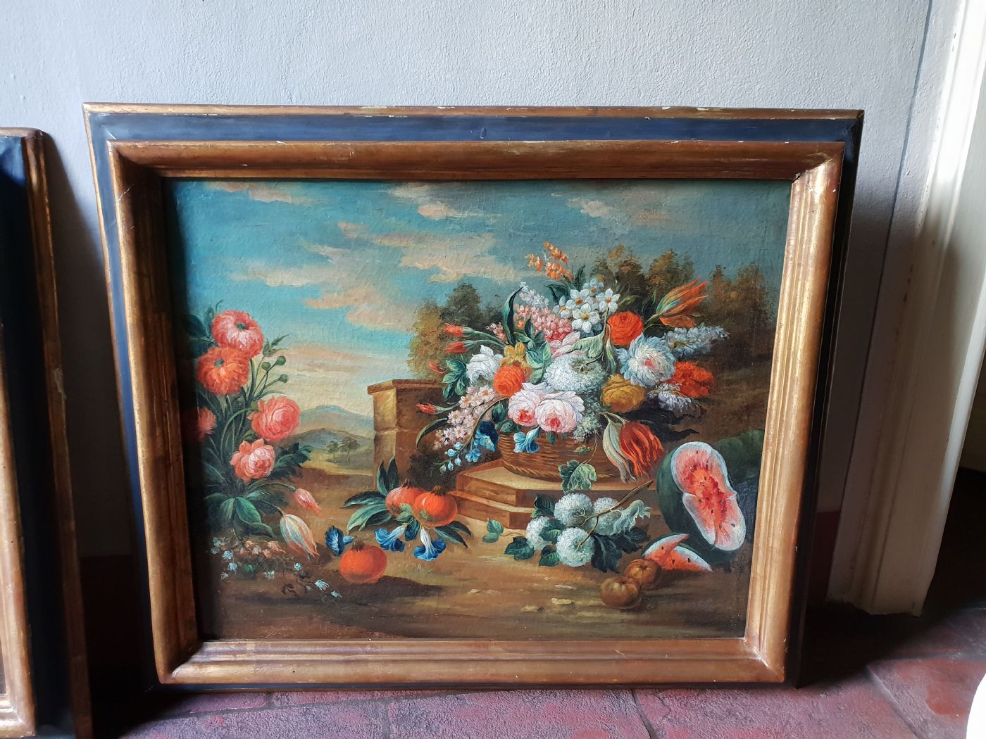Bellissima coppia Nature morte con fiori, anguria, frutta e ceramiche, corredate da cornici antiche.