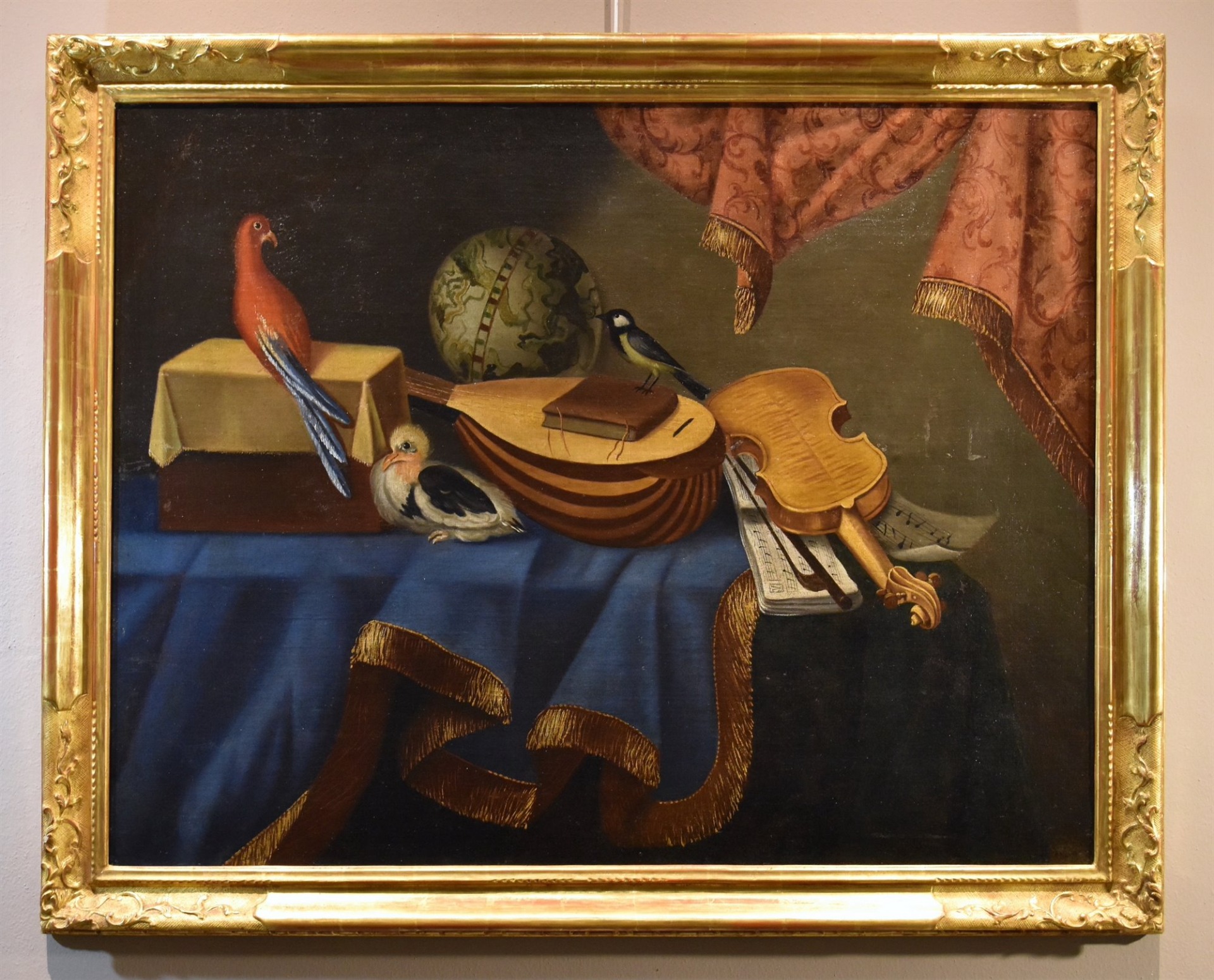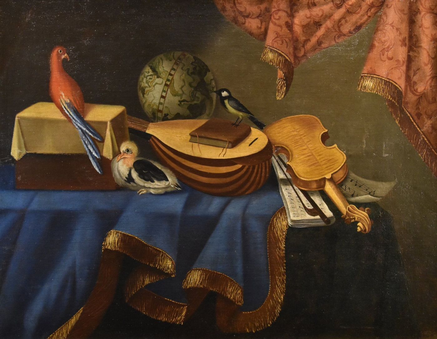 Returning to the detail of our work, and its pendant, we thus find all the elements of the Bergamo still life, with the exhibition of objects and musical instruments, such as musical scores, the violin, the lute, the viola, all arranged on a table arranged in an asymmetrical position with respect to the proportions of the canvas and accompanied by a worked carpet; in addition, other objects are identified, such as the globe, a chest, a book, and also various animals, all typical details of the Bettera workshop.