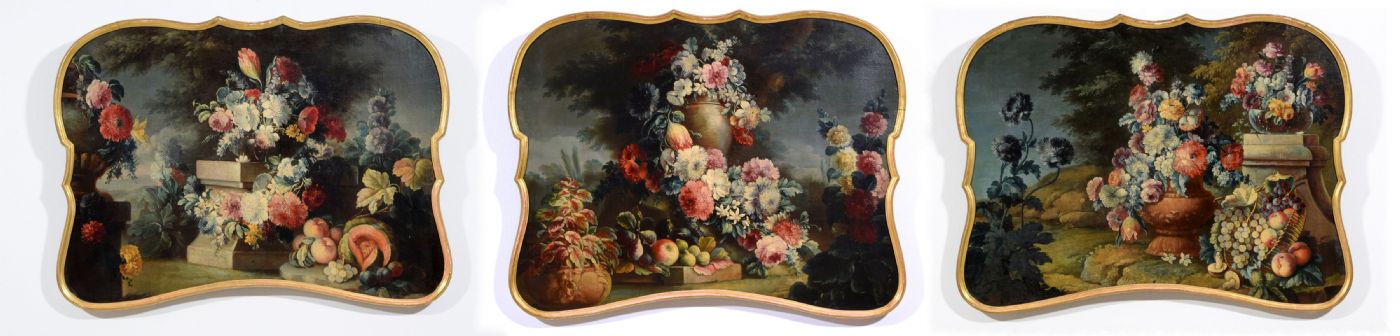The three paintings, made in oil on canvas and presented in gilded wooden frames in style, depict still lifes with triumphs of flowers and fruit. The works are attributed to the excellent 18th-century Piedmontese still life painter Michele Antonio Rapous (Turin, 1733 – 1819). The compositions are described in open spaces with tall trees that, in the background, create a backdrop and a dark background on which the vibrant colors of the flowers stand out. The floral arrangements are placed in large Baroque vases, on architectural elements and laid on the ground. The fruit, melons, grapes, peaches, plums, mushrooms, are arranged as if casually on the ground or overturned in a wicker basket. In the foreground, flowering plants in backlight help to create depth to the scene. The canvases are a characteristic example of Rapous' artistic production, well representative of his ability in compositional rendering, material and in the skillful use of a lively, saturated and balanced palette.