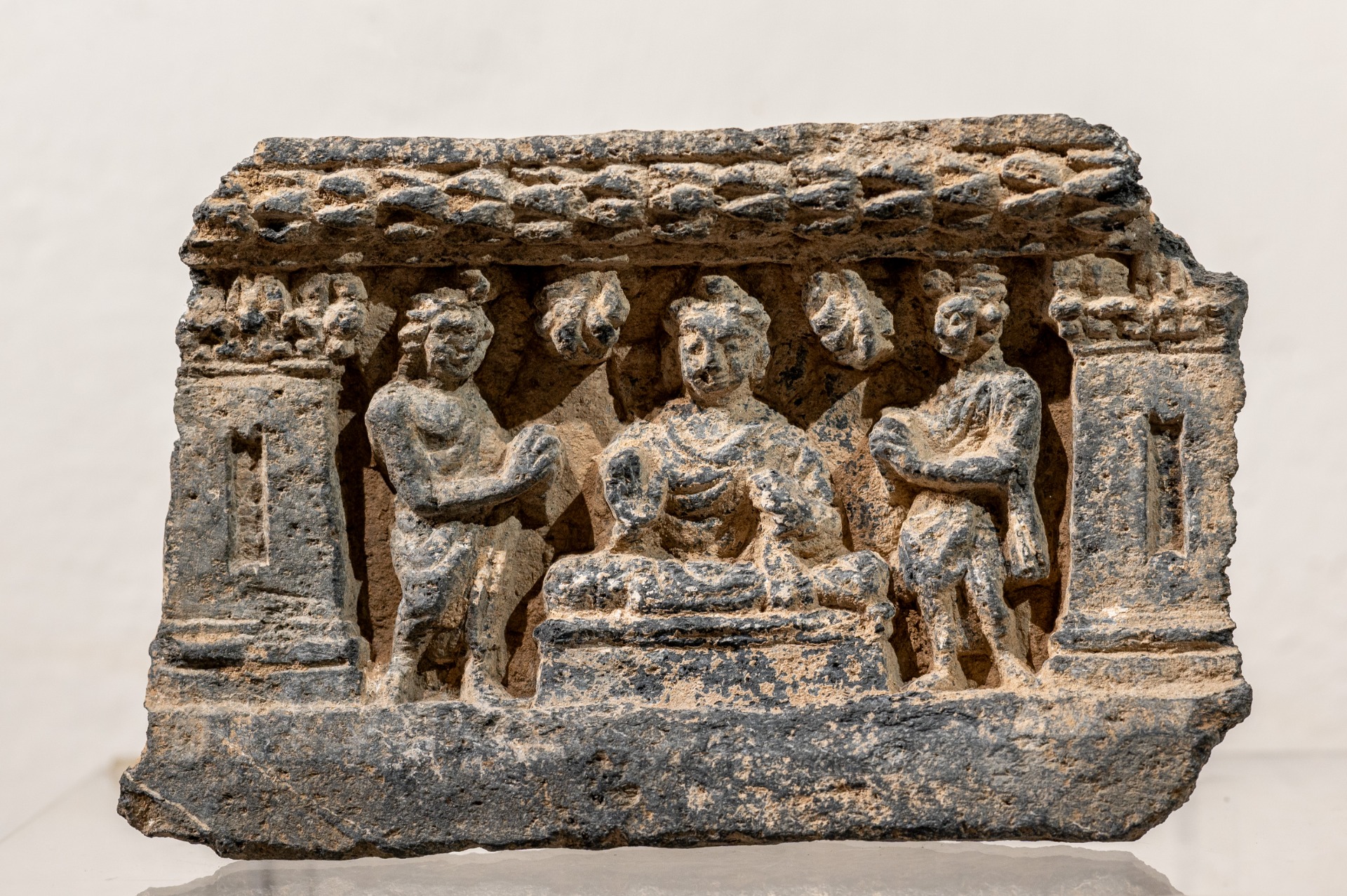 Scultura in scisto con Buddha seduto fra i devoti - Arte Gandhara - II/III secolo d.c.
