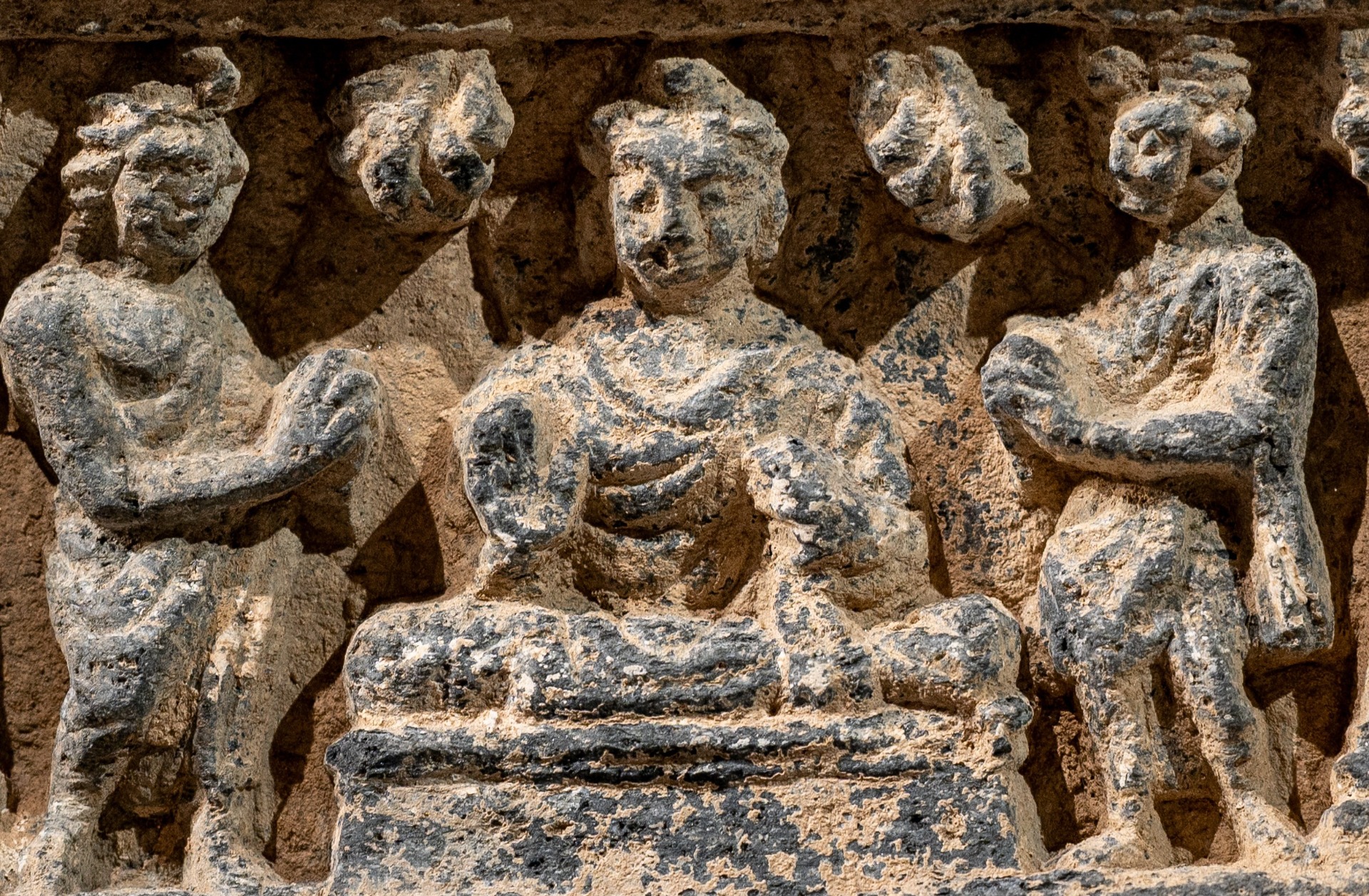 Scultura in scisto con Buddha seduto fra i devoti - Arte Gandhara - II/III secolo d.c.