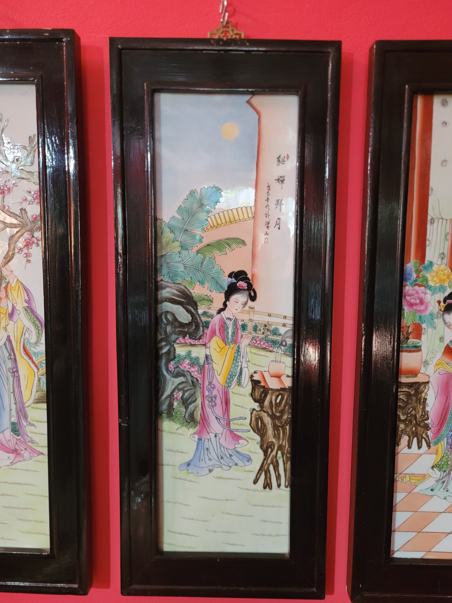 4 decorazioni su ceramica Cina Epoca '900 cornice legno ebanizzato