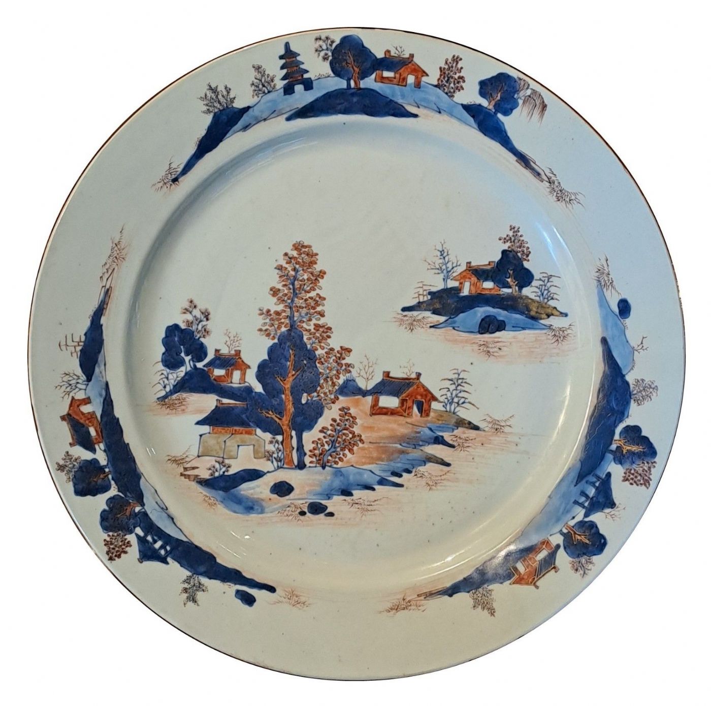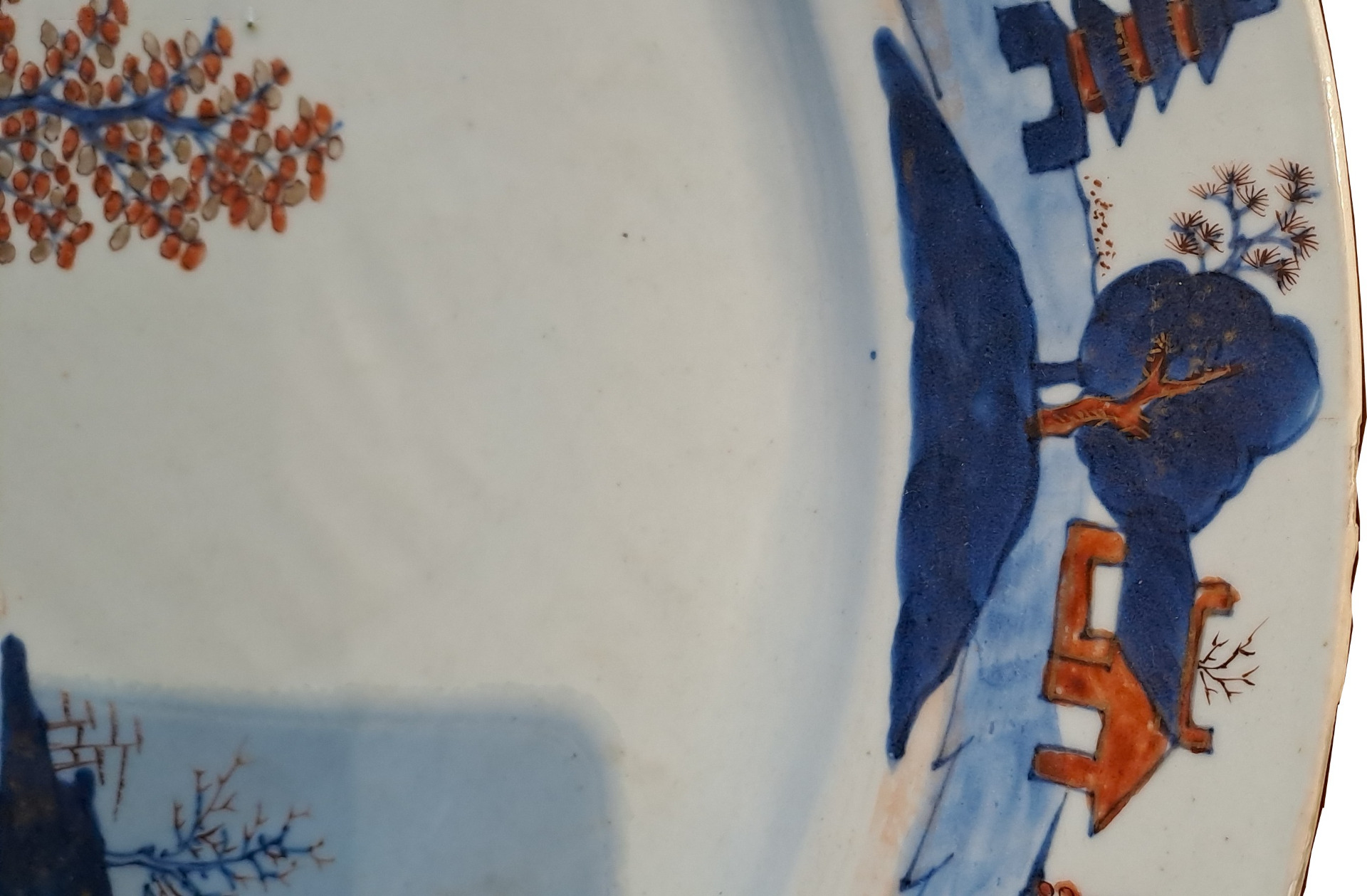 Stile decorativo: La decorazione del piatto si presenta con un vivace e complesso stile che combina il classico blu cobalto con smalti soprasmalto arancioni (rosso ferro) e dorature, a volte descritto come "Imari cinese".