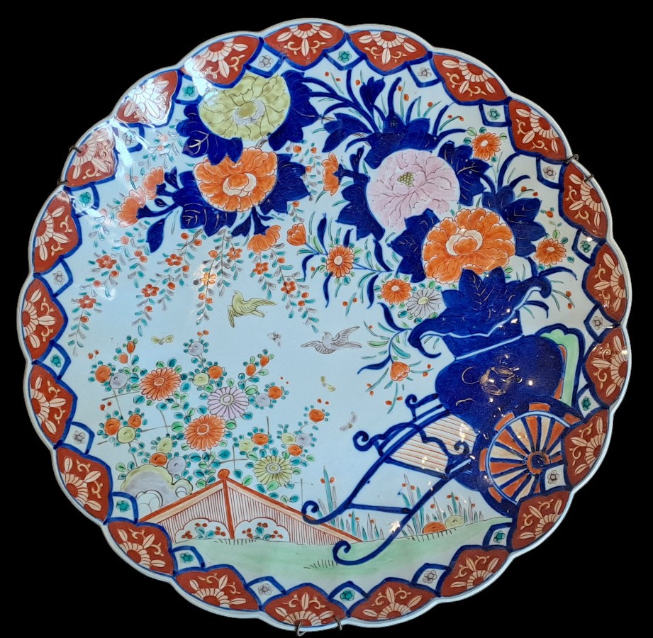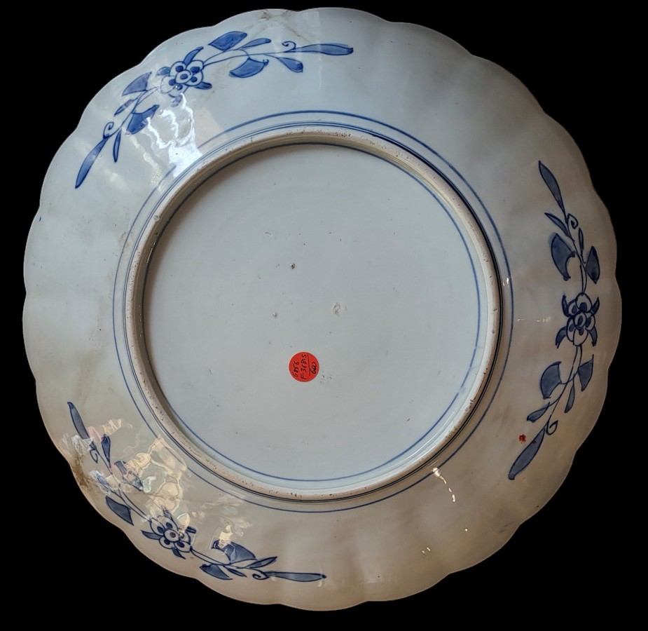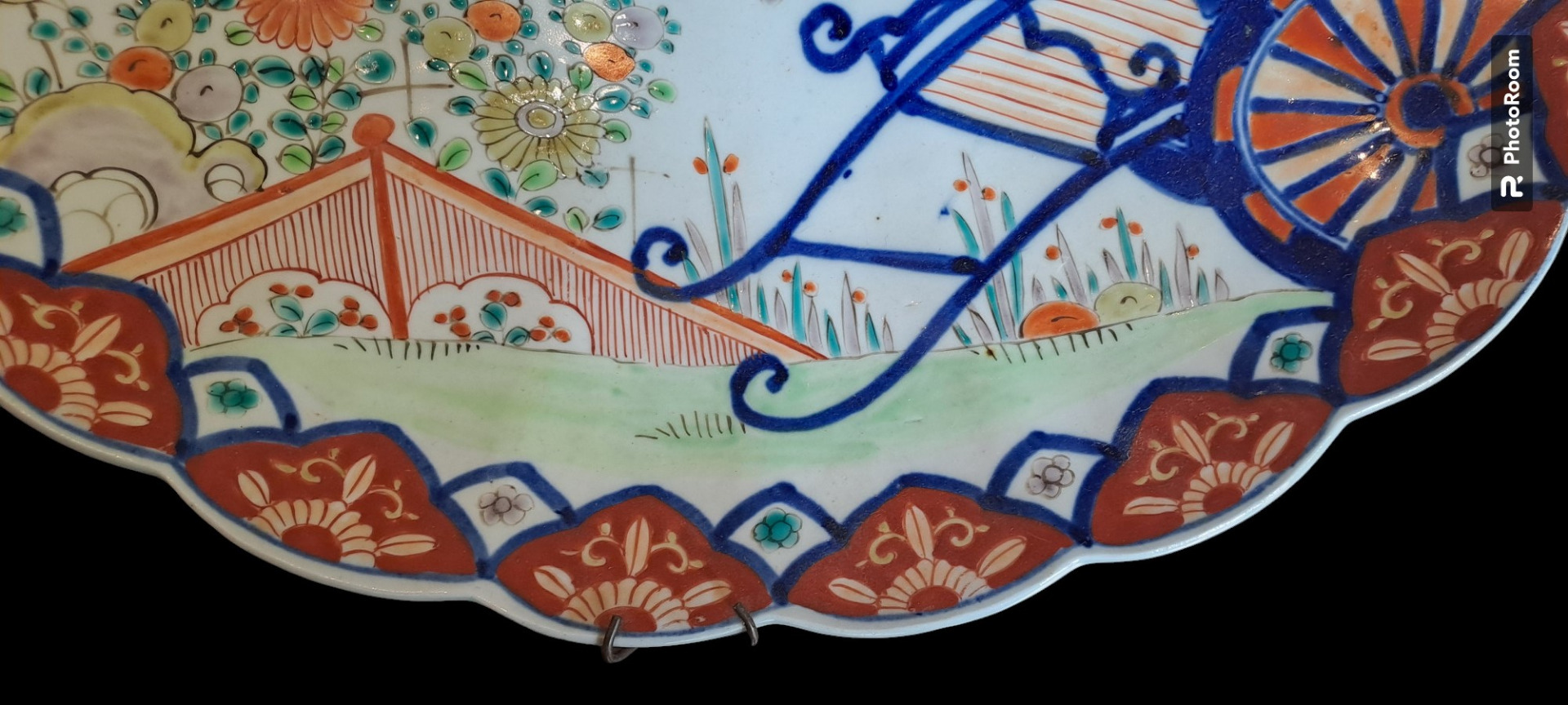 Large porcelain plate painted in underglaze cobalt blue, overglaze brick red and gold. Scalloped edge and decorations also on the back. Excellent condition. Japan, Imari manufacture, Meiji period (1868 - 1912). The diameter is 40 cm. A regular certificate of authenticity with photo is issued. We guarantee a response to your emails within 24 hours. REGISTERED IN THE REGISTER OF EXPERTS AND CTU AT THE COURT OF LA SPEZIA