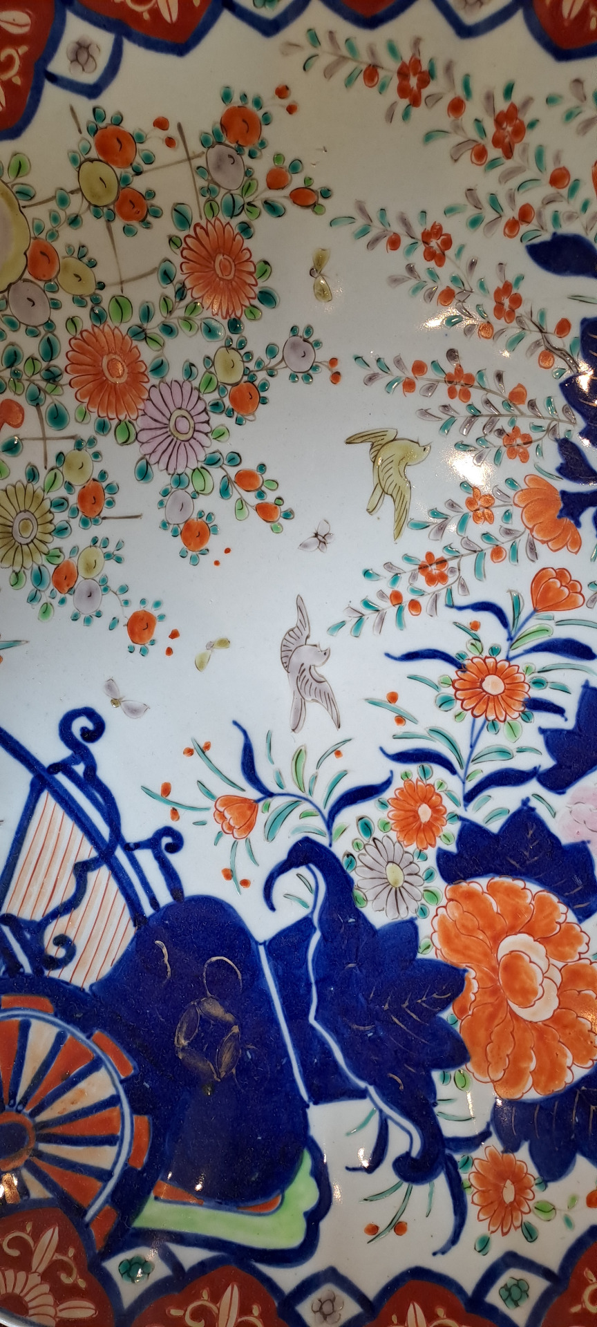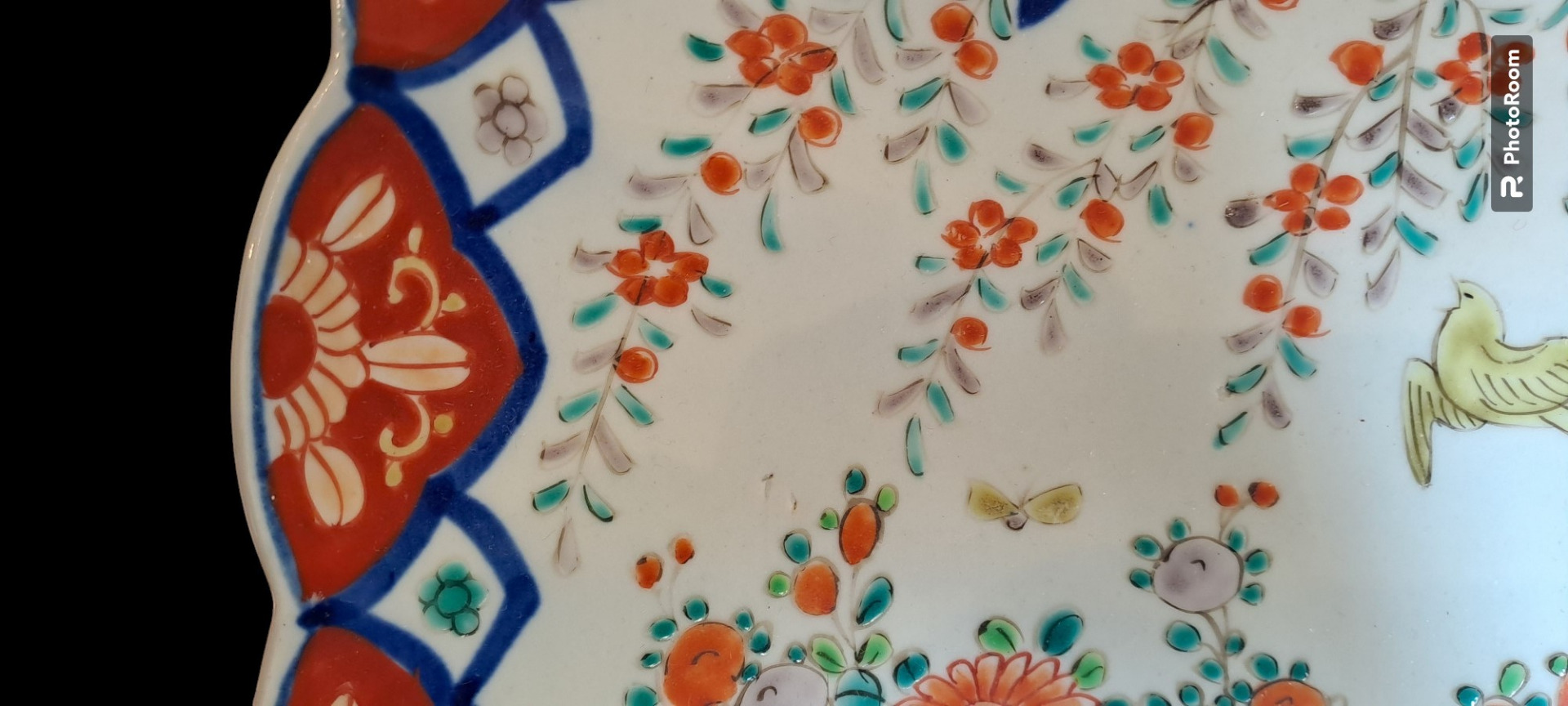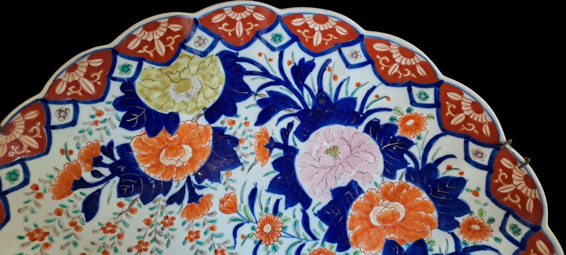 Large porcelain plate painted in underglaze cobalt blue, overglaze brick red and gold. Scalloped edge and decorations also on the back. Excellent condition. Japan, Imari manufacture, Meiji period (1868 - 1912). The diameter is 40 cm. A regular certificate of authenticity with photo is issued. We guarantee a response to your emails within 24 hours. REGISTERED IN THE REGISTER OF EXPERTS AND CTU AT THE COURT OF LA SPEZIA