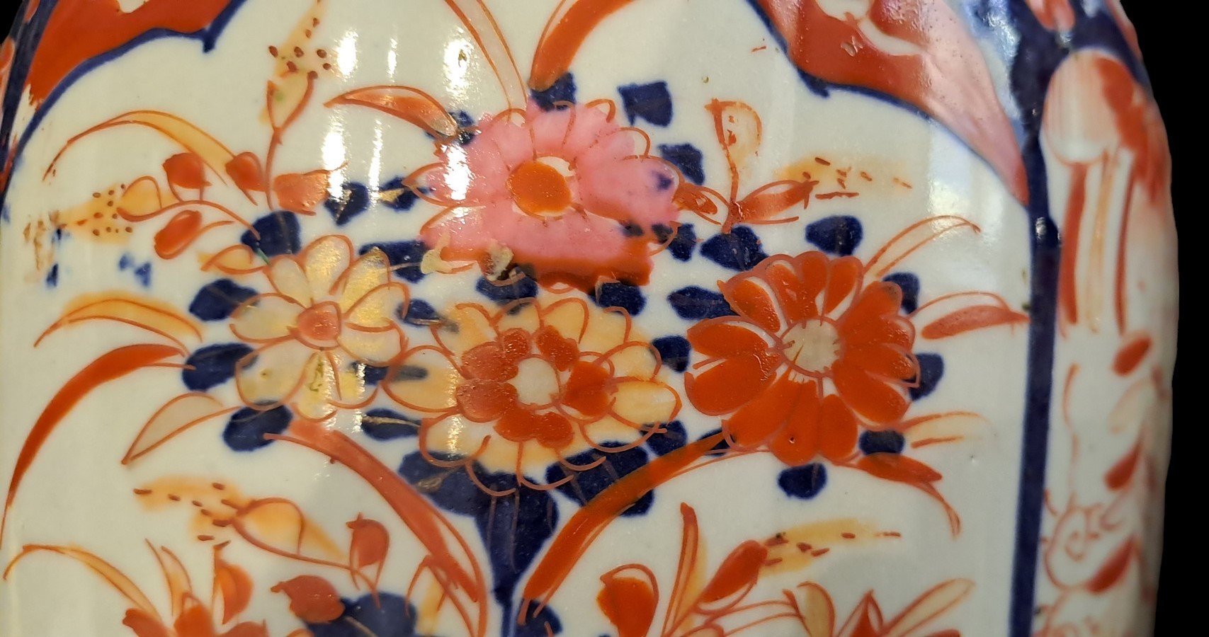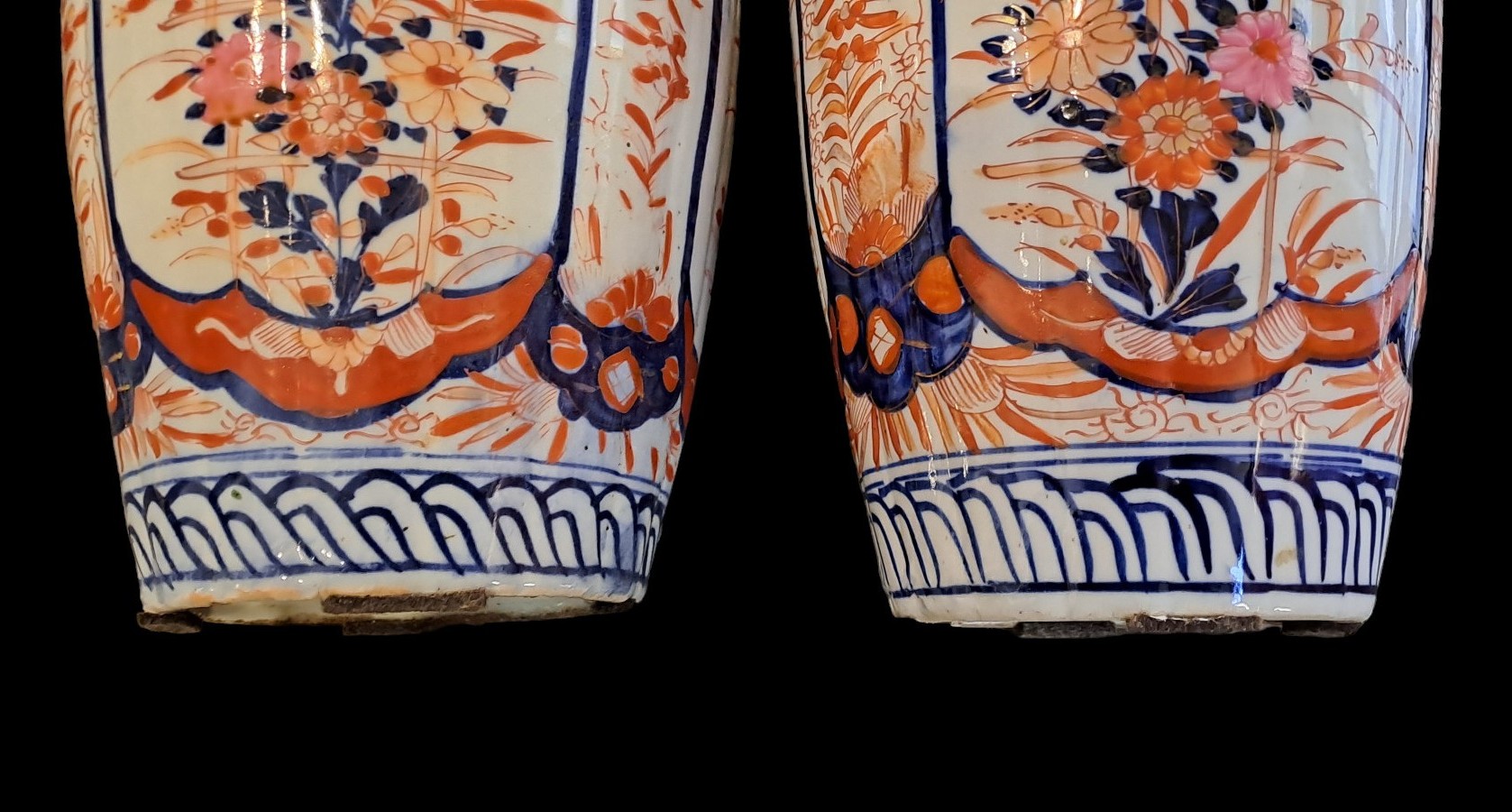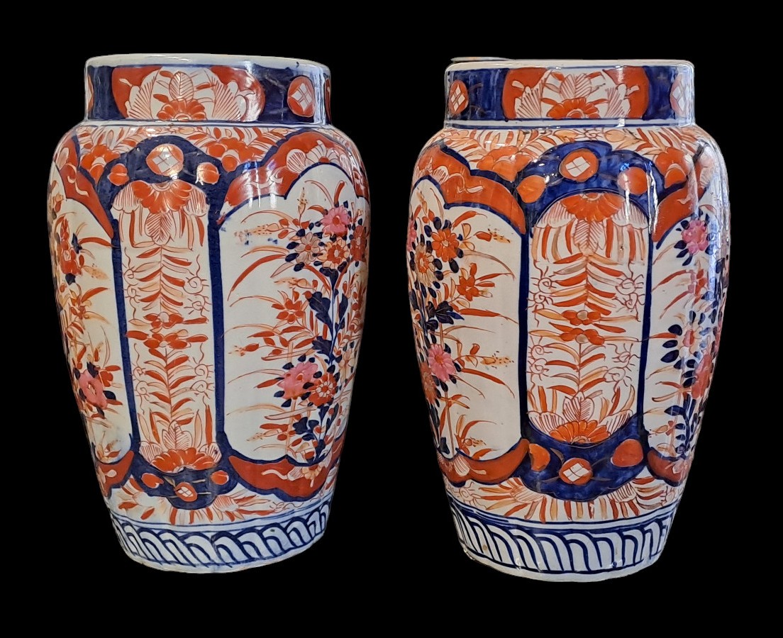 Pair of porcelain vases painted with floral subjects in underglaze cobalt blue, brick, and overglaze gold. Circular body with slight ribbing and straight mouth. Japan, Imari manufacture from the second half of the 19th century. Meiji Period (1868 - 1912). Perfect condition. The dimensions are: height 25 width 14. A regular certificate of authenticity with photos will be issued. We guarantee a response to your emails within 24 hours. REGISTERED IN THE REGISTER OF EXPERTS AND CTU AT THE COURT OF LA SPEZIA.