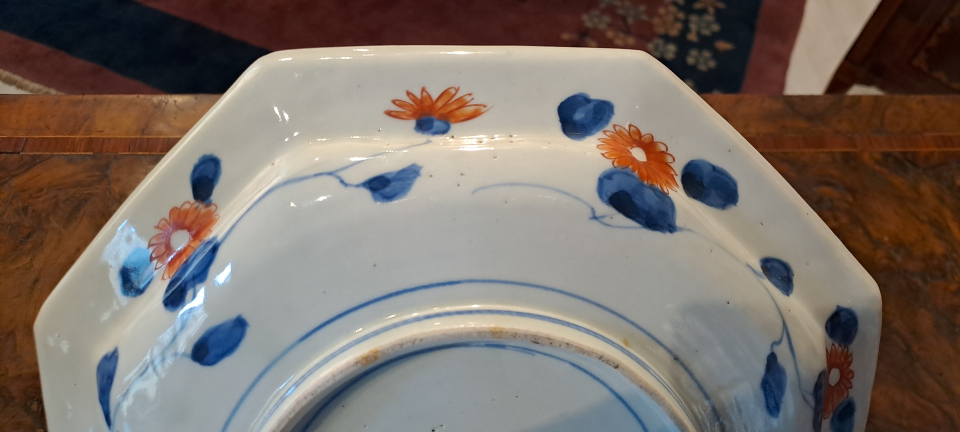Questo piatto in porcellana Imari è un autentico pezzo da collezione risalente al periodo Edo, rinomato per l'eccellenza e la raffinatezza della sua produzione ceramica. La sua forma ottagonale lo distingue, insieme alla ricchezza del suo decoro policromo, che combina la classica pittura in blu cobalto sottosmalto con smalti in rilievo di colore rosso ferro, arancione e oro.