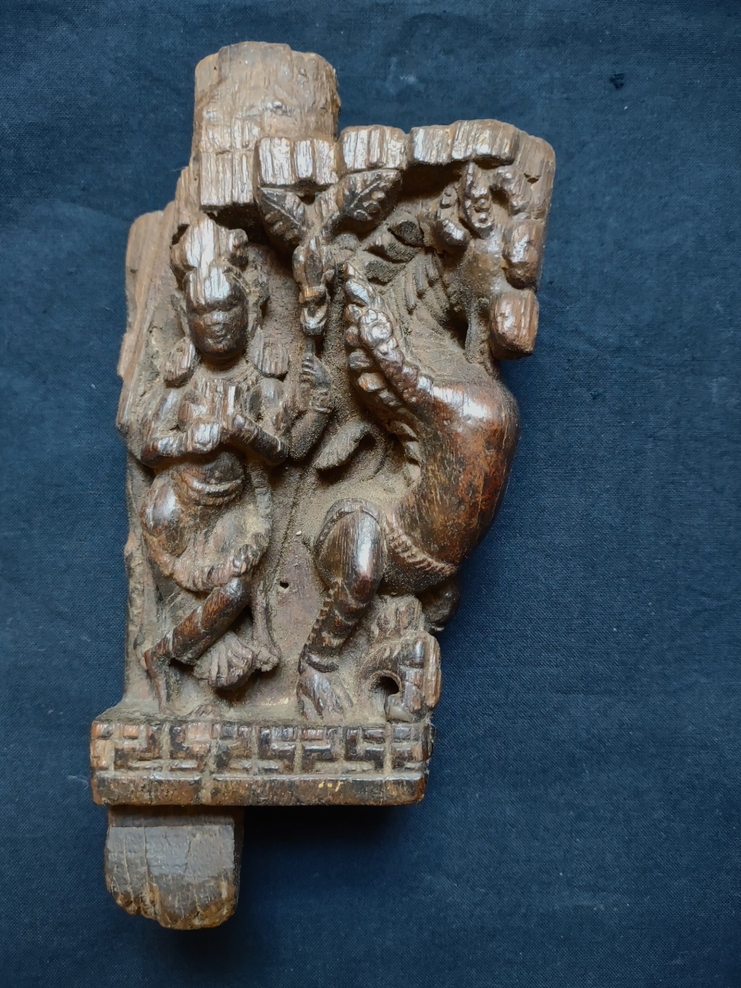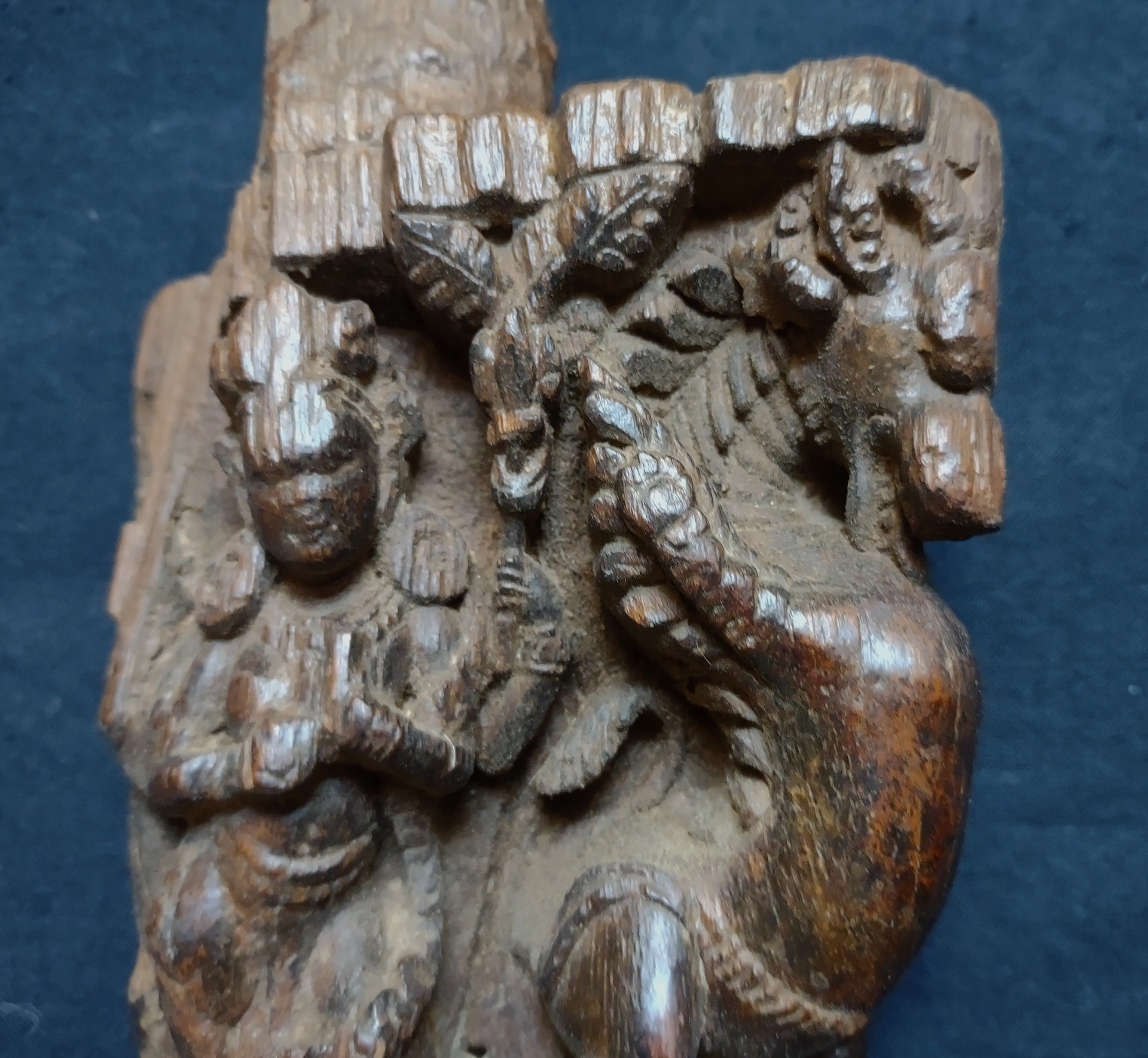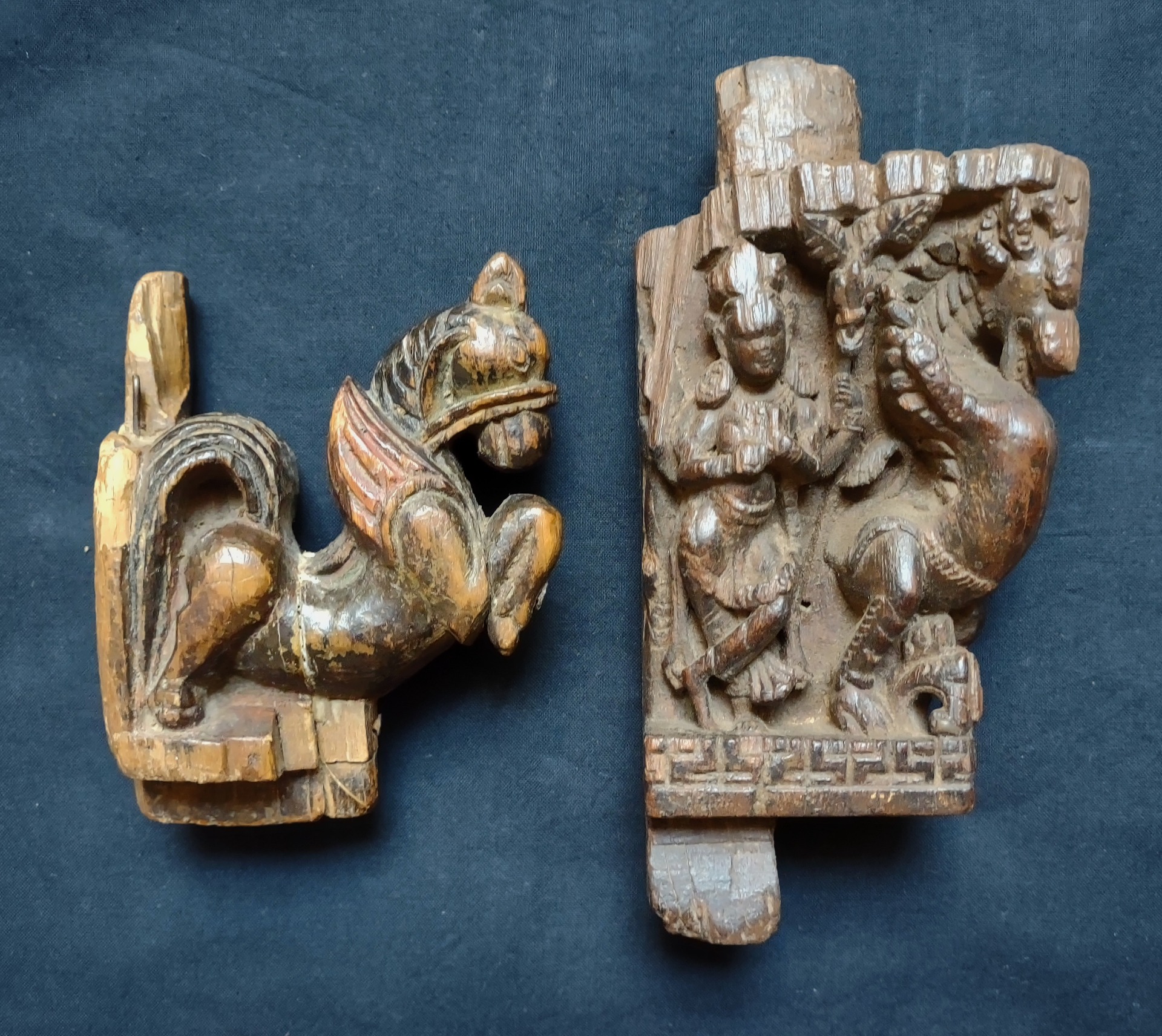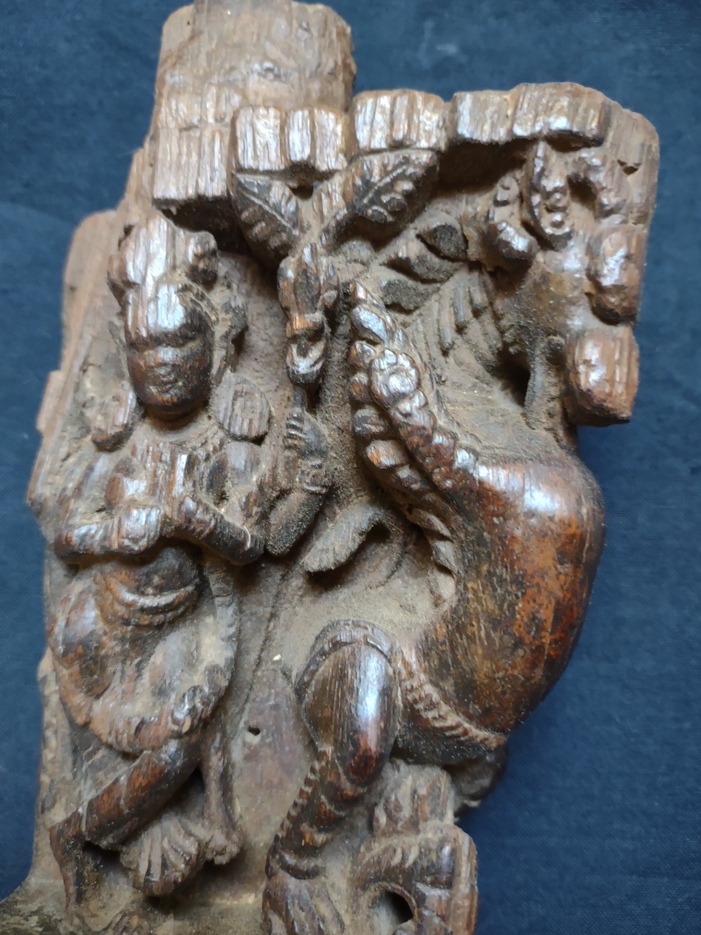 Pair of high-quality Indian wooden friezes. The first depicts a winged horse and is a fragment of a ratha (chariots used for religious ceremonies), the second, slightly larger with sacred images, could be part of the decoration of a temple or also of a chariot. The frieze with the image of the horse measures 11.5*9, the other 18*9