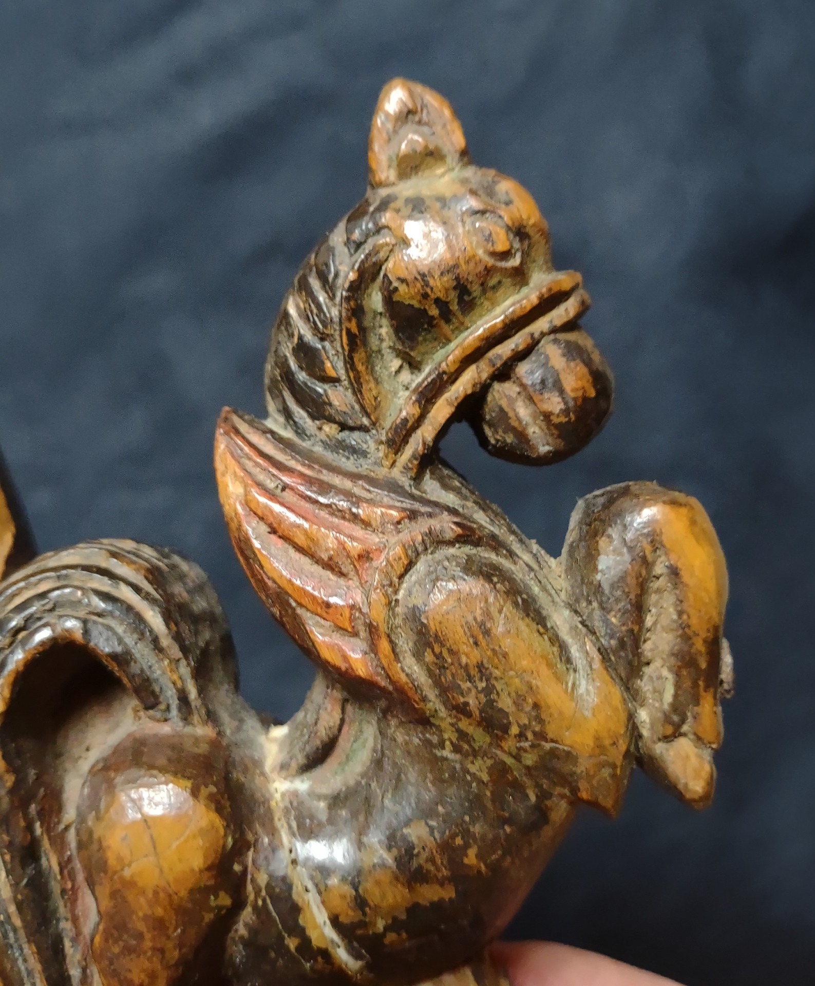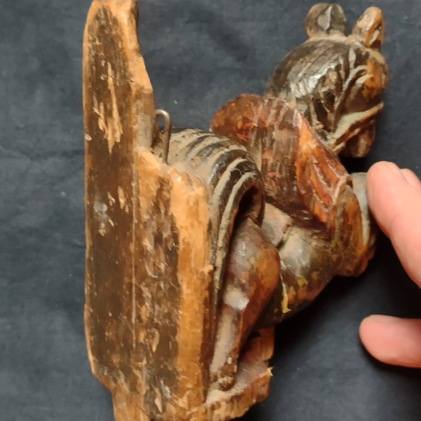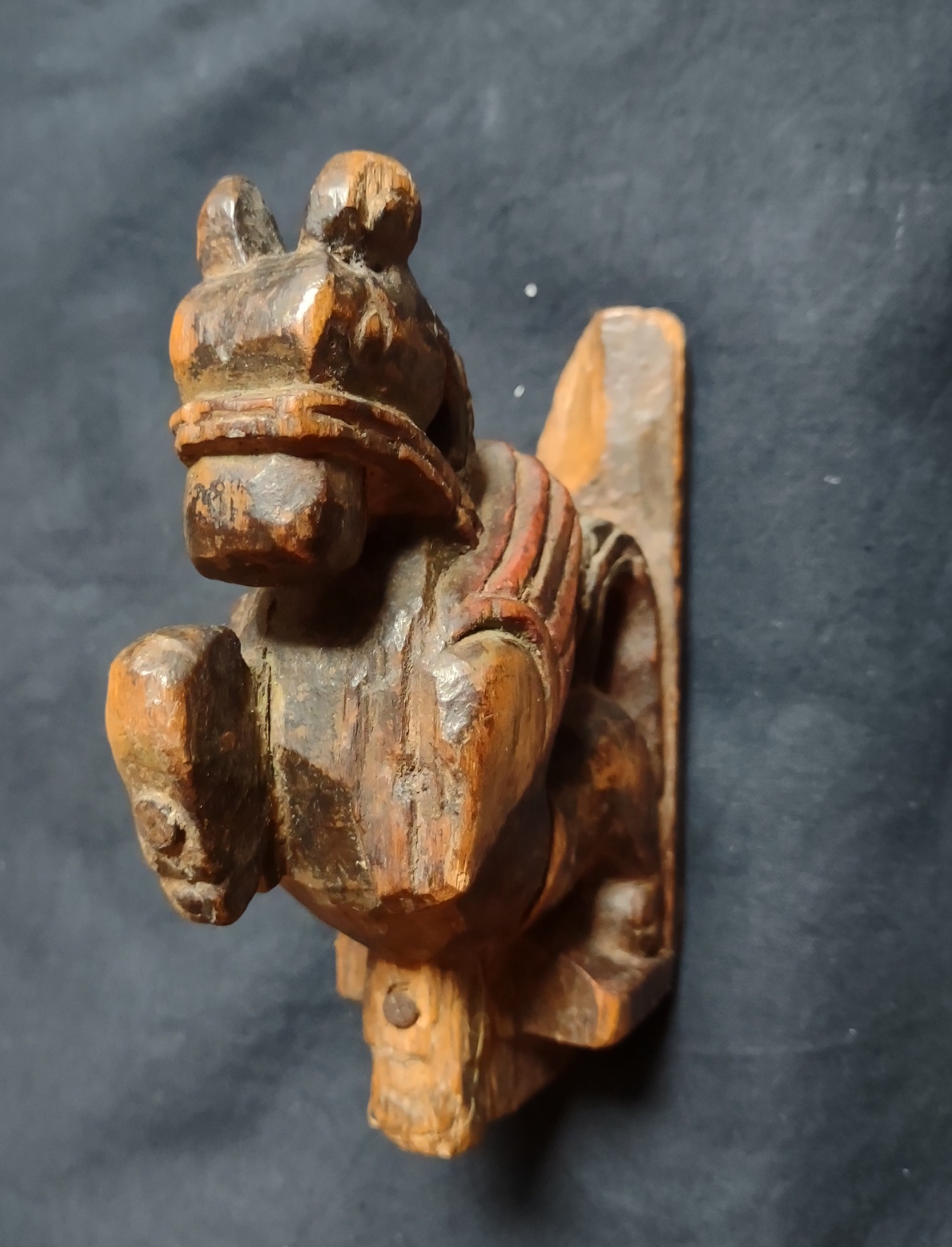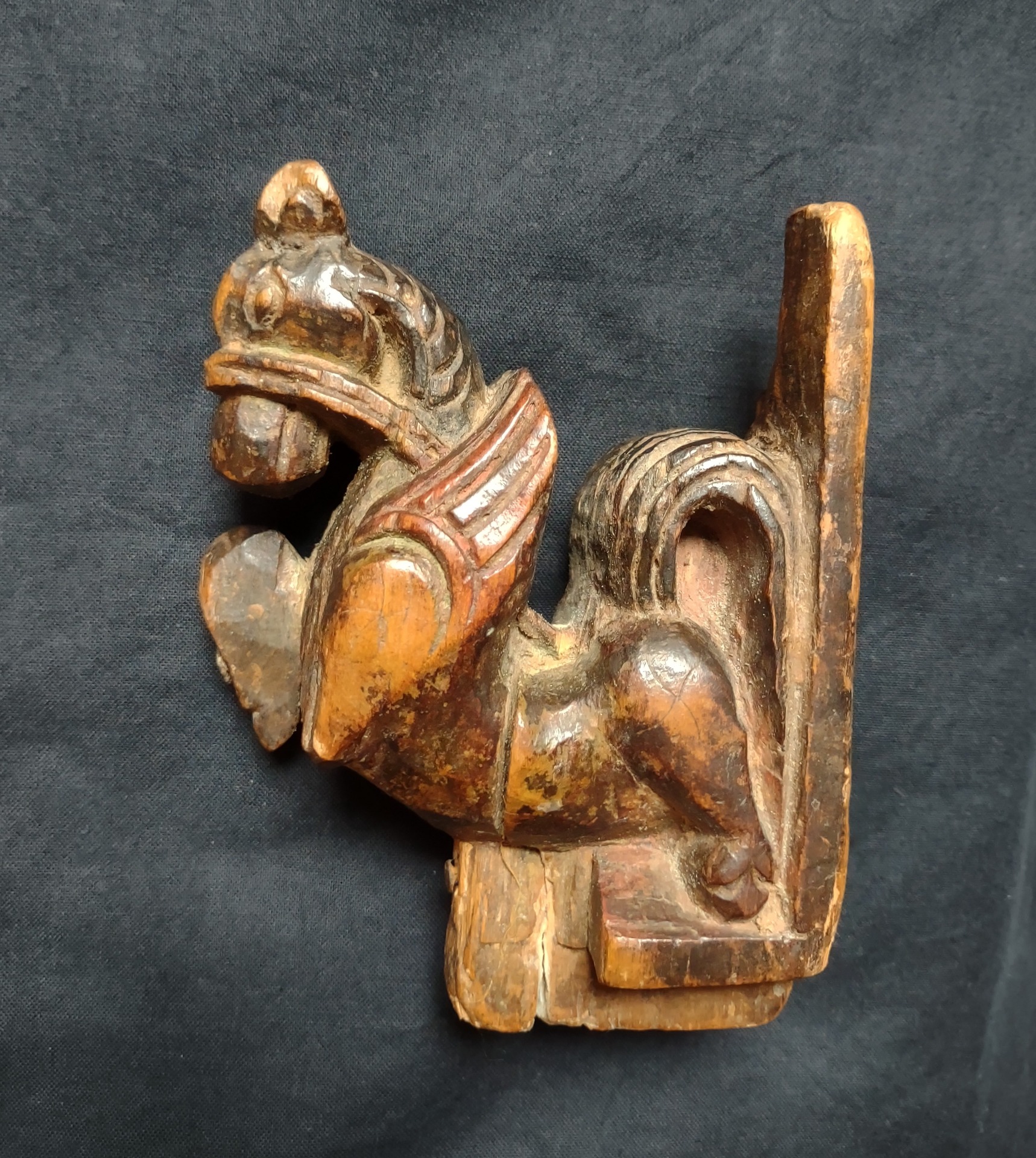Pair of high-quality Indian wooden friezes. The first depicts a winged horse and is a fragment of a ratha (chariots used for religious ceremonies), the second, slightly larger with sacred images, could be part of the decoration of a temple or also of a chariot. The frieze with the image of the horse measures 11.5*9, the other 18*9
