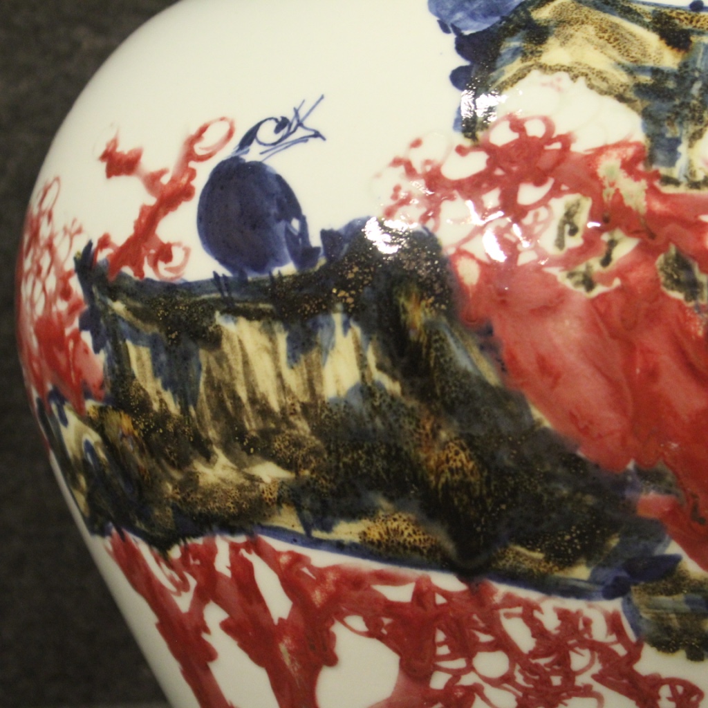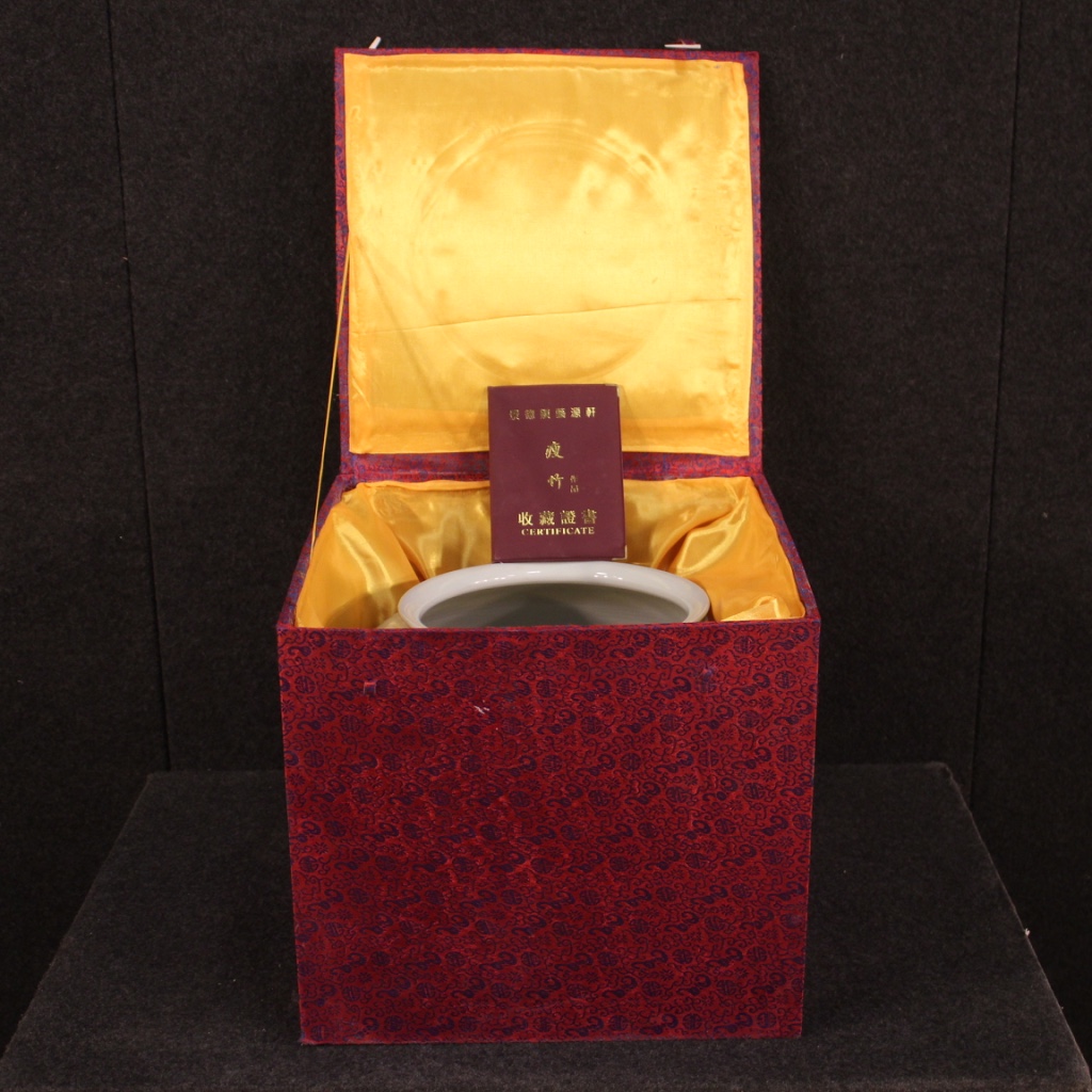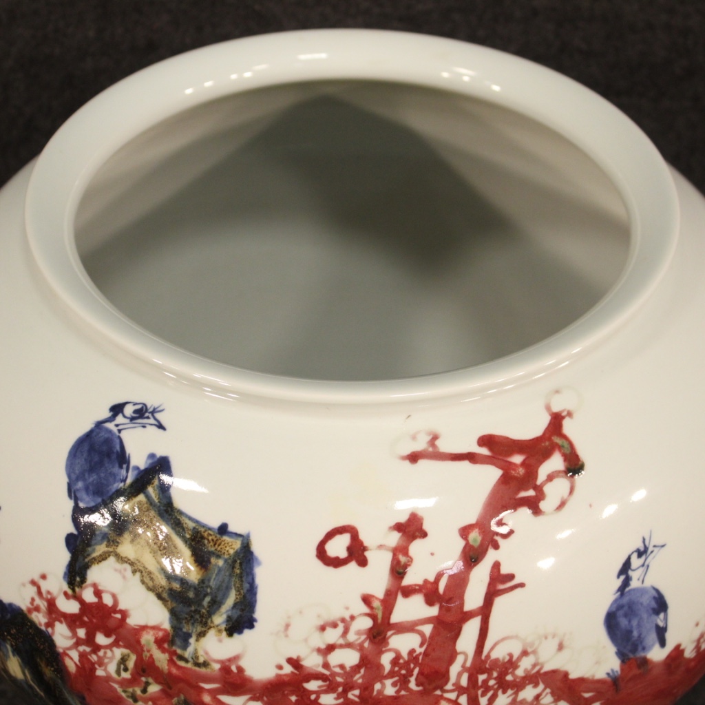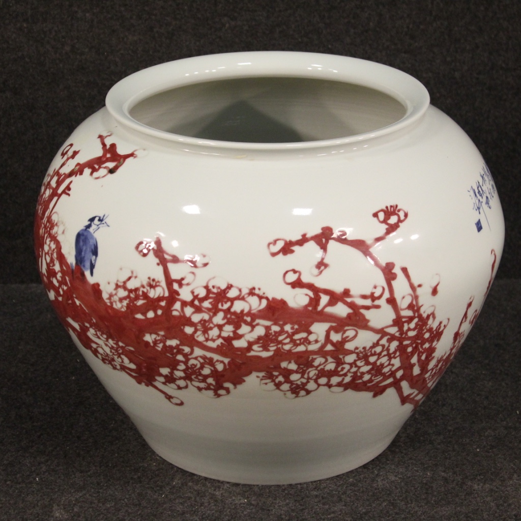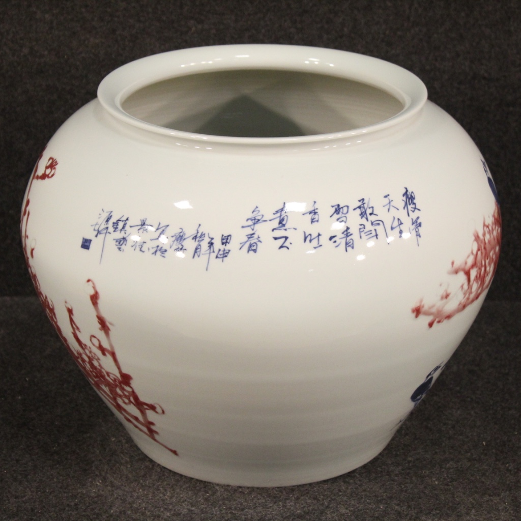 Chinese vase from the beginning of the 21st century. Work in glazed and hand painted ceramic with floral and animal decorations. Vase of excellent proportion with a top opening of 23 cm in diameter, ideal for different types of flowers or simply to be displayed as a furnishing accessory. Vase complete with original packaging and certificate of authenticity (in English and Chinese) of Jingdezhen porcelain. It presents some Chinese writing on one side in the upper part (see photo), in good condition, without breaks or chips.