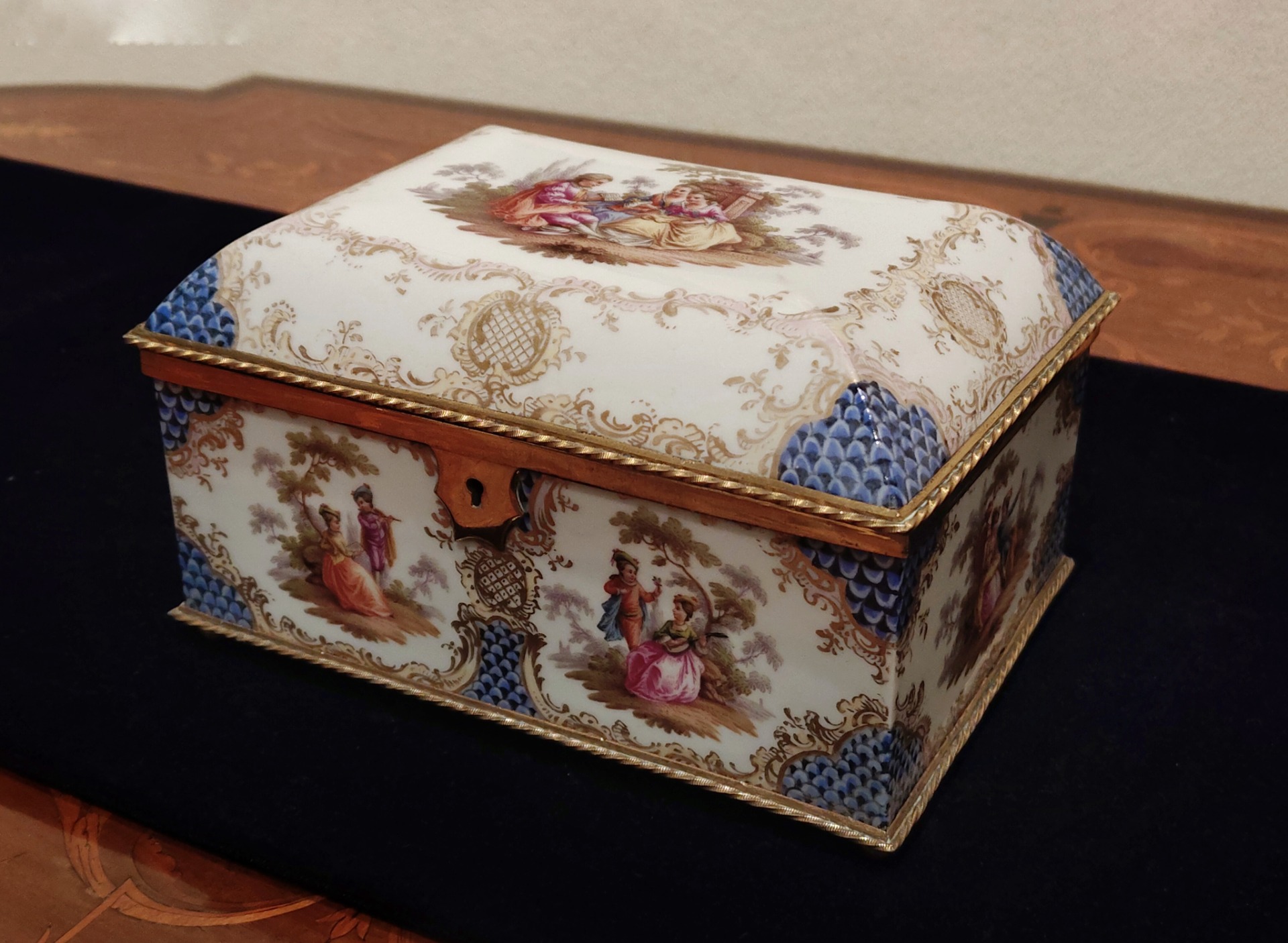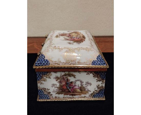 Cofanetto rettangolare in porcellana a forma di scrigno, il corpo è decorato su tutti i lati con scene galanti, montatura in metallo dorato chiavetta originale