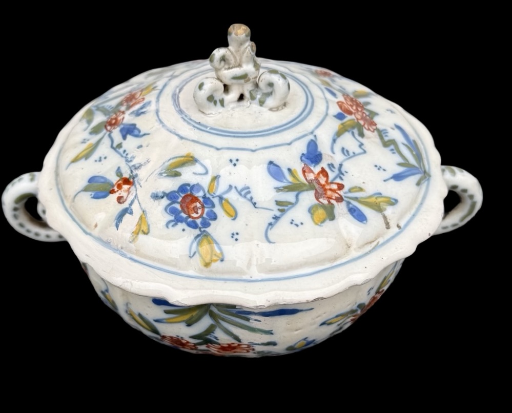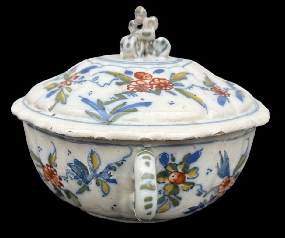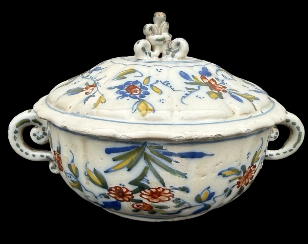 Maiolica childbirth cup with stylized floral decoration and a pair of 'curl' handles. Manufacture by Antonio Maria Coppellotti. Lodi. cm 17x13x13.