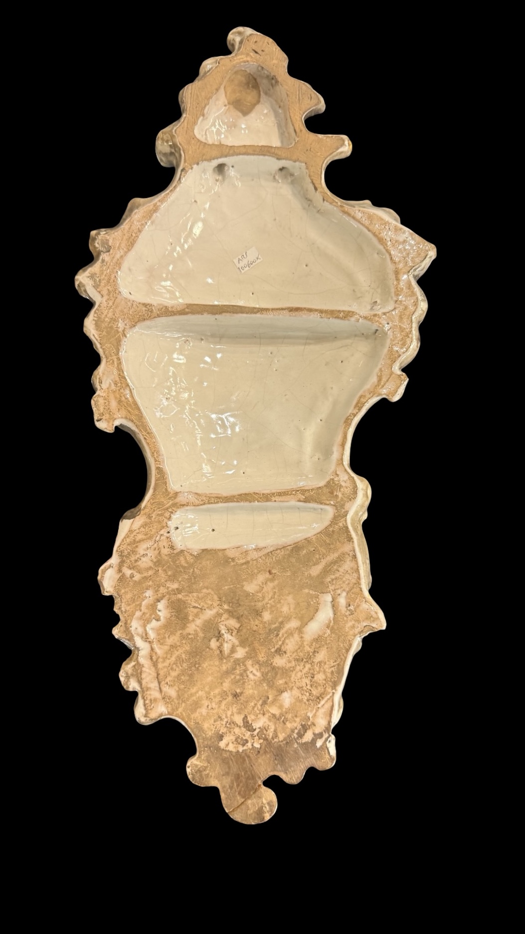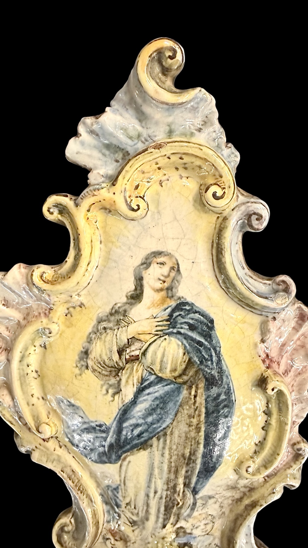 Polychrome majolica holy water font with a rocaille border and a painted depiction of the Madonna. Minghetti Manufactory. Bologna. Cm 38x17