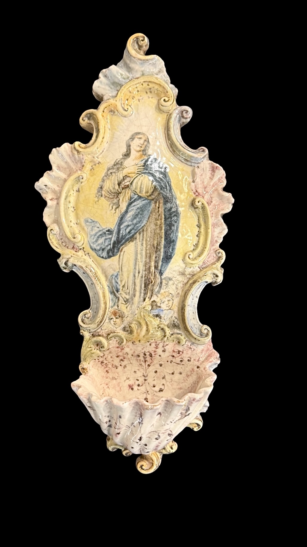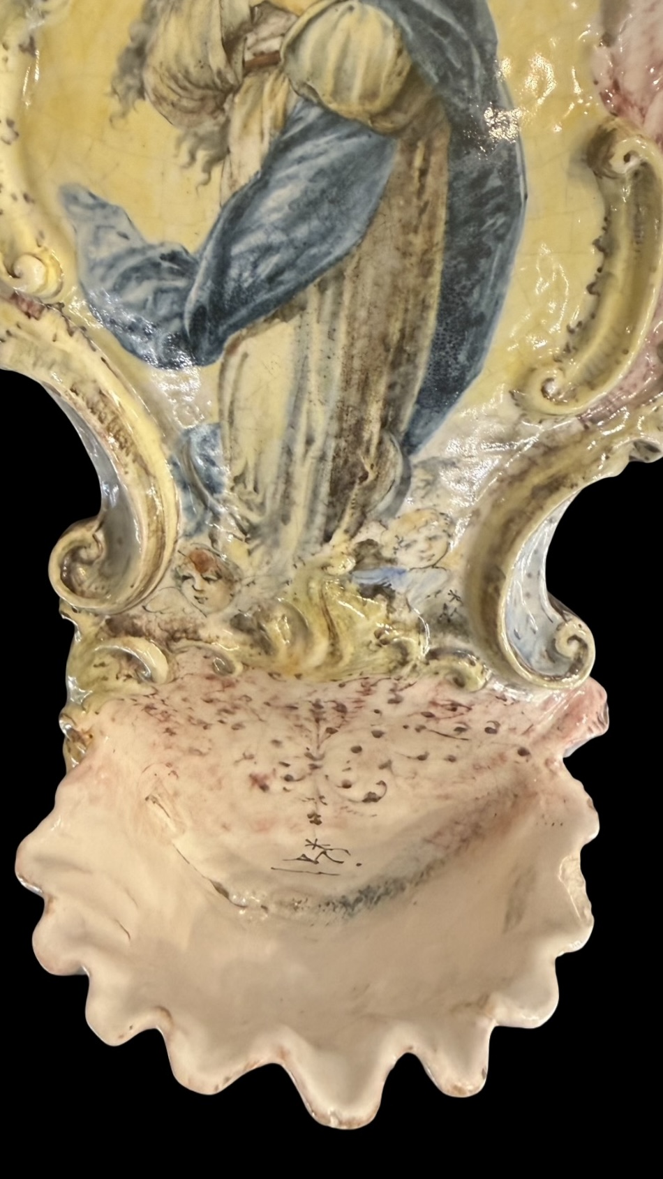 Polychrome majolica holy water font with a depiction of the Madonna. Minghetti. Bologna.
