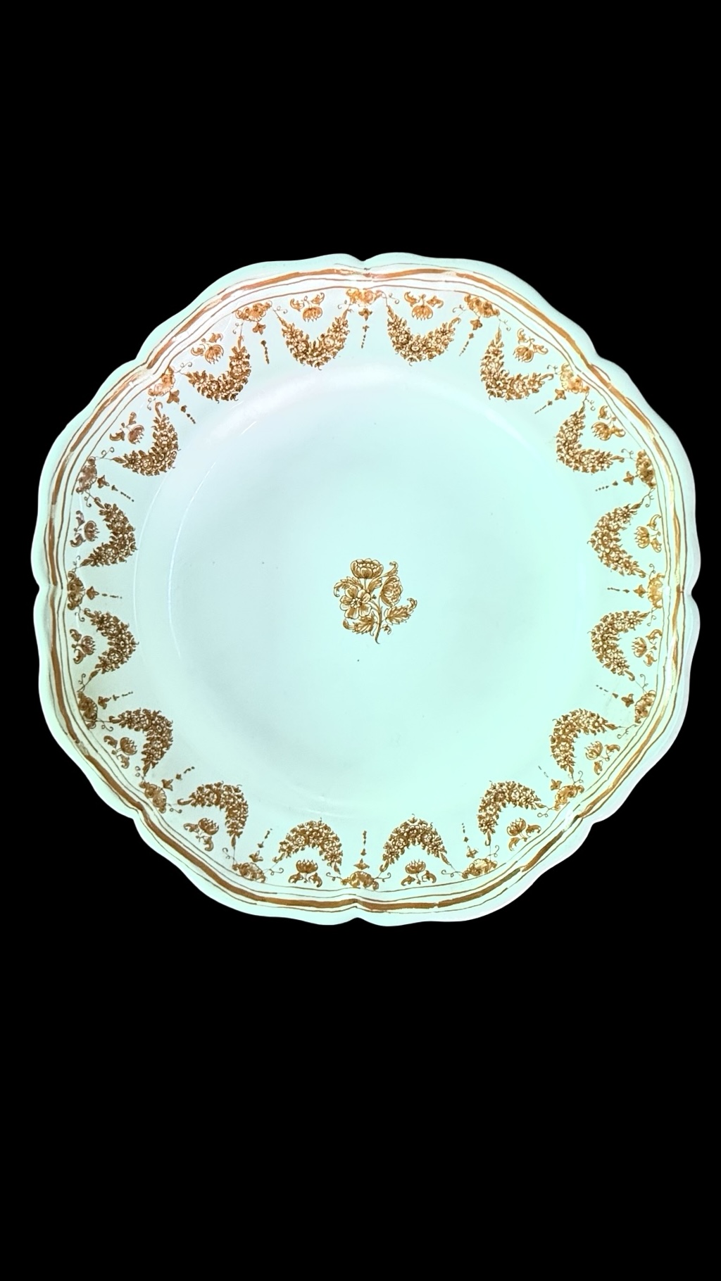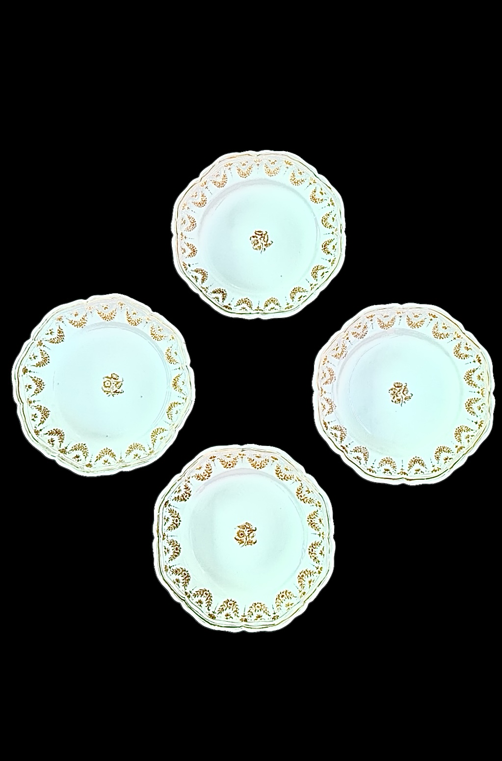 Four majolica plates decorated with floral motifs and festoons in monochrome ochre. Moustiers, France. Signature Jean Etienne Baron. Olerys and Laugier manufactory. Cm 25.5.