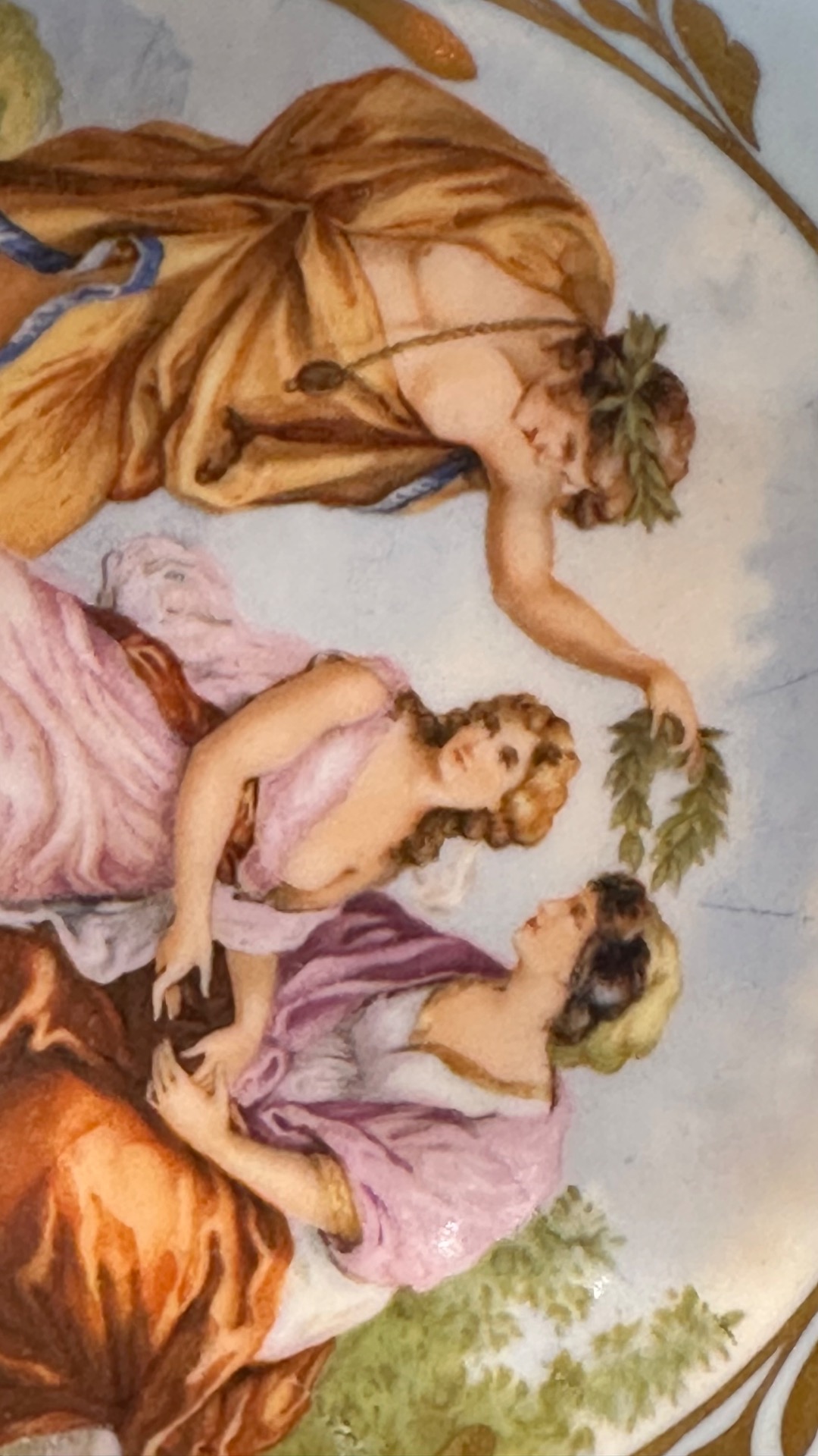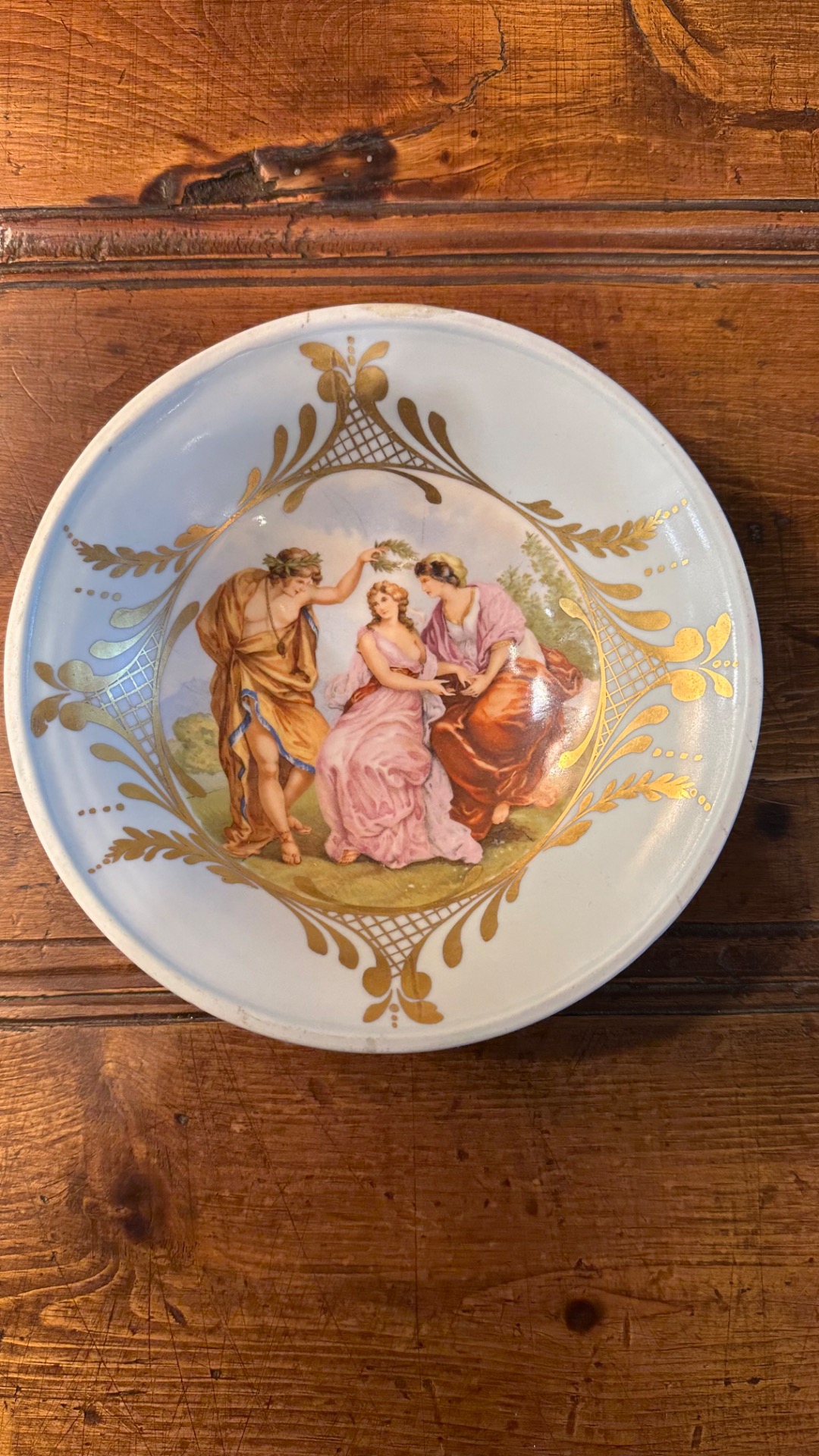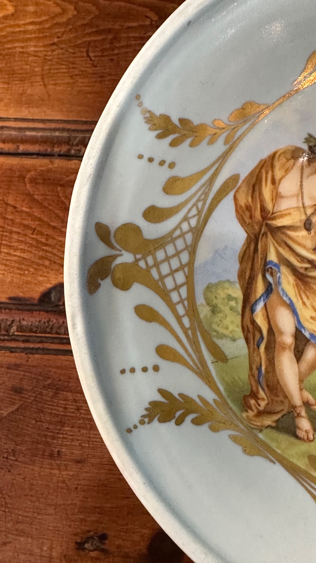 The central scene, executed with great chromatic delicacy, reflects the pictorial style typical of late 19th-century European manufactures, inspired by the neoclassical and romantic taste. The edge features light blue nuances that harmoniously frame the main decoration.
