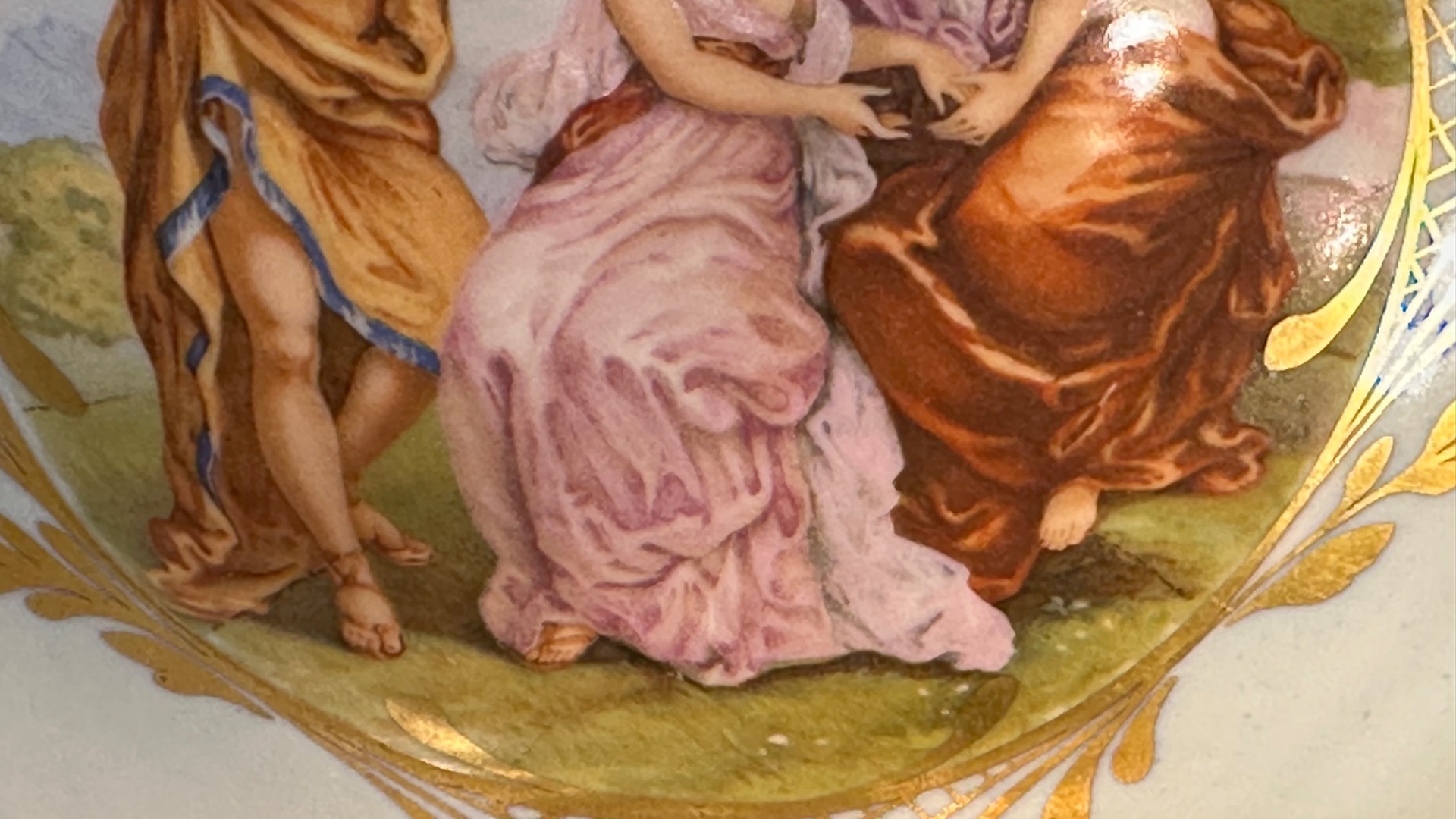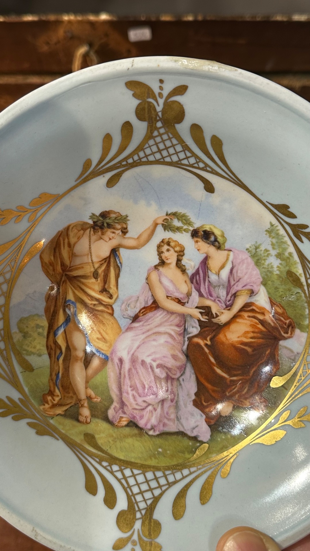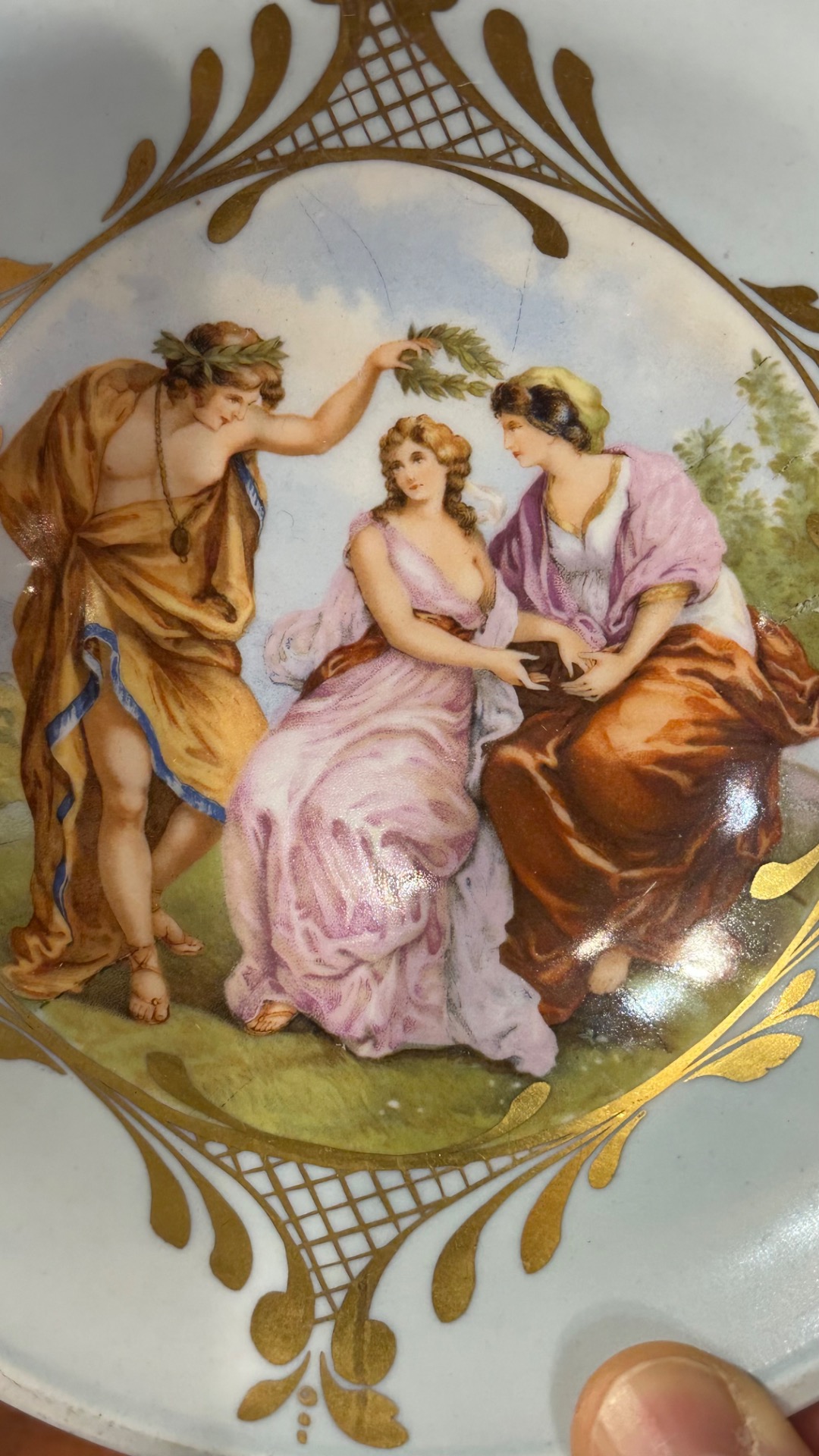 The central scene, executed with great chromatic delicacy, reflects the pictorial style typical of late 19th-century European manufactures, inspired by the neoclassical and romantic taste. The edge features light blue nuances that harmoniously frame the main decoration.