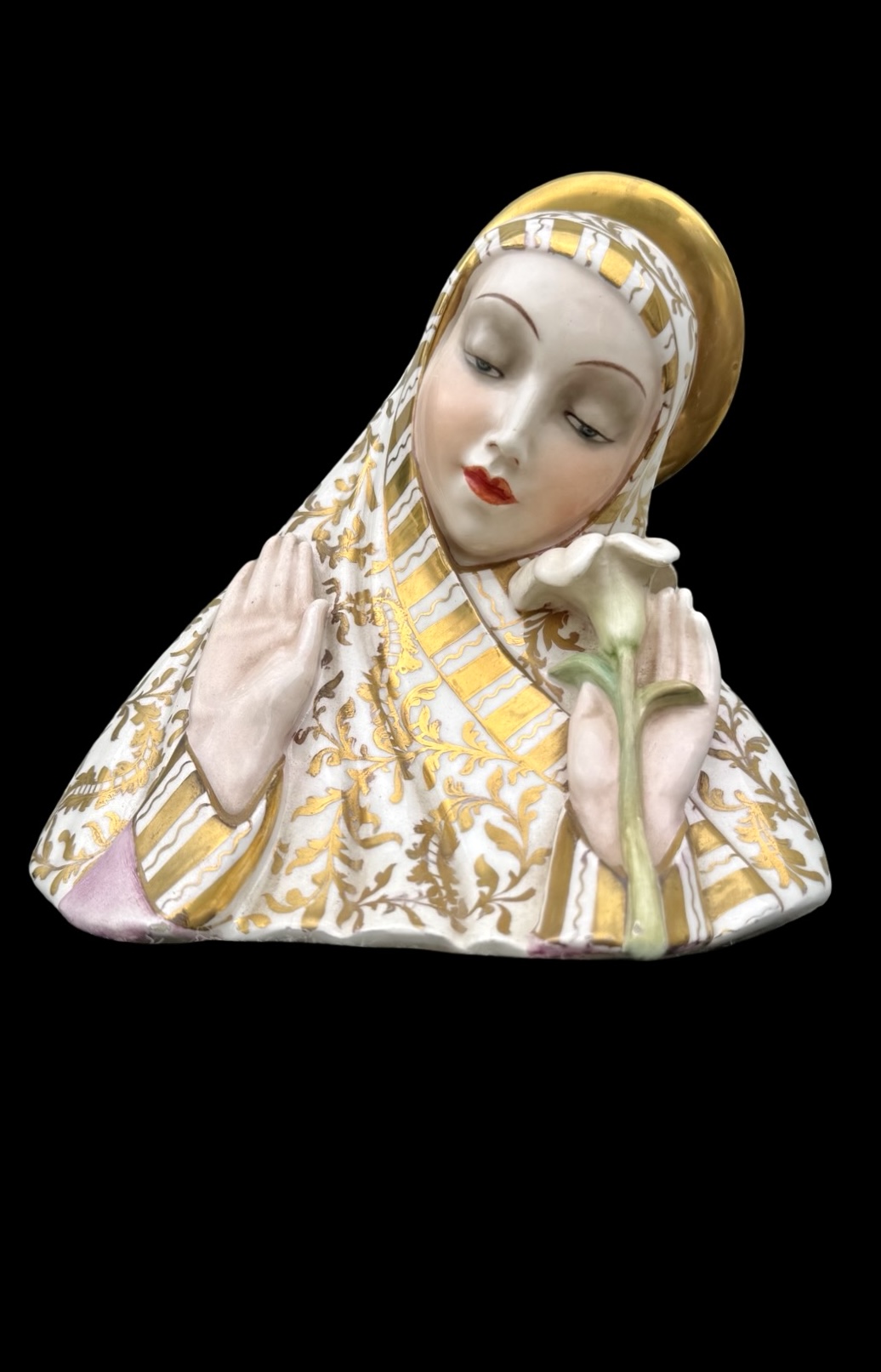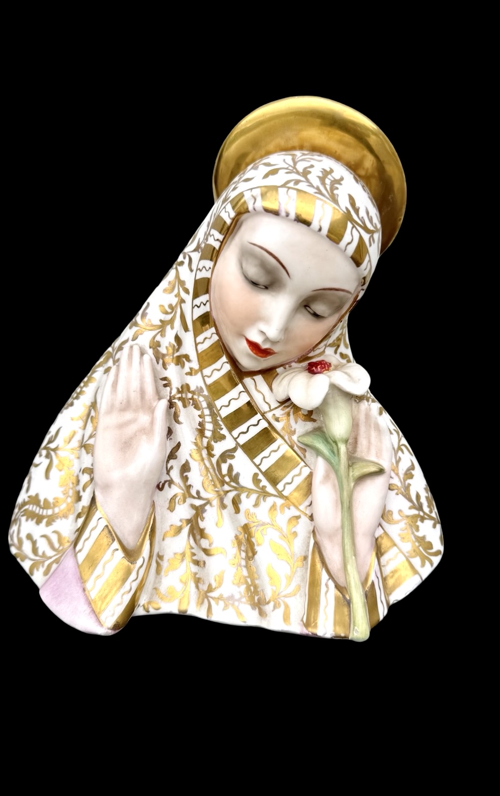 Ceramic bust of Madonna with flower and gold decorations. Cacciapuoti manufacture. Cm 20x20x13.