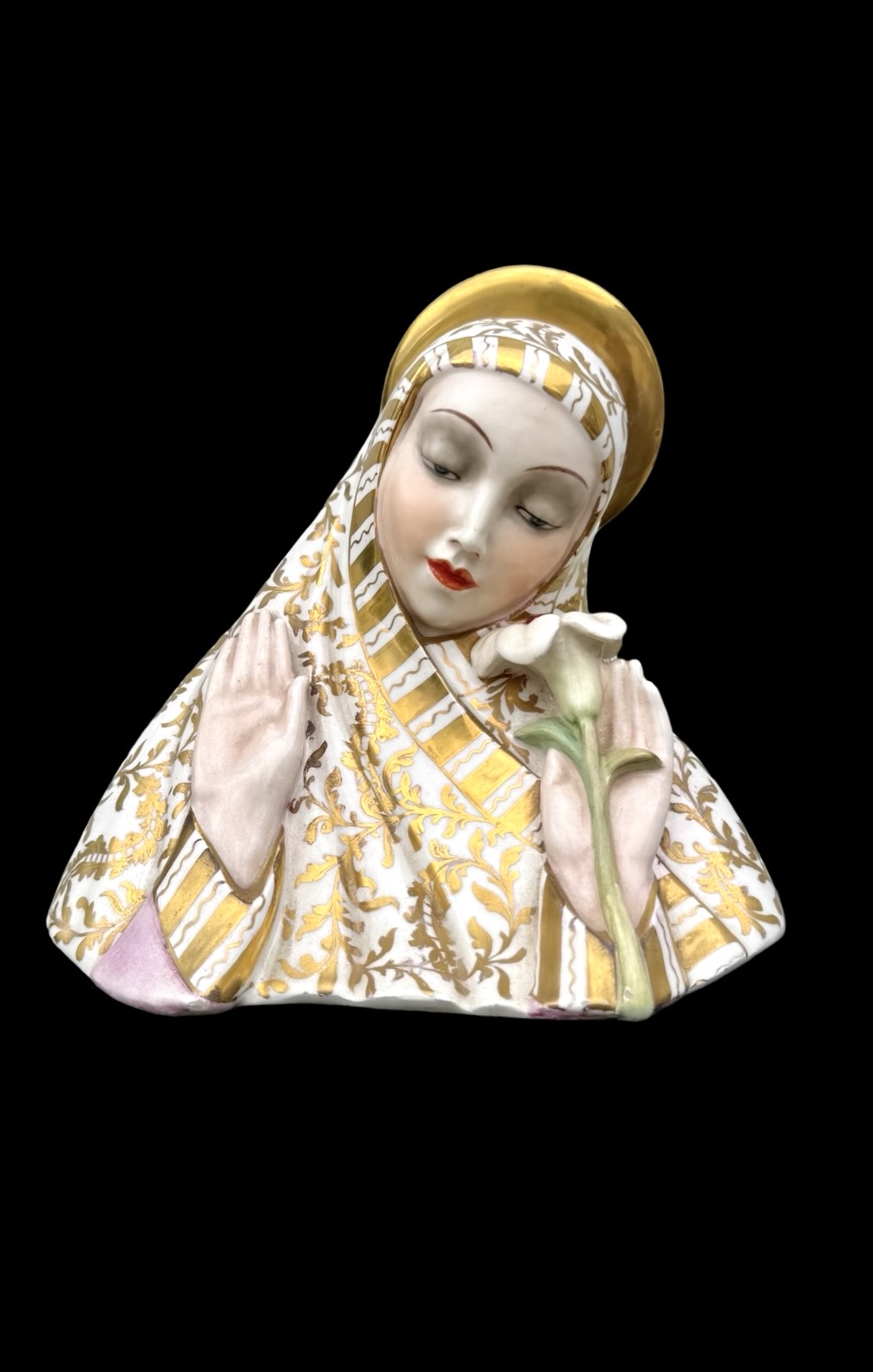 Ceramic bust of Madonna with flower and gold decorations. Cacciapuoti manufacture. Cm 20x20x13.