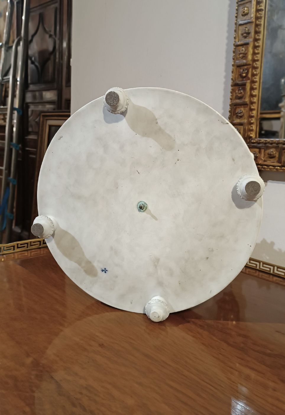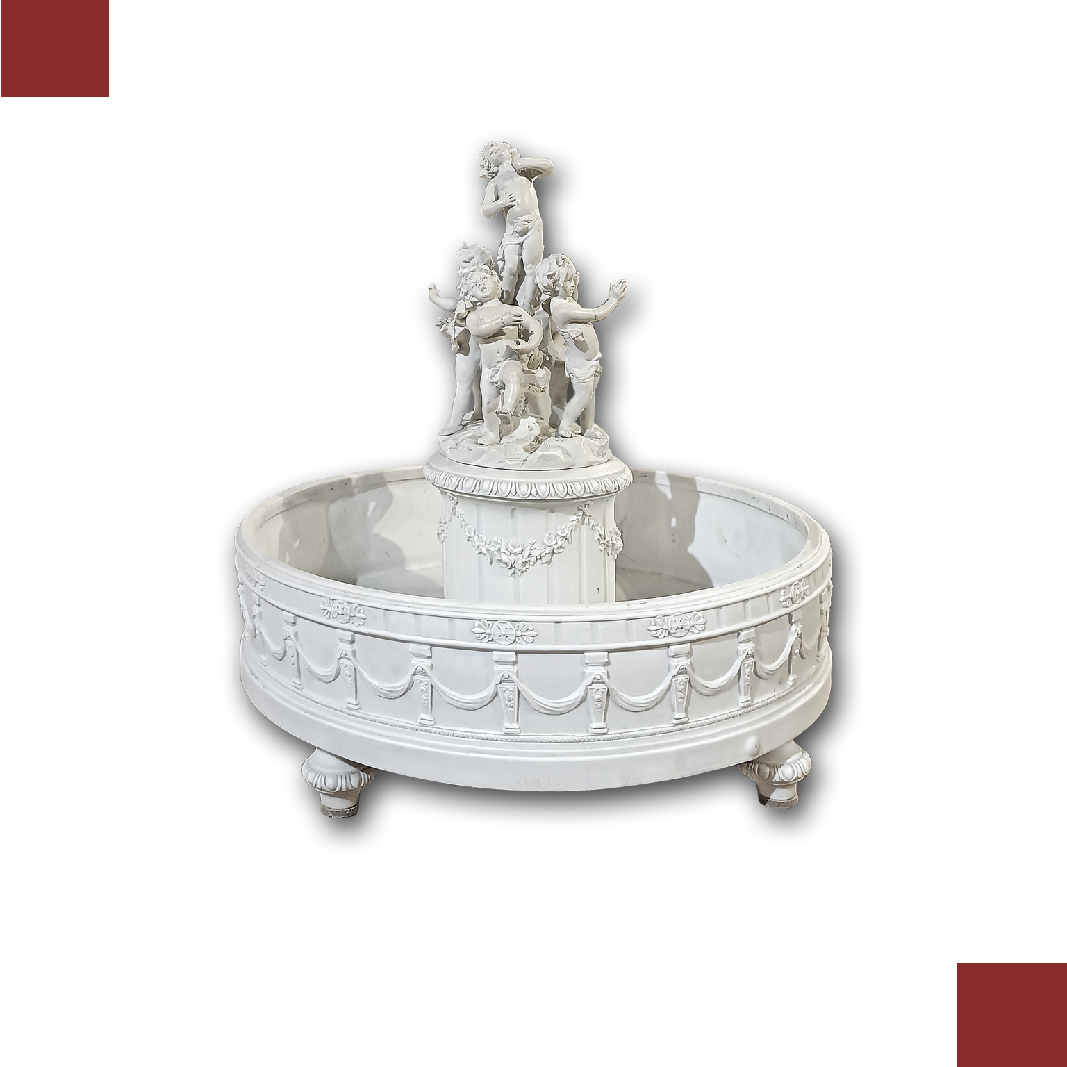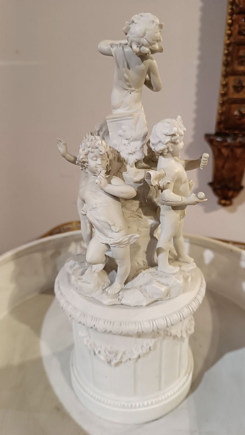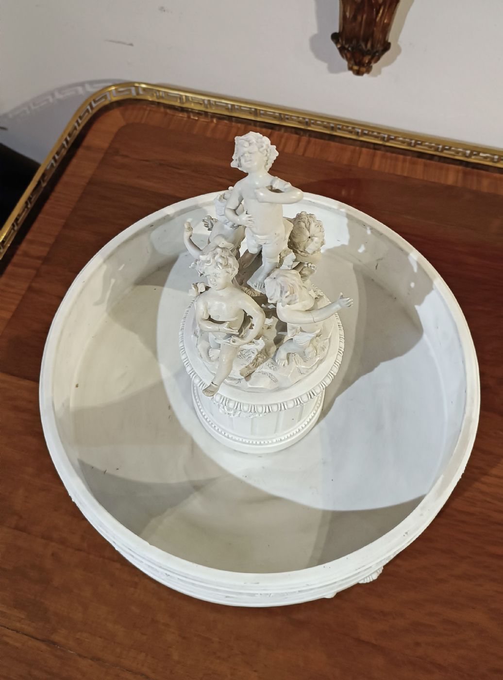 Refined centerpiece in white biscuit porcelain. The object stands out for its three feet and a large circular base that serves as a flower box, decorated with geometric motifs and festoons, giving it further elegance. In the center is a pedestal adorned with floral garlands, on which stand five dancing putti, one of whom, in the center, is taller. It is a centerpiece of great taste and refined workmanship, capable of adding a touch of class and sophistication to any environment. On the bottom of the centerpiece there is also the signature of the workshop. Viennese manufacture from the first half of the 19th century.