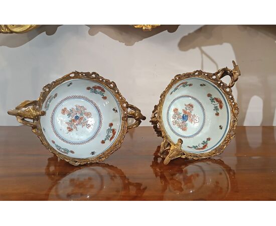 Bella coppia di coppe in porcellana Imari con montature francesi in bronzo fuso a cera persa e dorato. Le montature bronzee sono ricche ed eleganti, raffiguranti tralci vegetali con manici sormontati da piccoli uccelli, che conferiscono classe e raffinatezza. Le coppe Imari sono adornate con disegni di tipiche scene orientali giapponesi, in cui si può scorgere una figura immersa in un ambiente fiorito. Questi oggetti sono estremamente raffinati e capaci di arricchire con gusto ed eleganza qualsiasi ambiente. Le coppe si ascrivono a manifattura giapponese del XVIII secolo, composte in arte decorativa da artigiani francesi intorno ai primi del XIX secolo.
