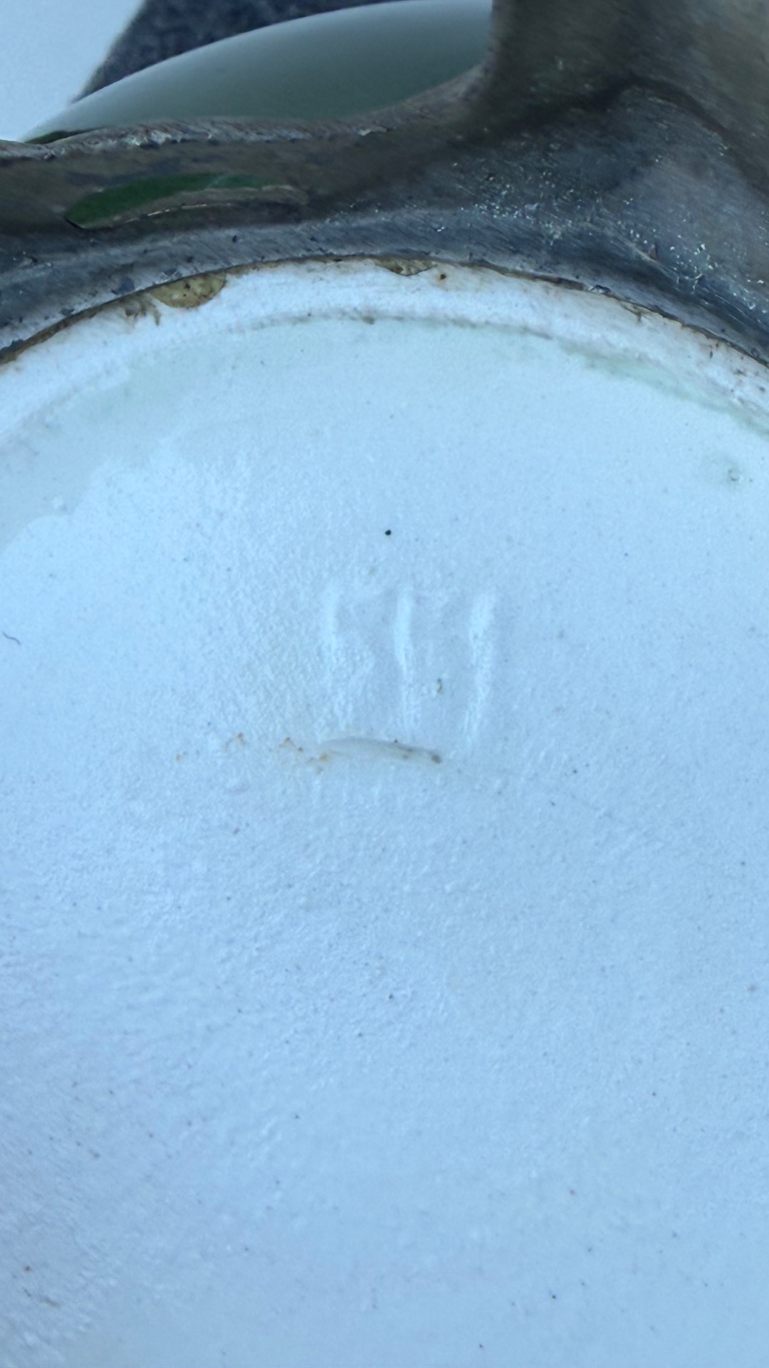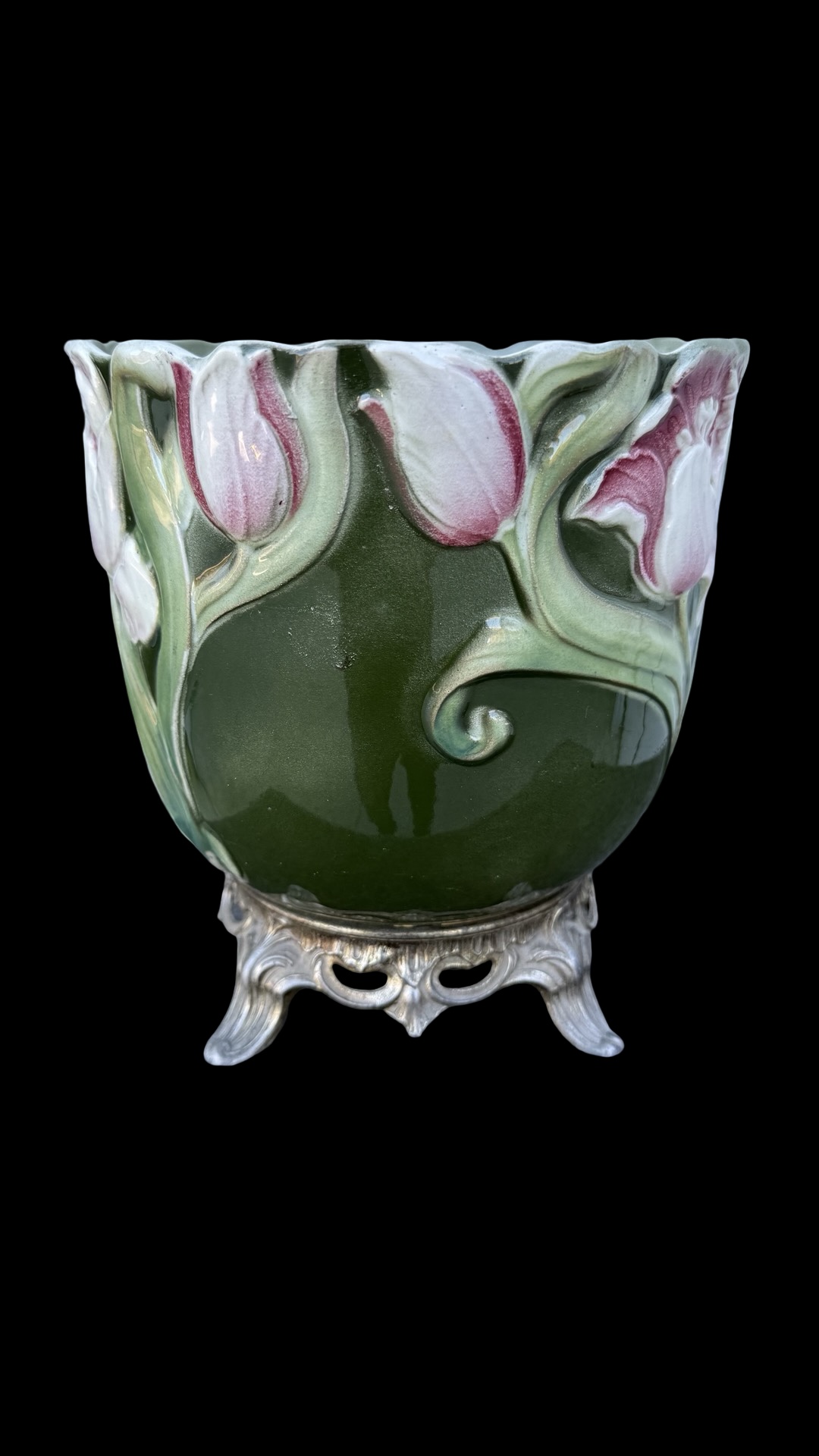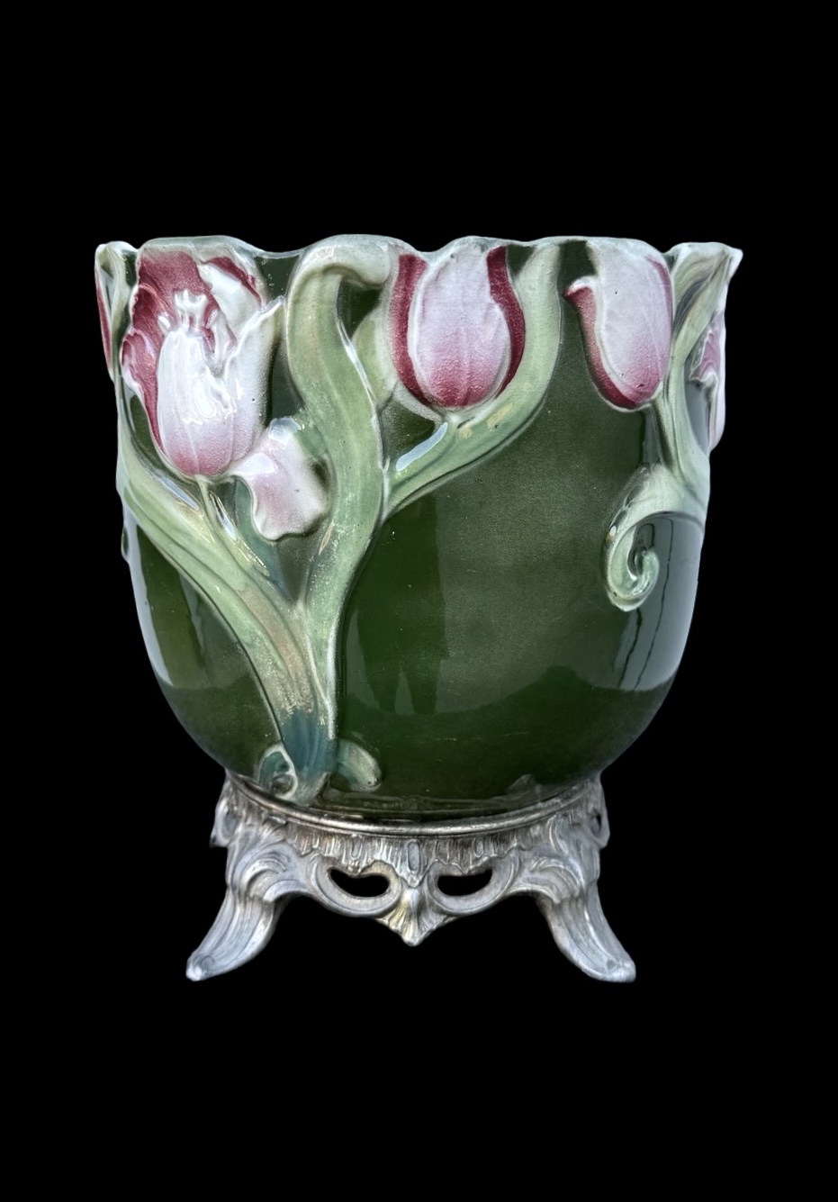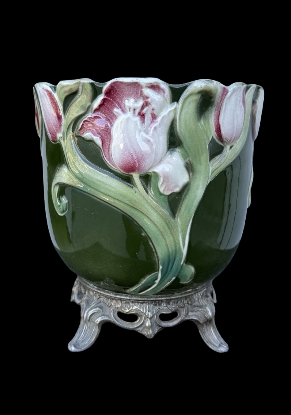 Barbotine ceramic jardiniere vase with tulip floral decoration on a green background. Bronze base. France. Cm 22x21.