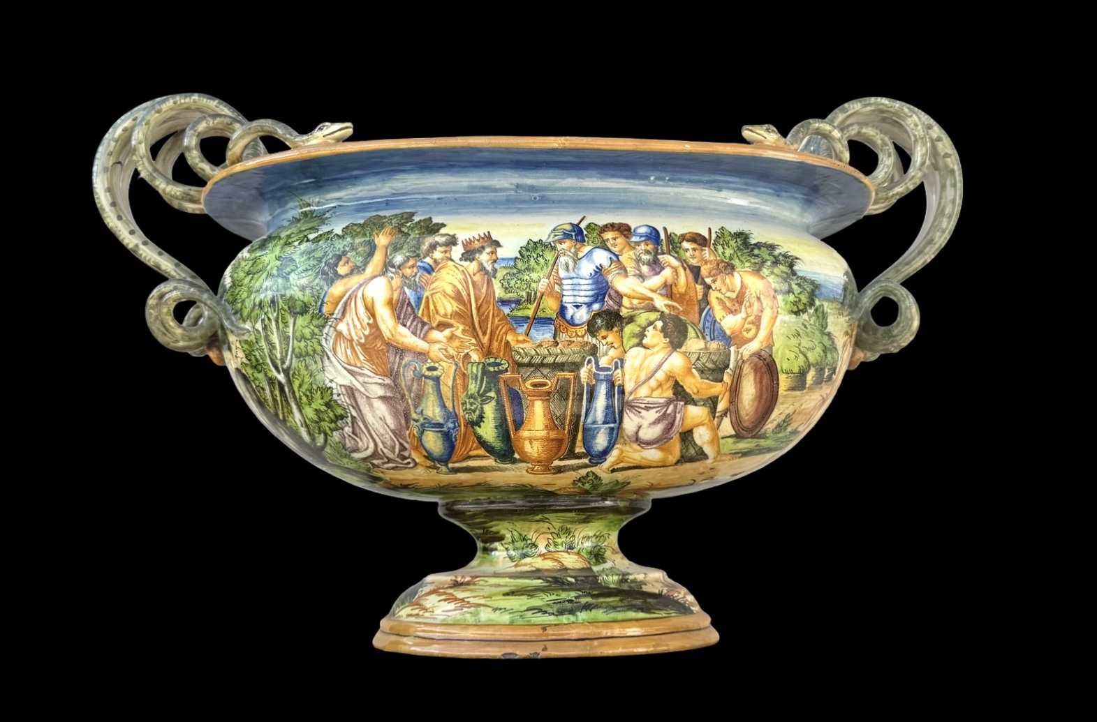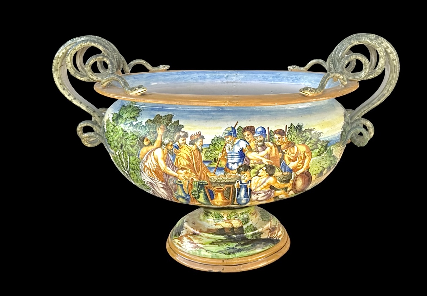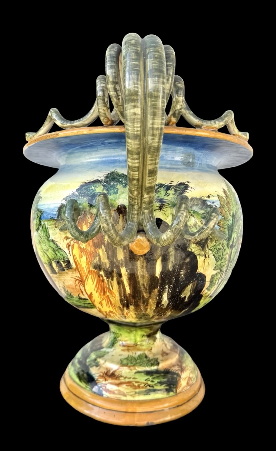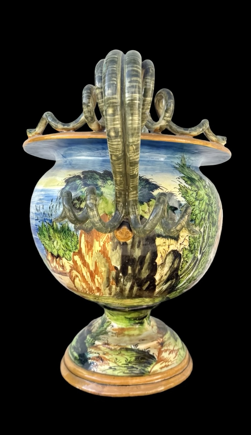 Large majolica vase with side handles in the shape of snakes and decoration with a historical scene. Molaroni Manufacture. Pesaro. Painter Eliseo Bertozzini. Cm 62x38x30.