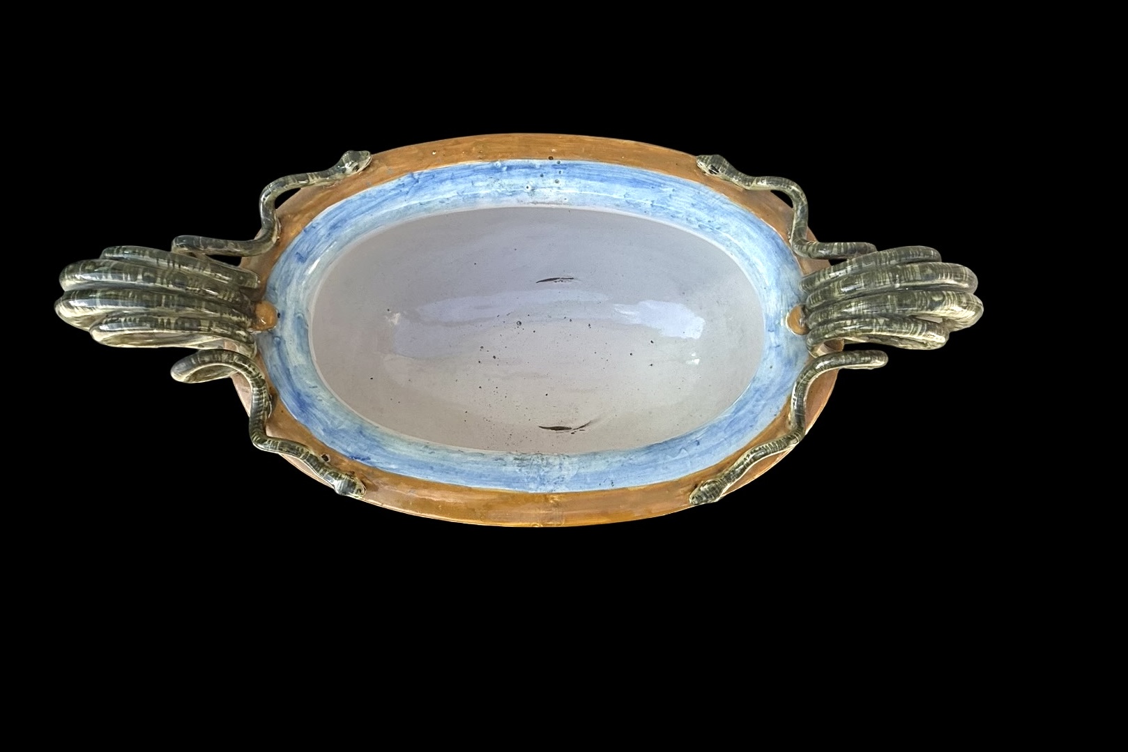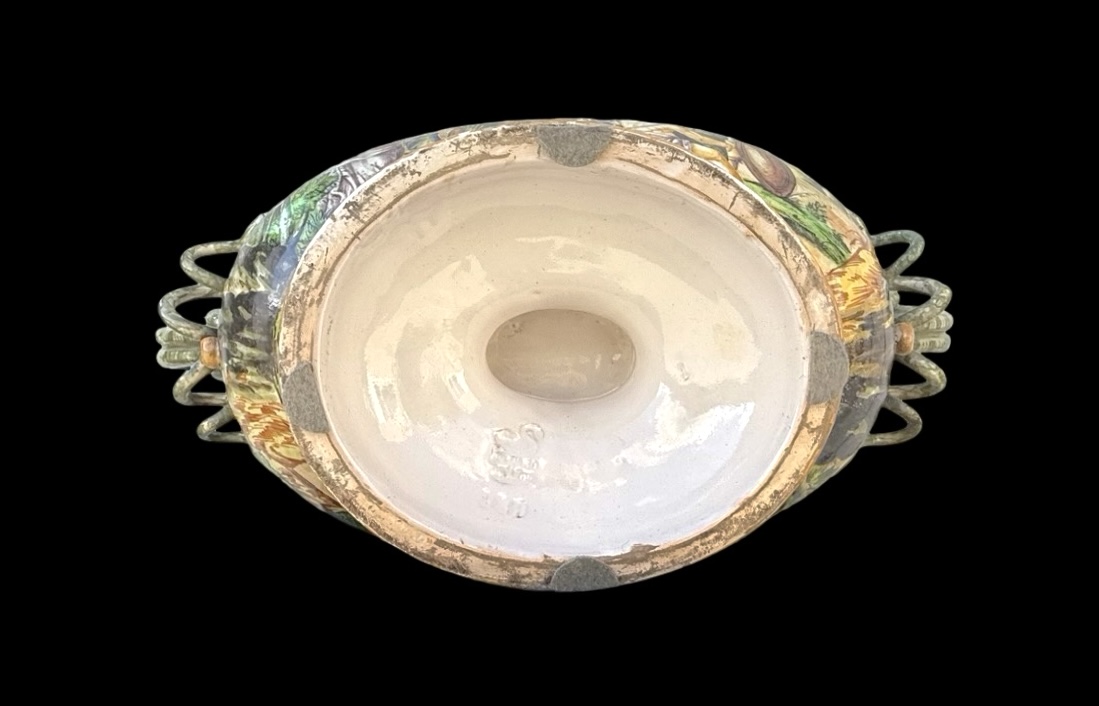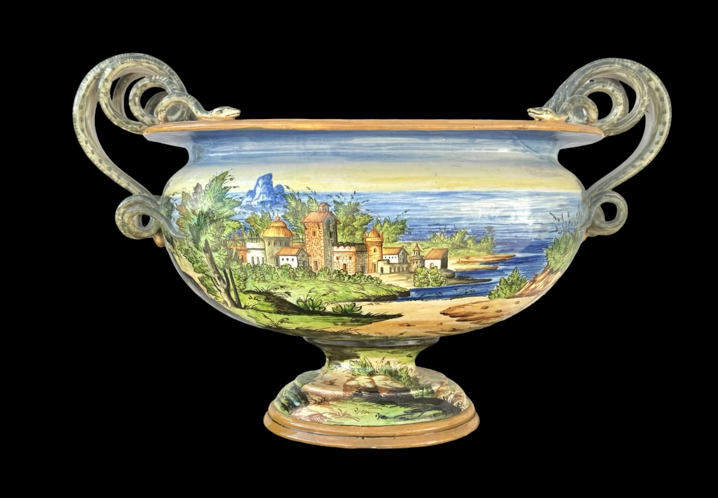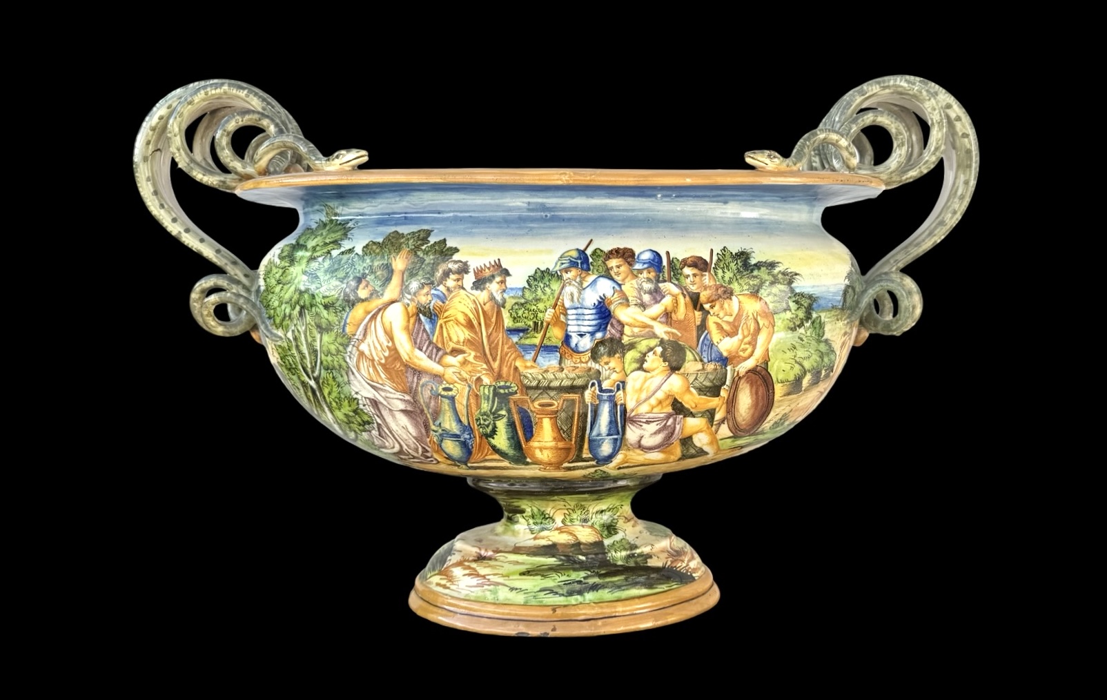 Large majolica vase with side handles in the shape of snakes and decoration with a historical scene. Molaroni Manufacture. Pesaro. Painter Eliseo Bertozzini. Cm 62x38x30.