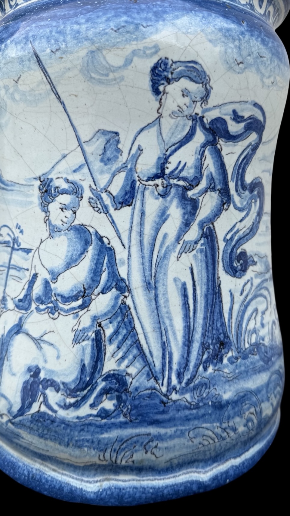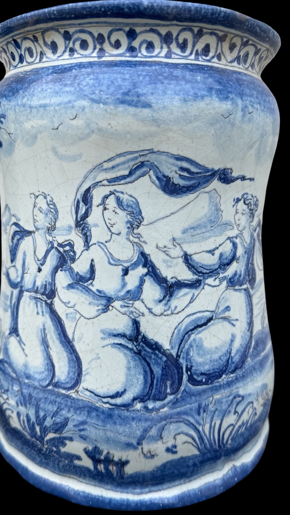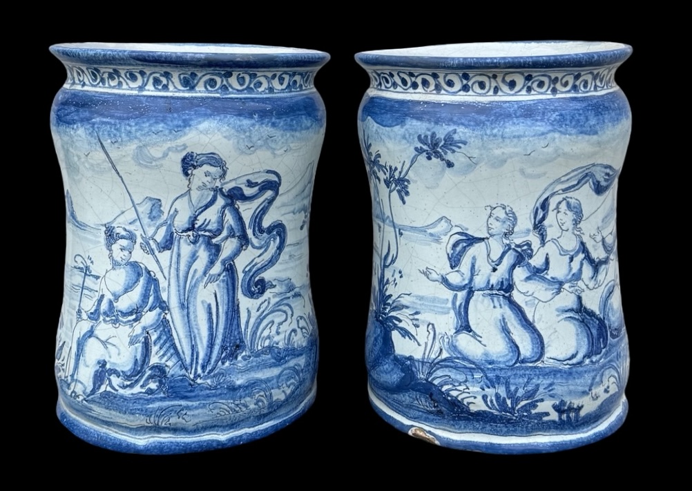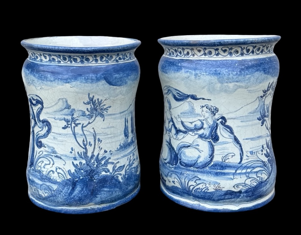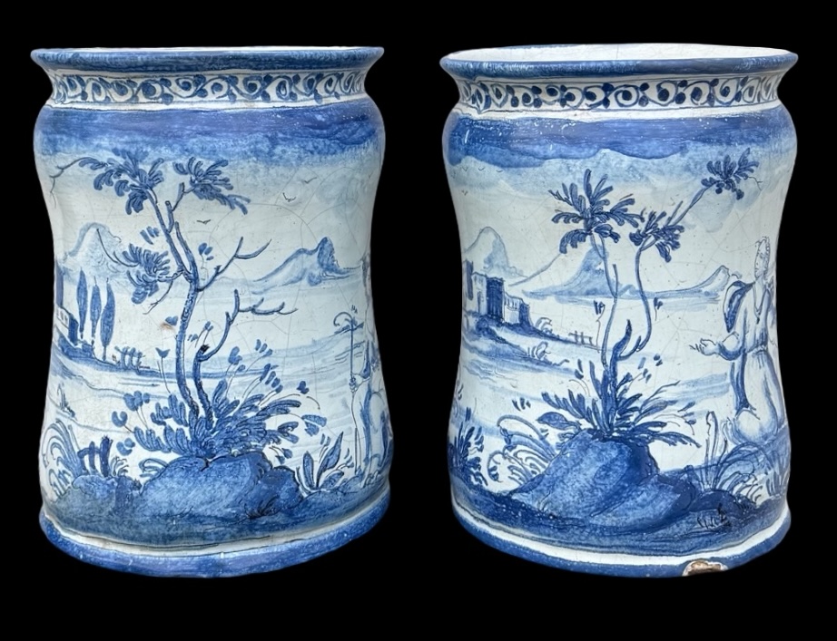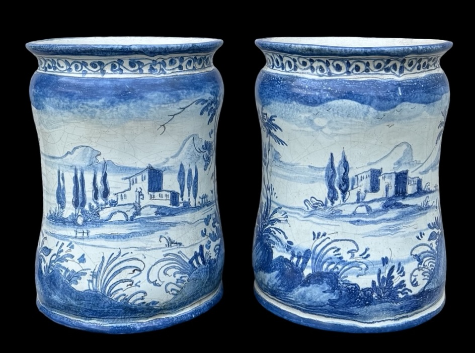 Pair of majolica albarello vases decorated with figures in a rural setting. Lantern signature. Savona.
