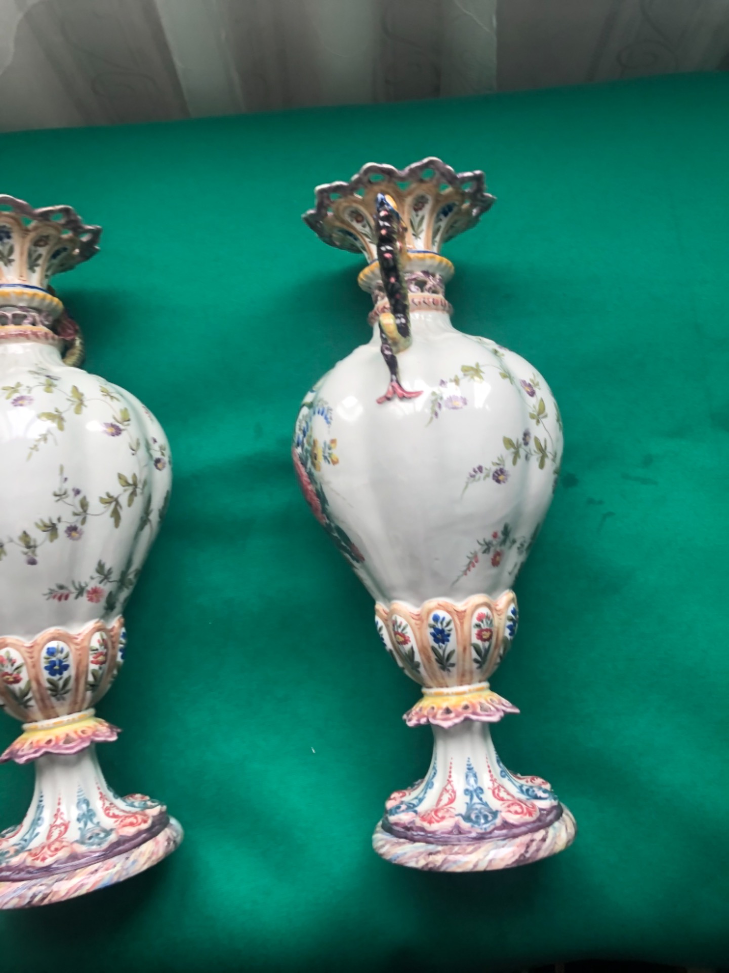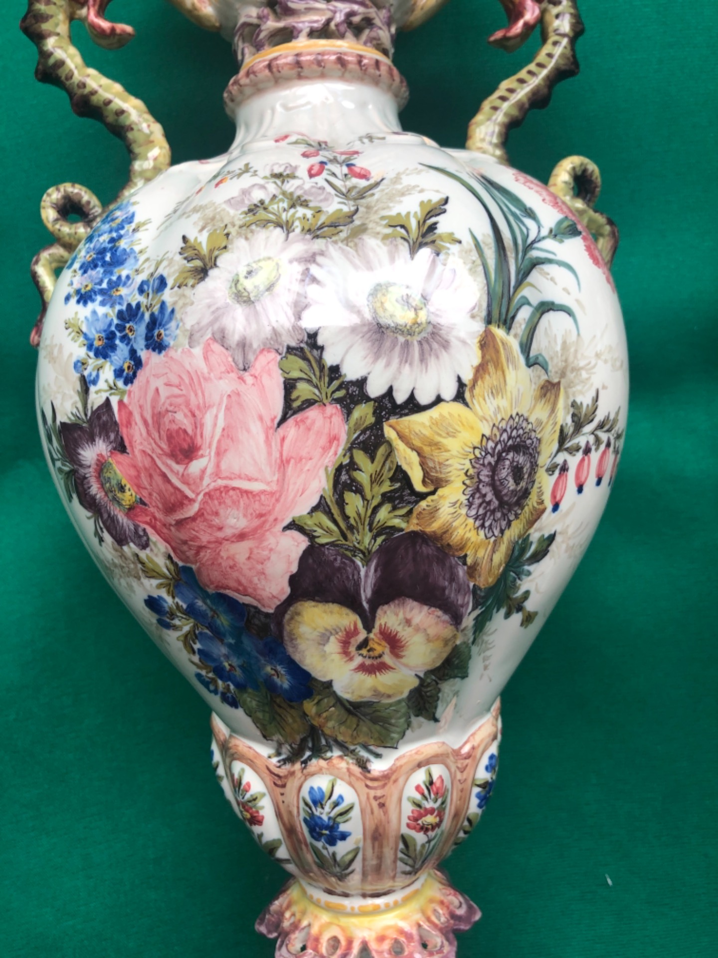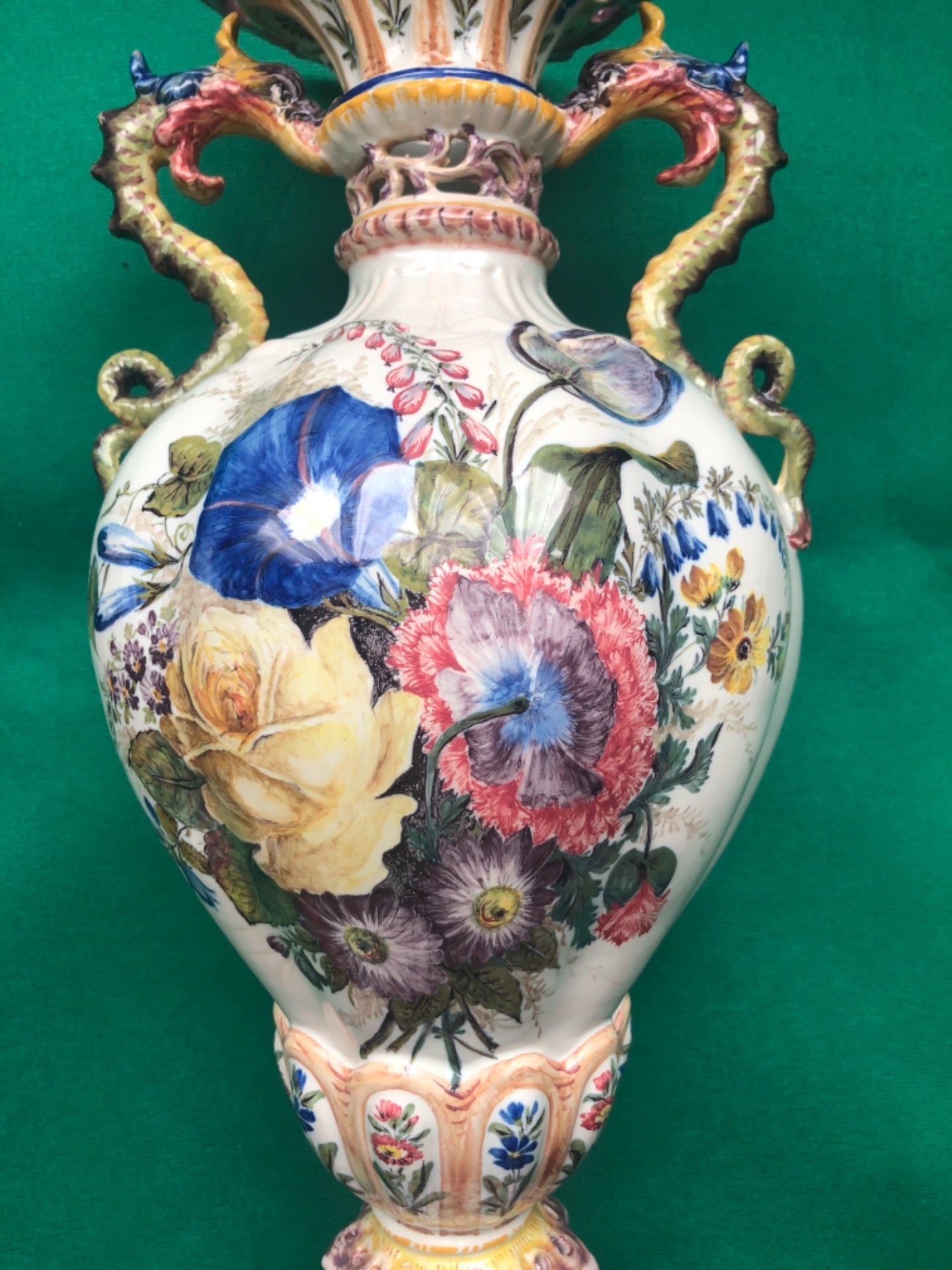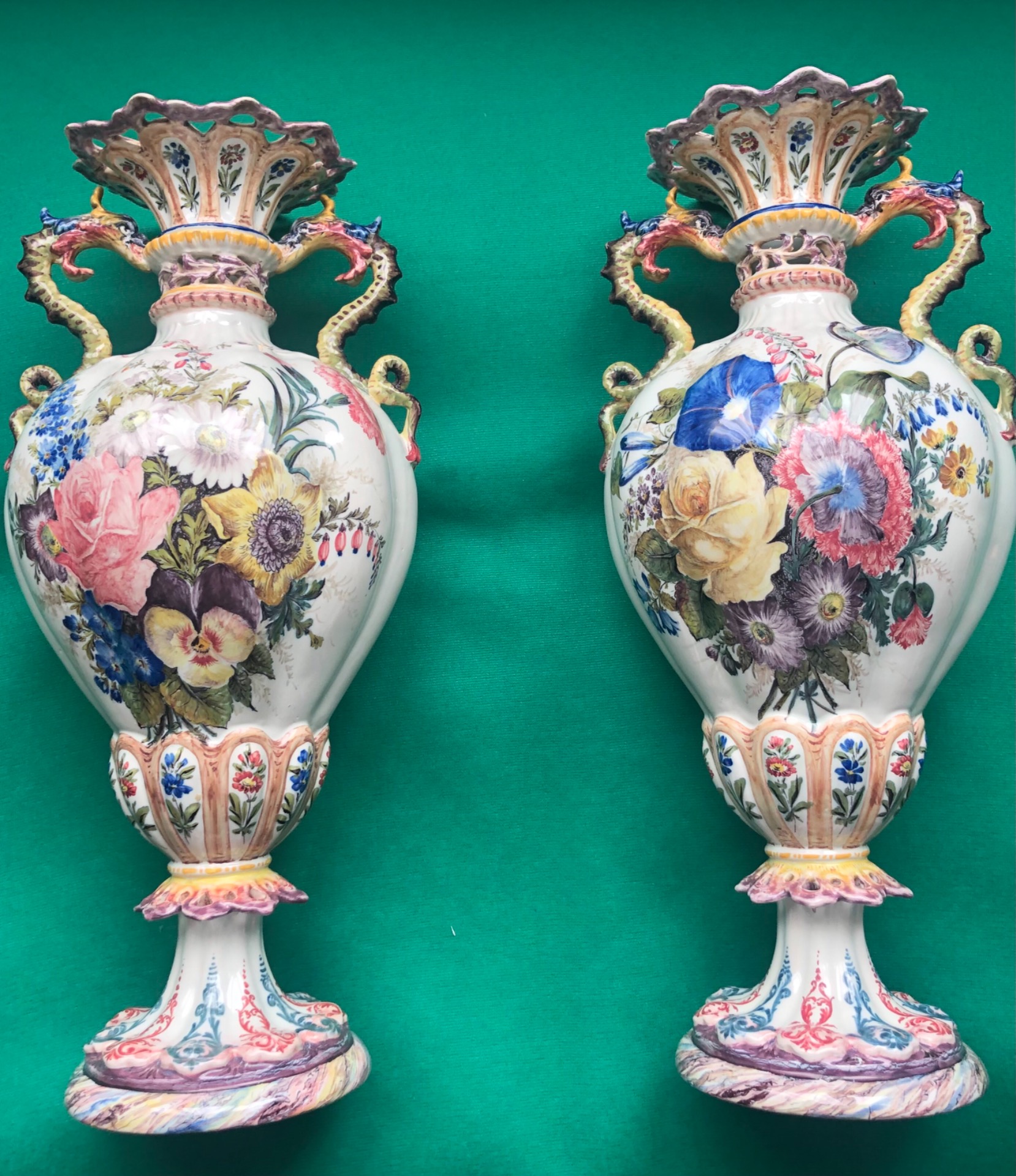 Pair of majolica vases decorated with flowers. Antonibon manufacture, Nove di Bassano.
