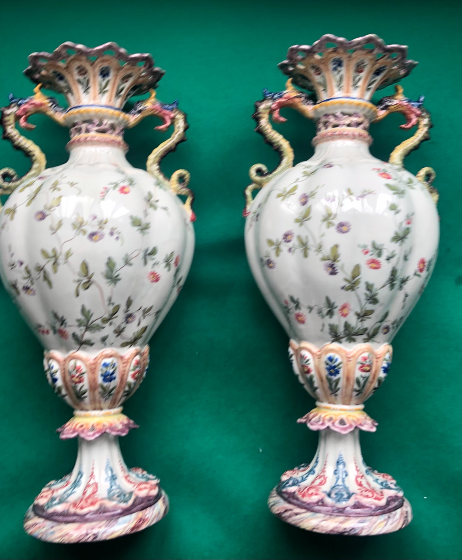 Pair of majolica vases decorated with flowers. Antonibon manufacture, Nove di Bassano. Cm 47x20.