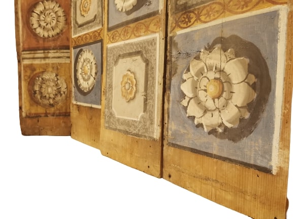 N. 48 tavole da soffitto in abete, dipinte a tempera, riportanti motivi geometrici e floreali.