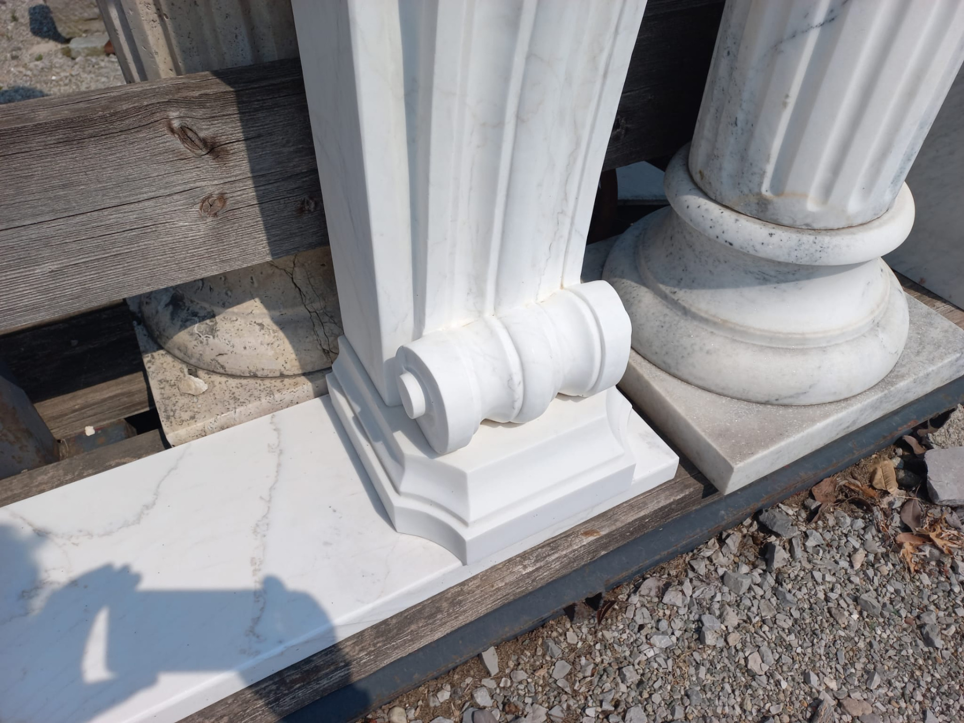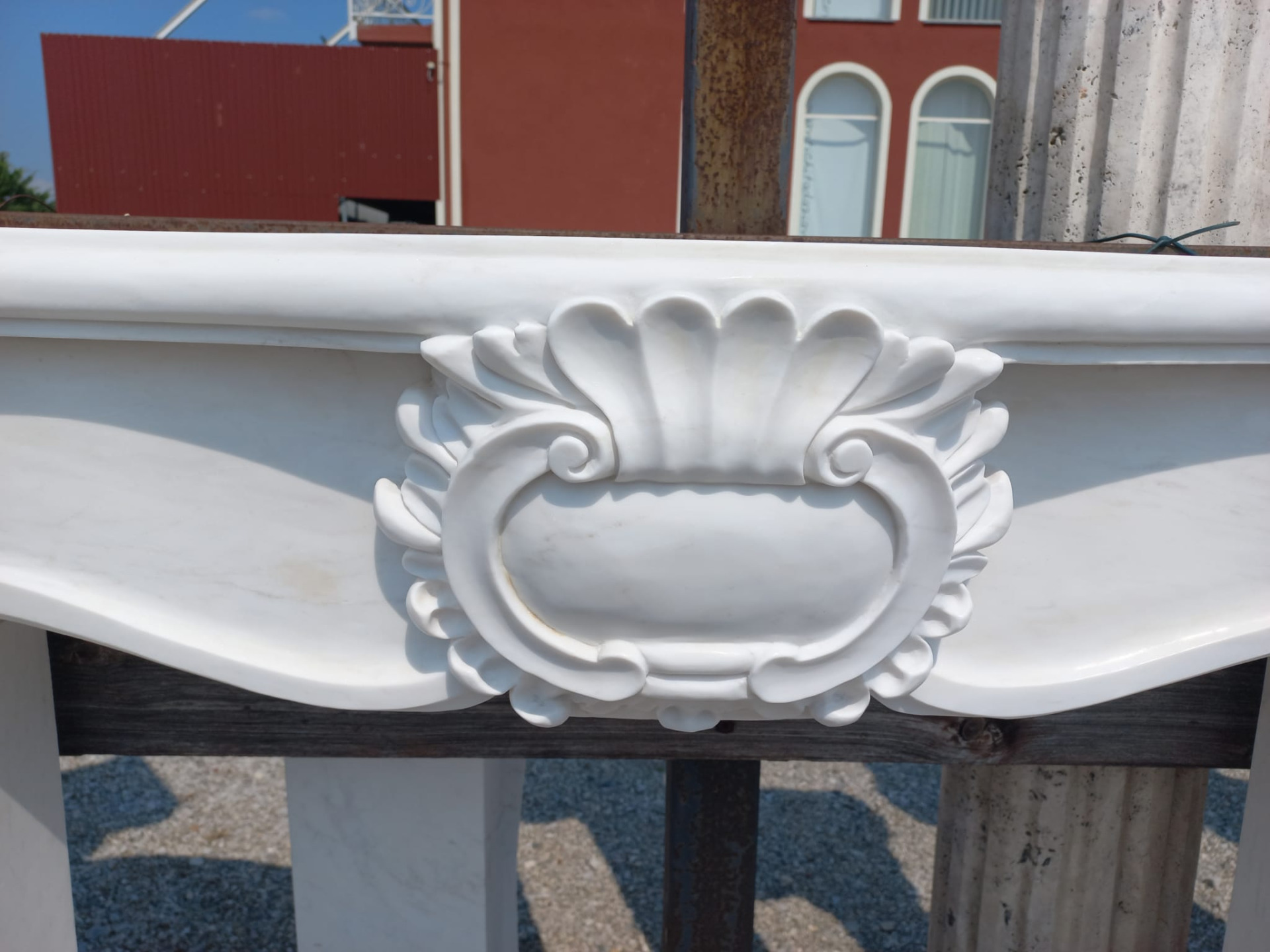 Antique white marble frame, with a curved pediment and carved side uprights.