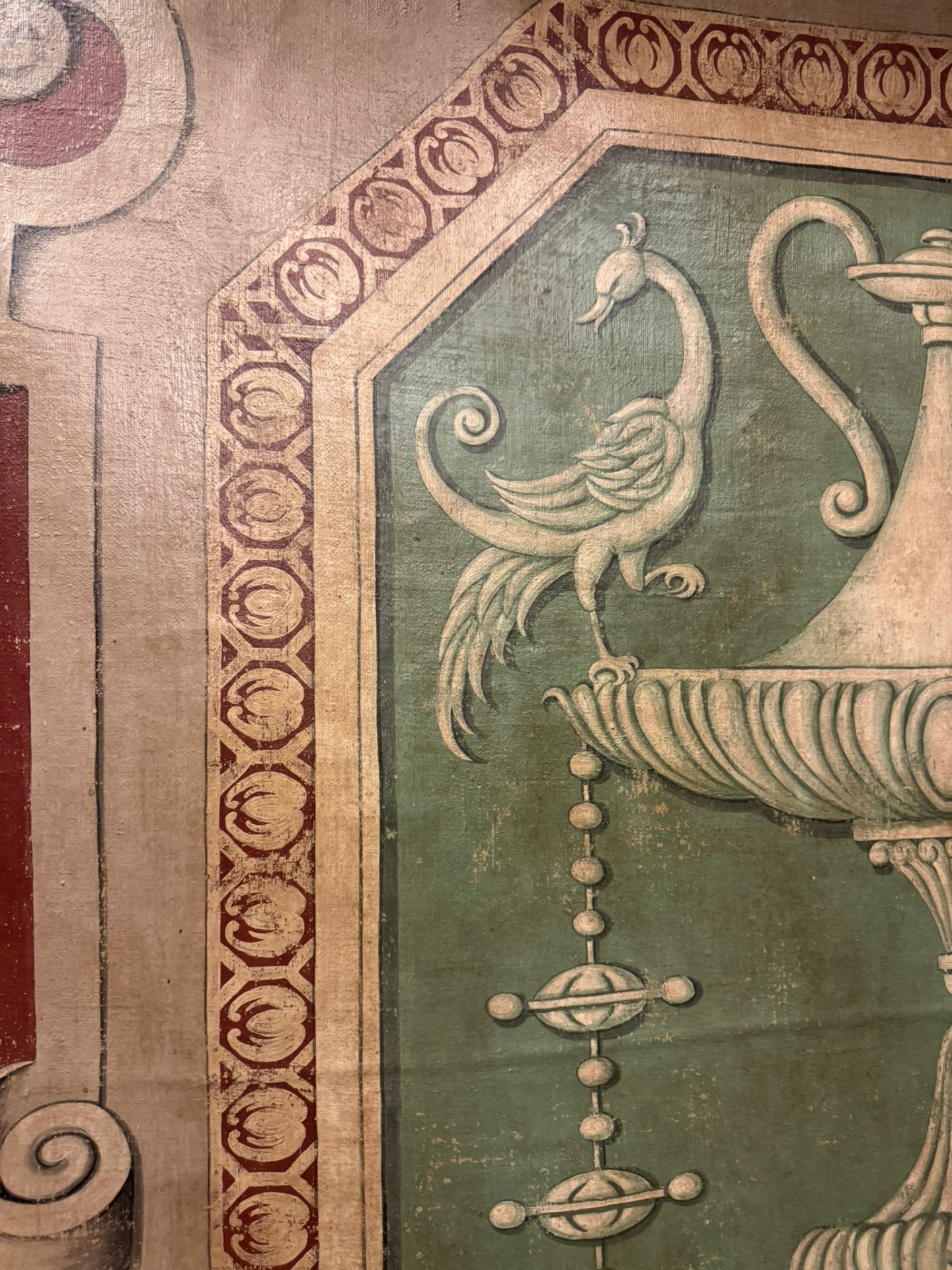 The boiserie is punctuated by vertical panels, delimited by frames painted with geometric motifs in red and ivory,