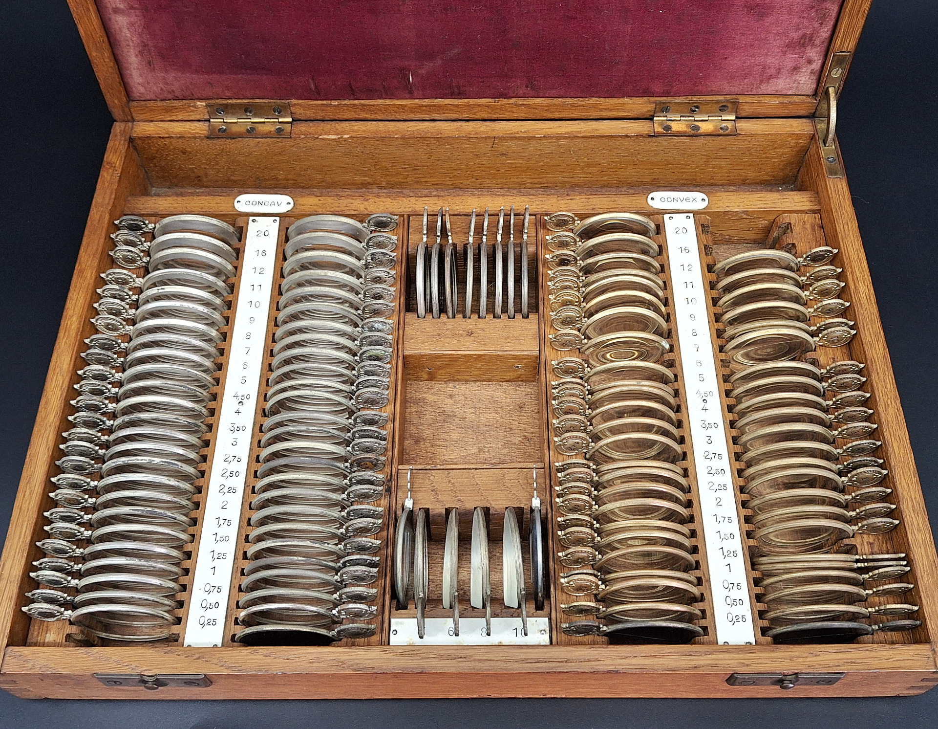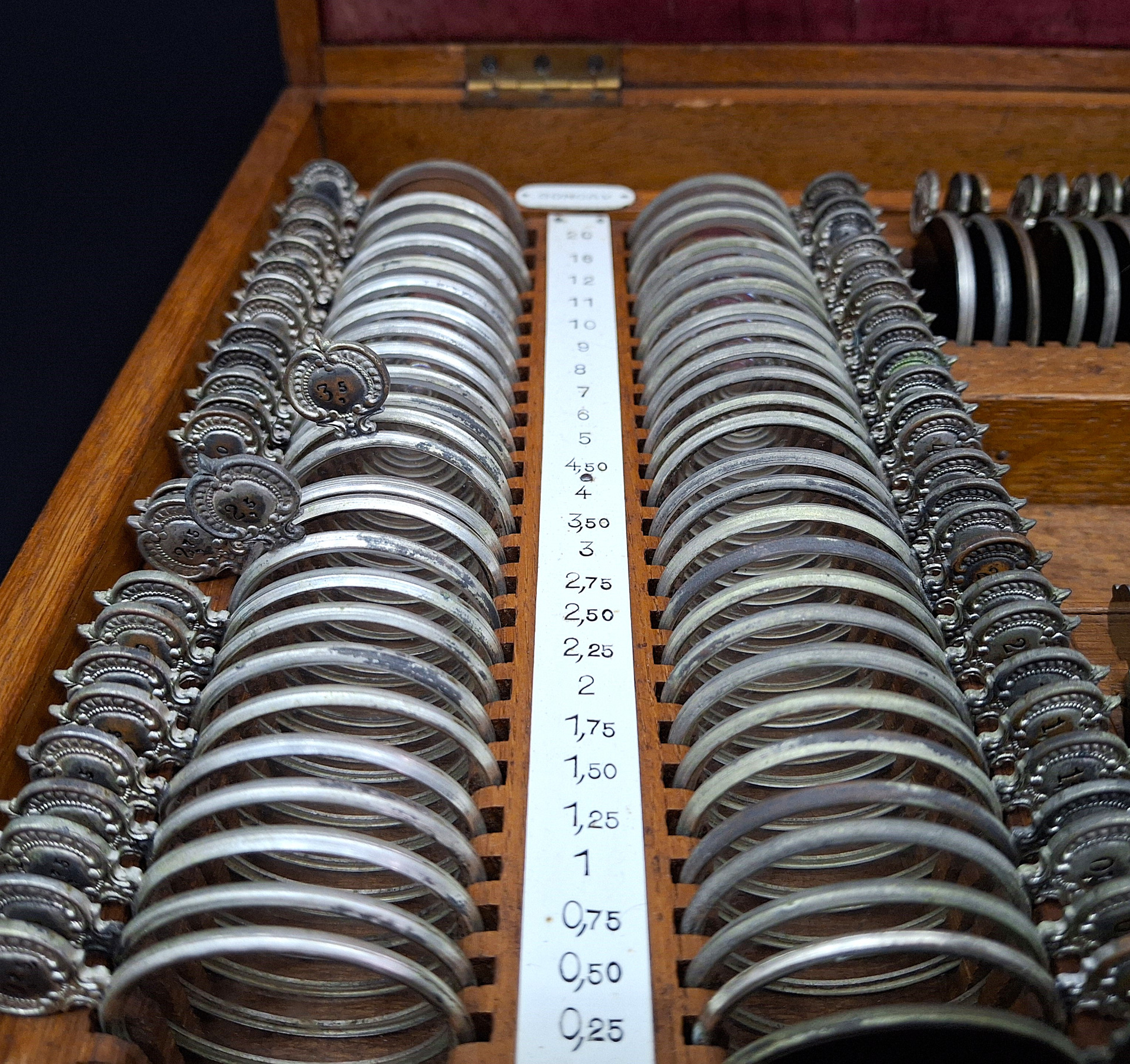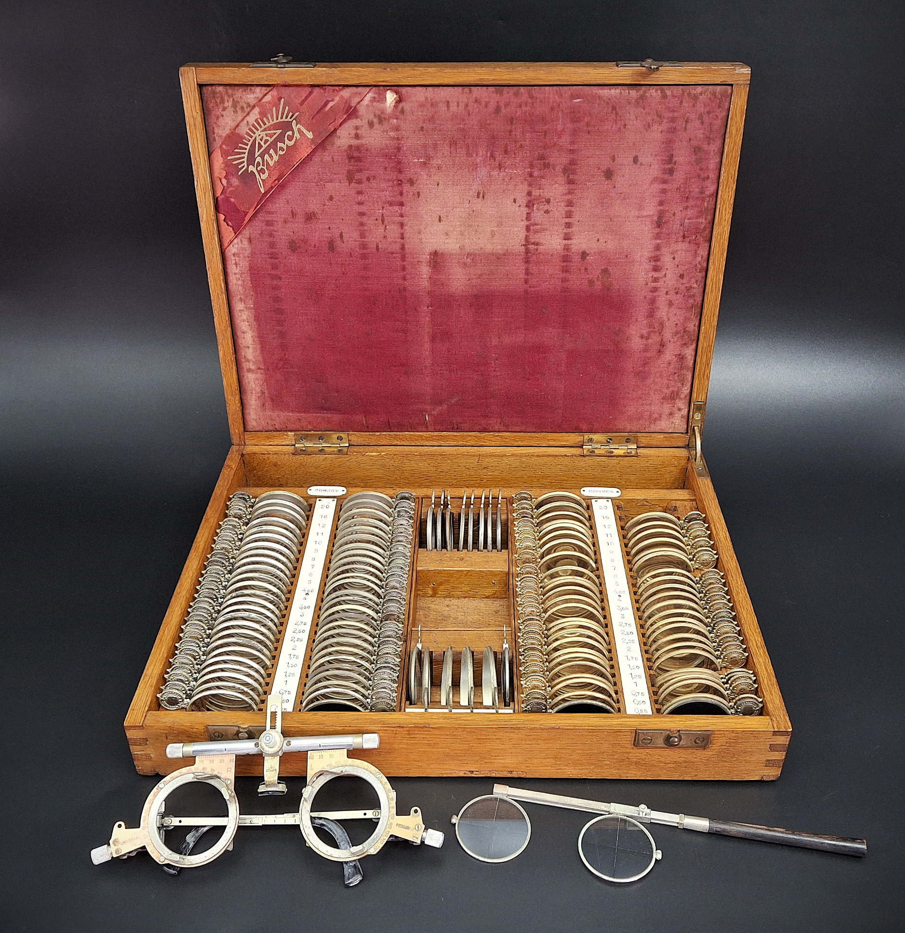 Inside, the upper part is covered with red satin with the marking "Bush", while in the lower part there are several compartments containing trial lenses of different convex and concave gradations as well as other trial lenses.