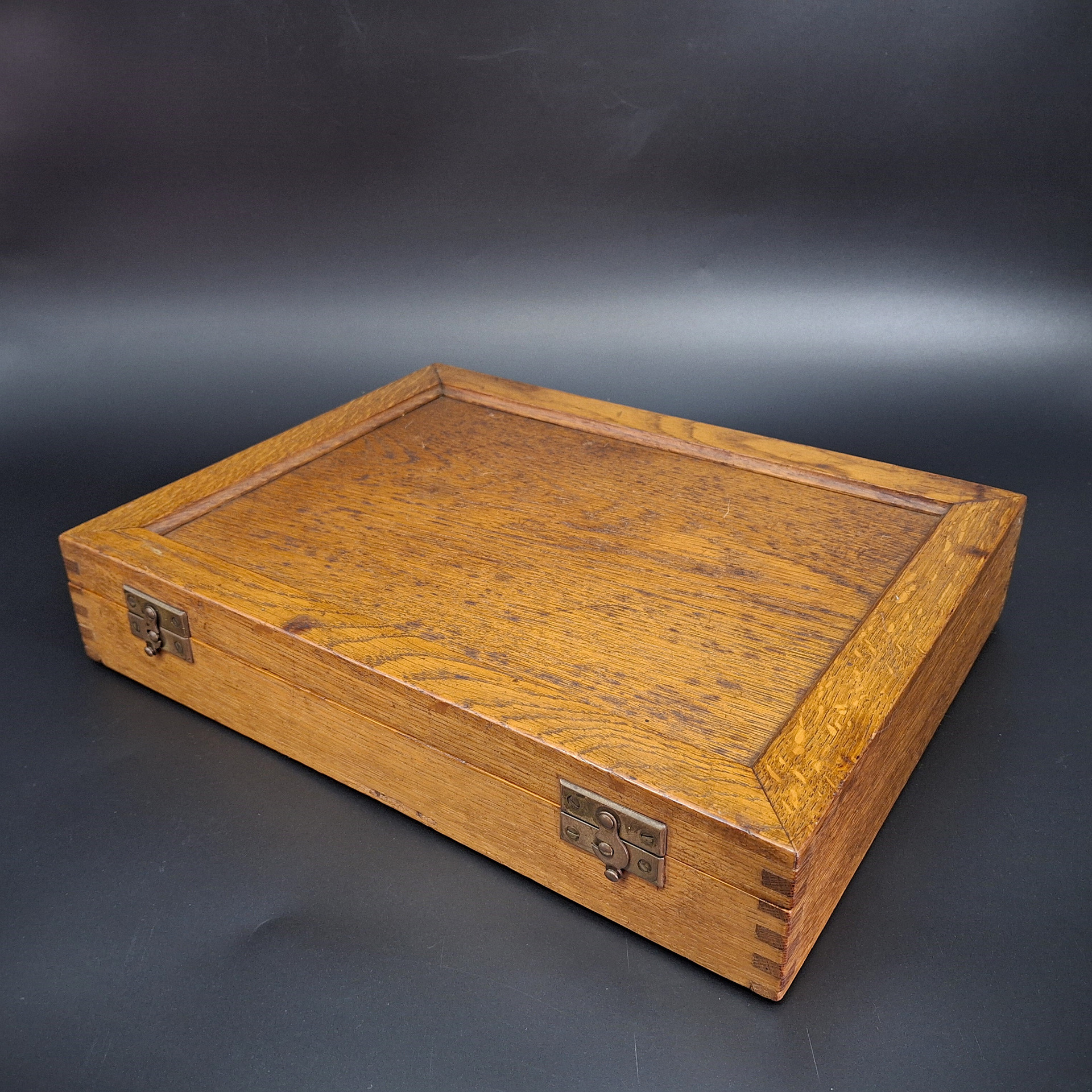 The oak wood box is in excellent condition with working closing hooks.