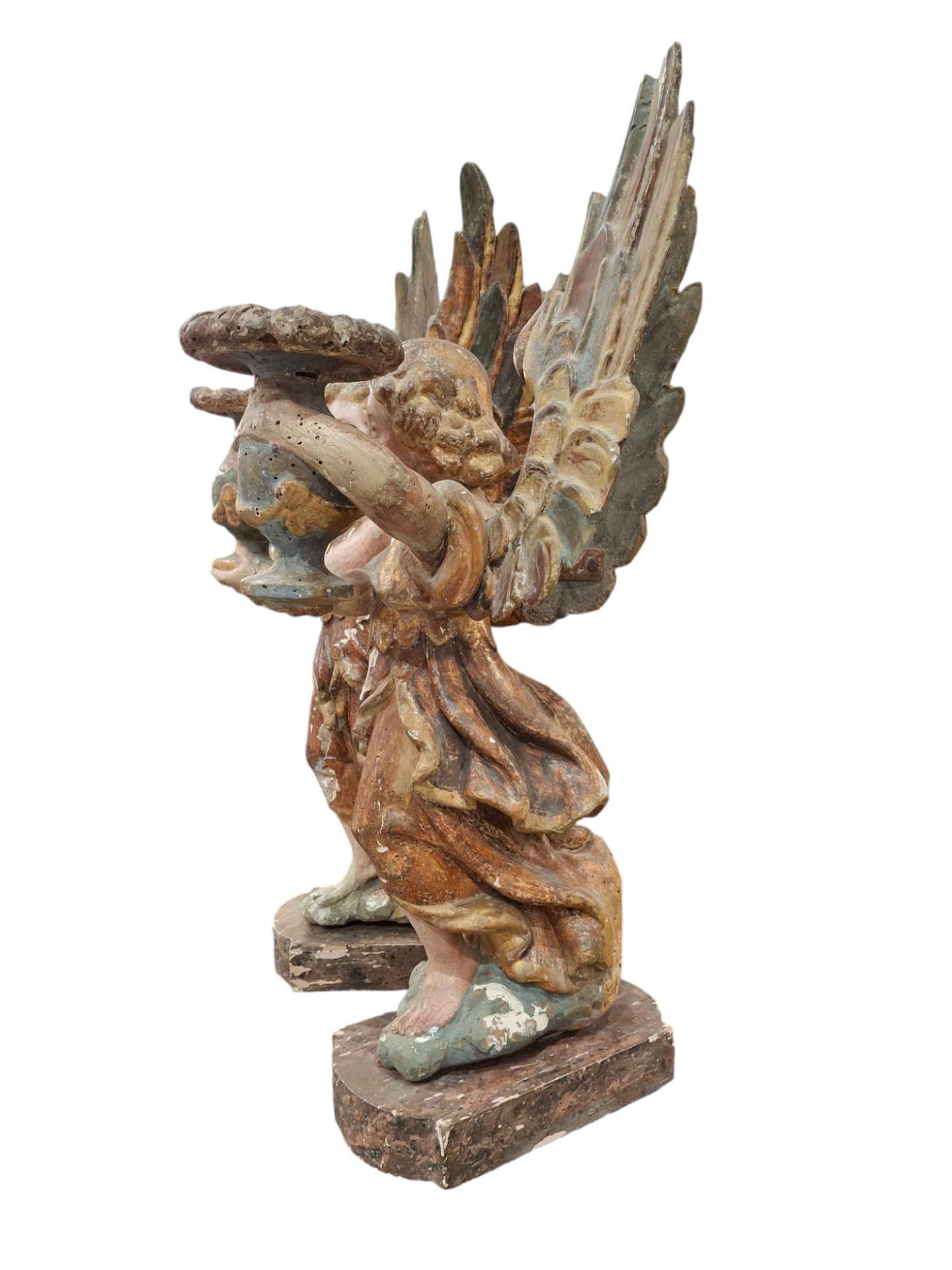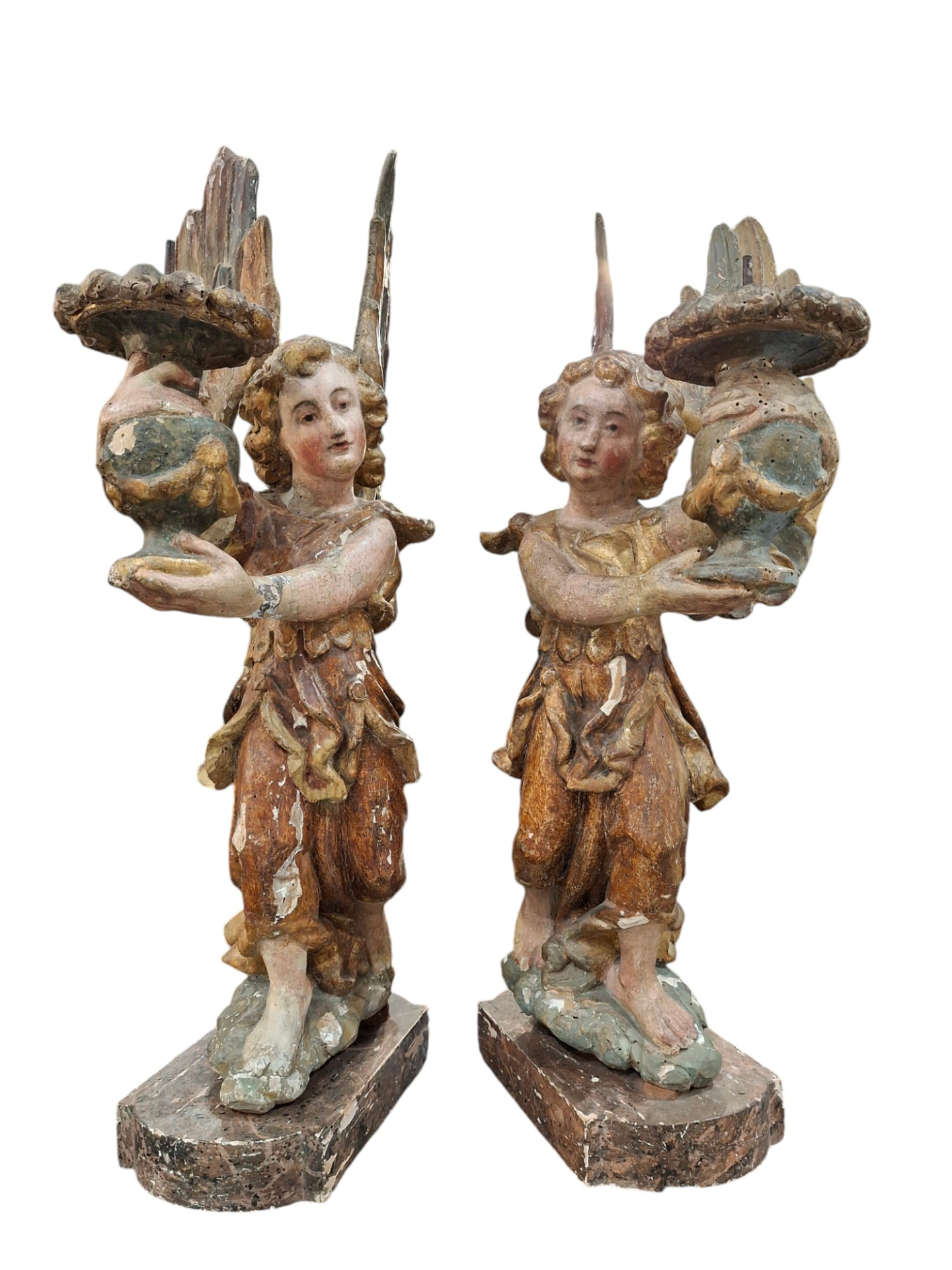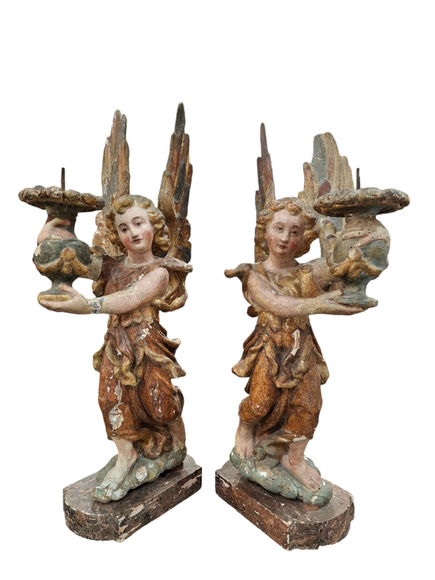 Coppia di angeli genuflessi portacero in legno intagliato dipinto e dorato, sculture dell' Italia centrale, fine XVI secolo, altezza delle sculture 75 cm circa, la base lignea amovibile è alta 5 cm e misura 28x16 cm.