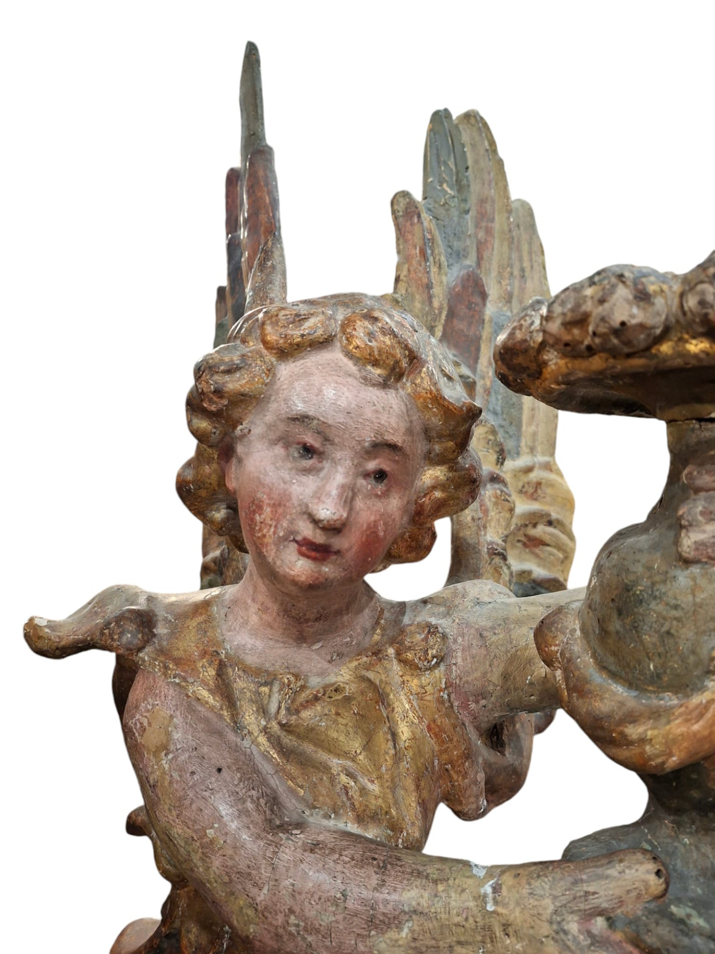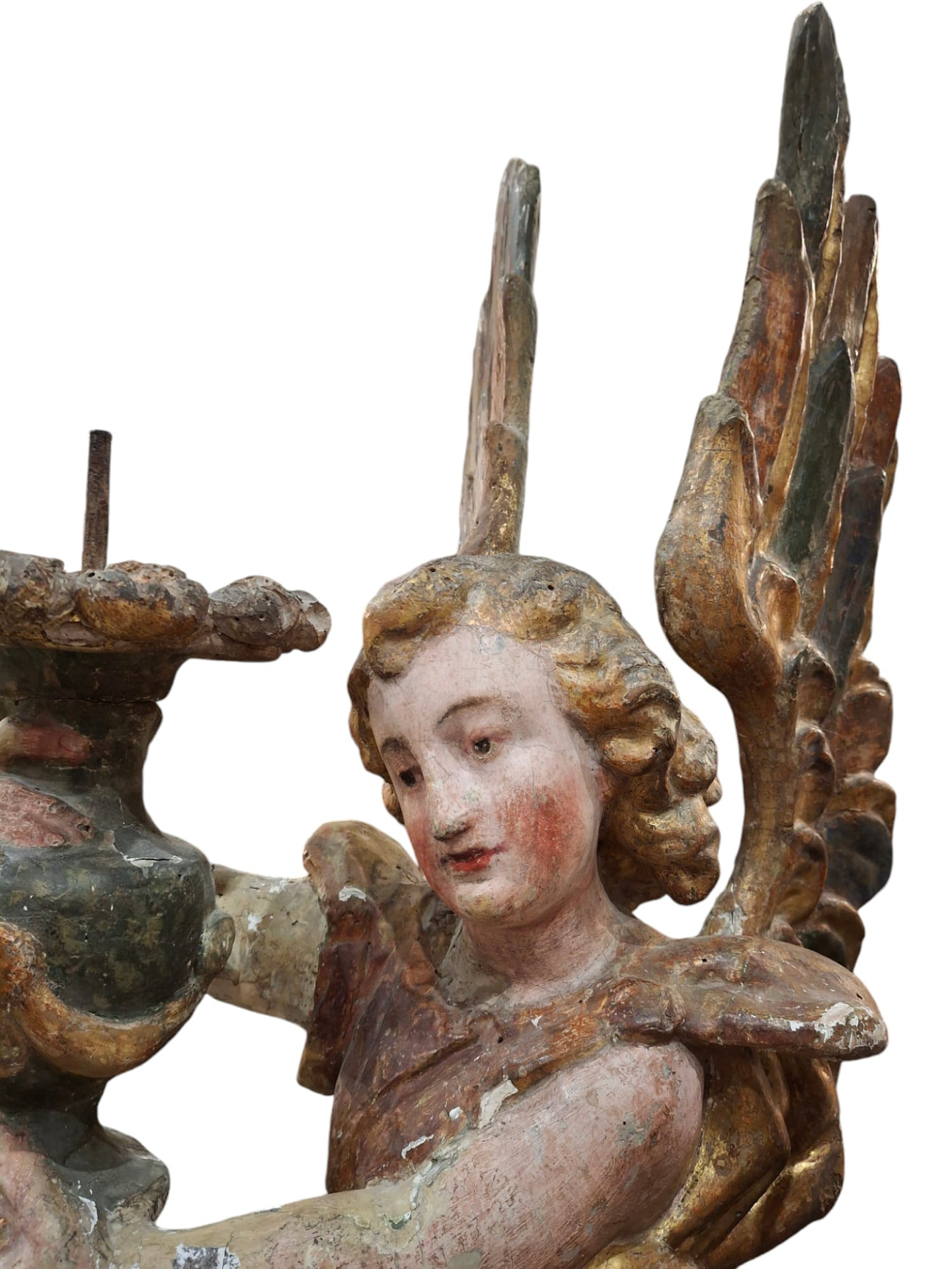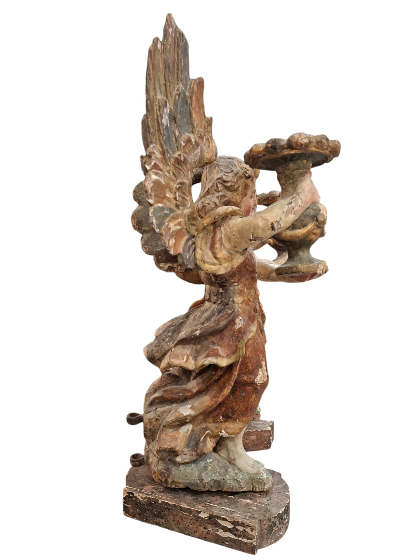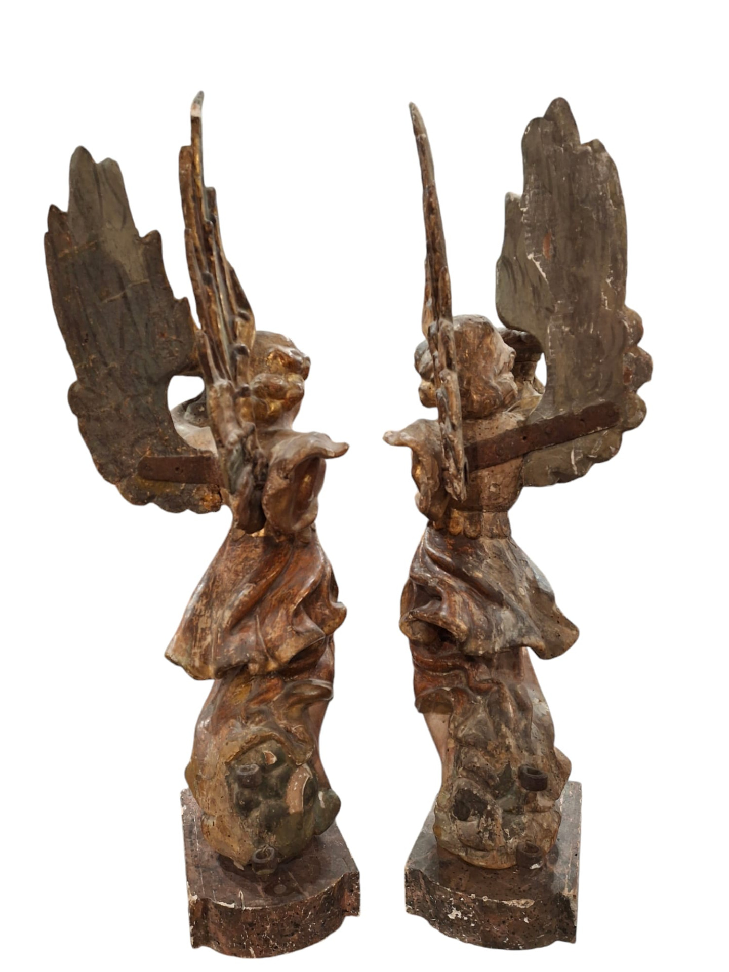 Coppia di angeli genuflessi portacero in legno intagliato dipinto e dorato, sculture dell' Italia centrale, fine XVI secolo, altezza delle sculture 75 cm circa, la base lignea amovibile è alta 5 cm e misura 28x16 cm.