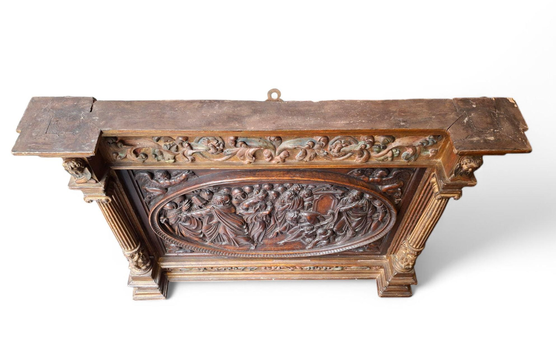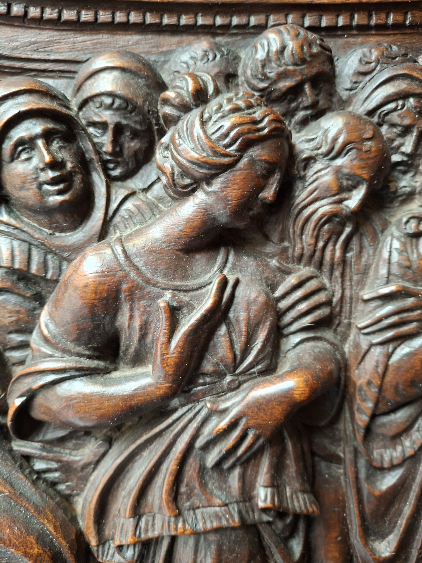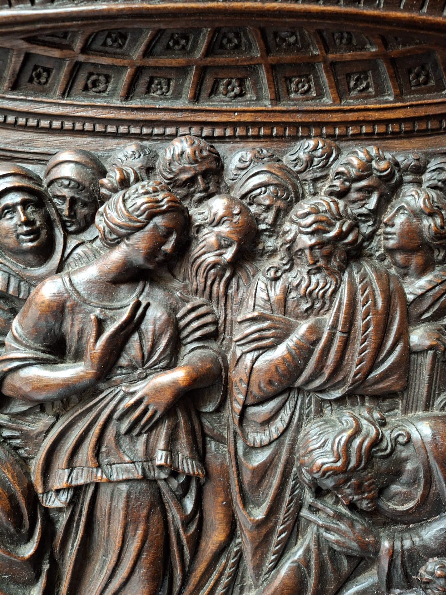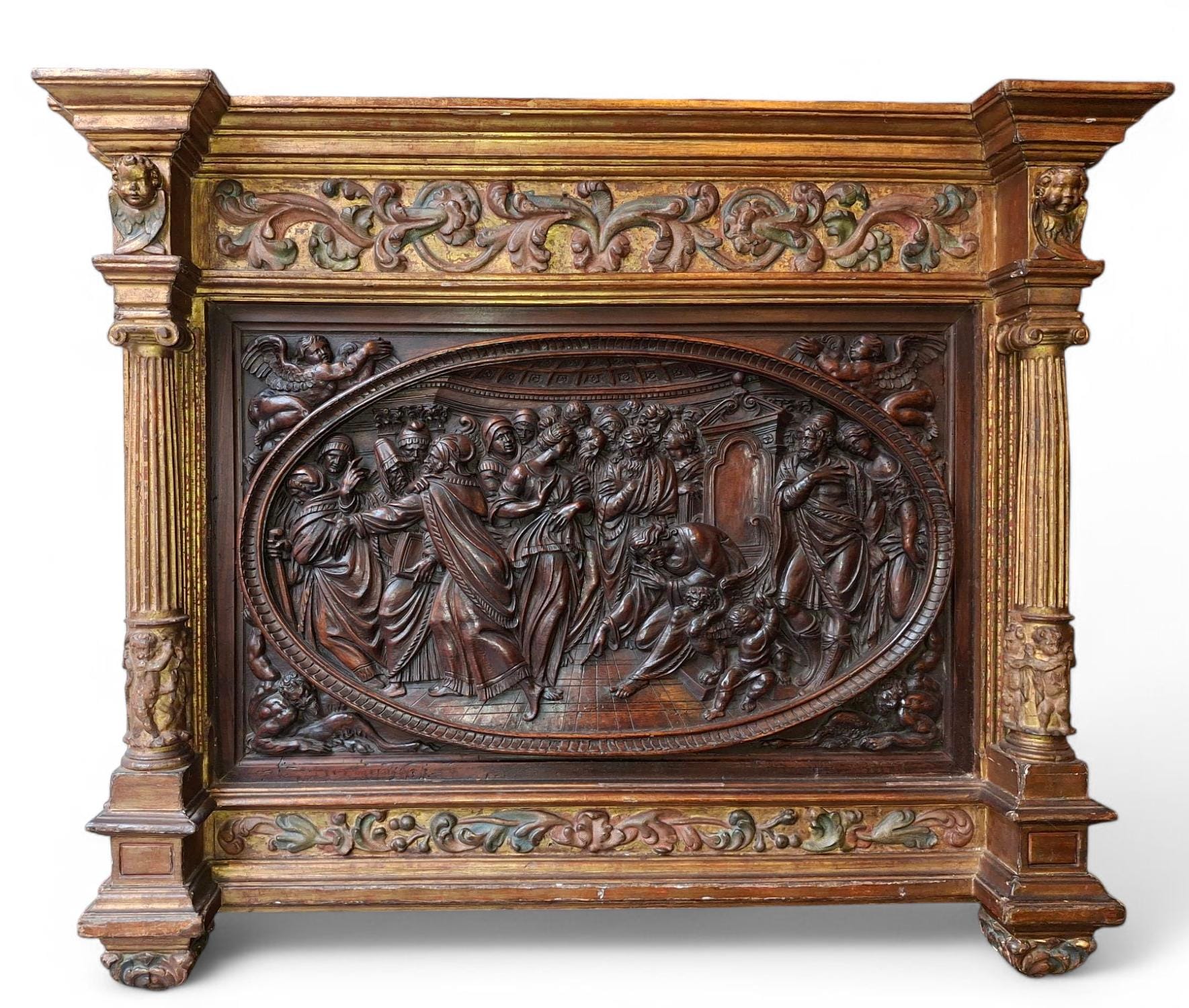Jacopo Tatti detto il Sansovino (Firenze 1486 - Venezia 1570) ambito di, bassorilievo in legno raffigurante scena con Cristo e l'Adultera, in cornice legnea dorata e laccata del XVI secolo, misure del pannello ligneo 40x66 cm, misure massime della cornice 96x78 cm.