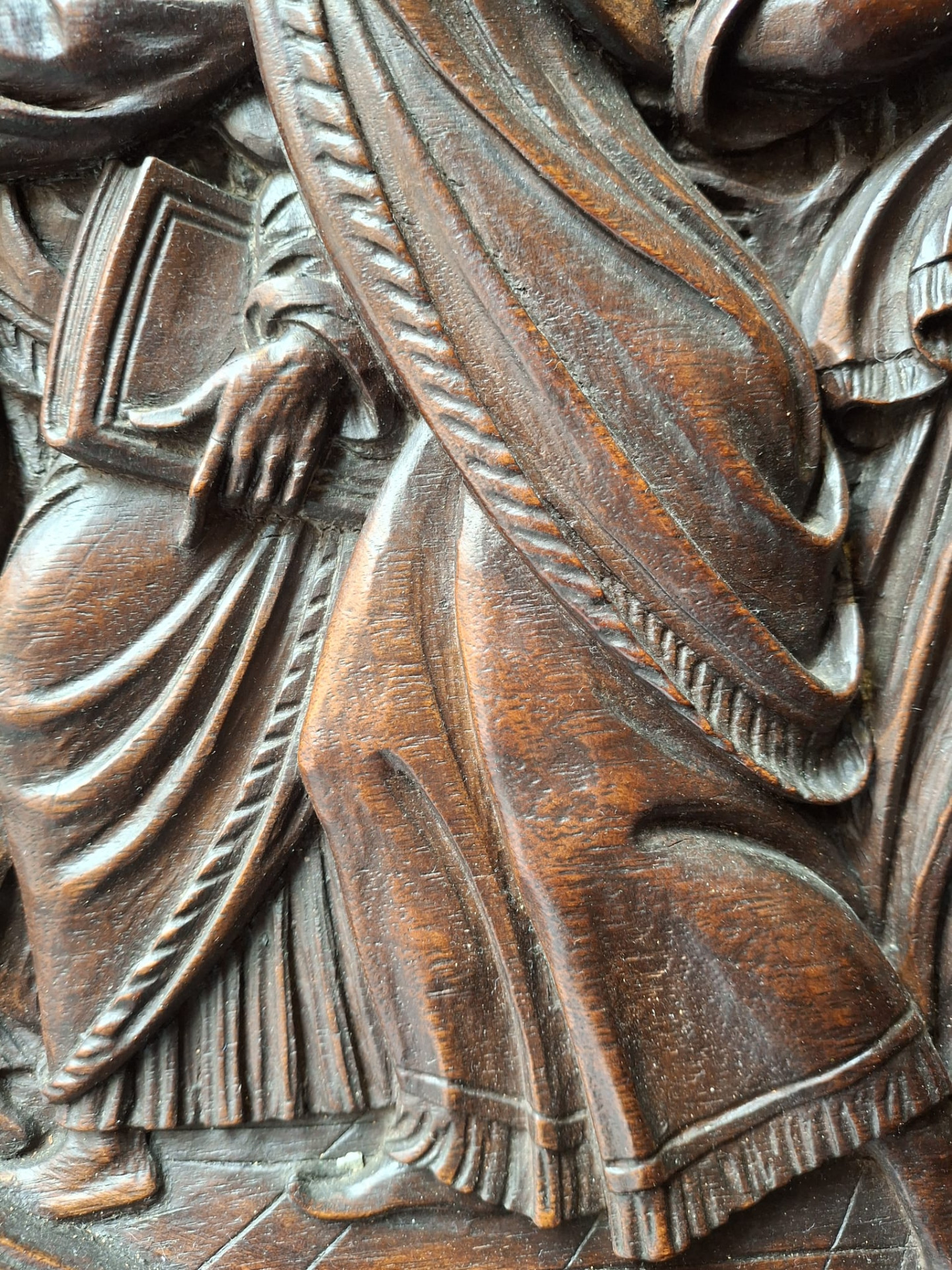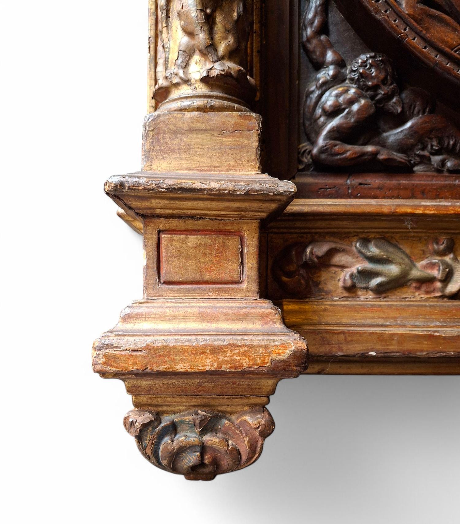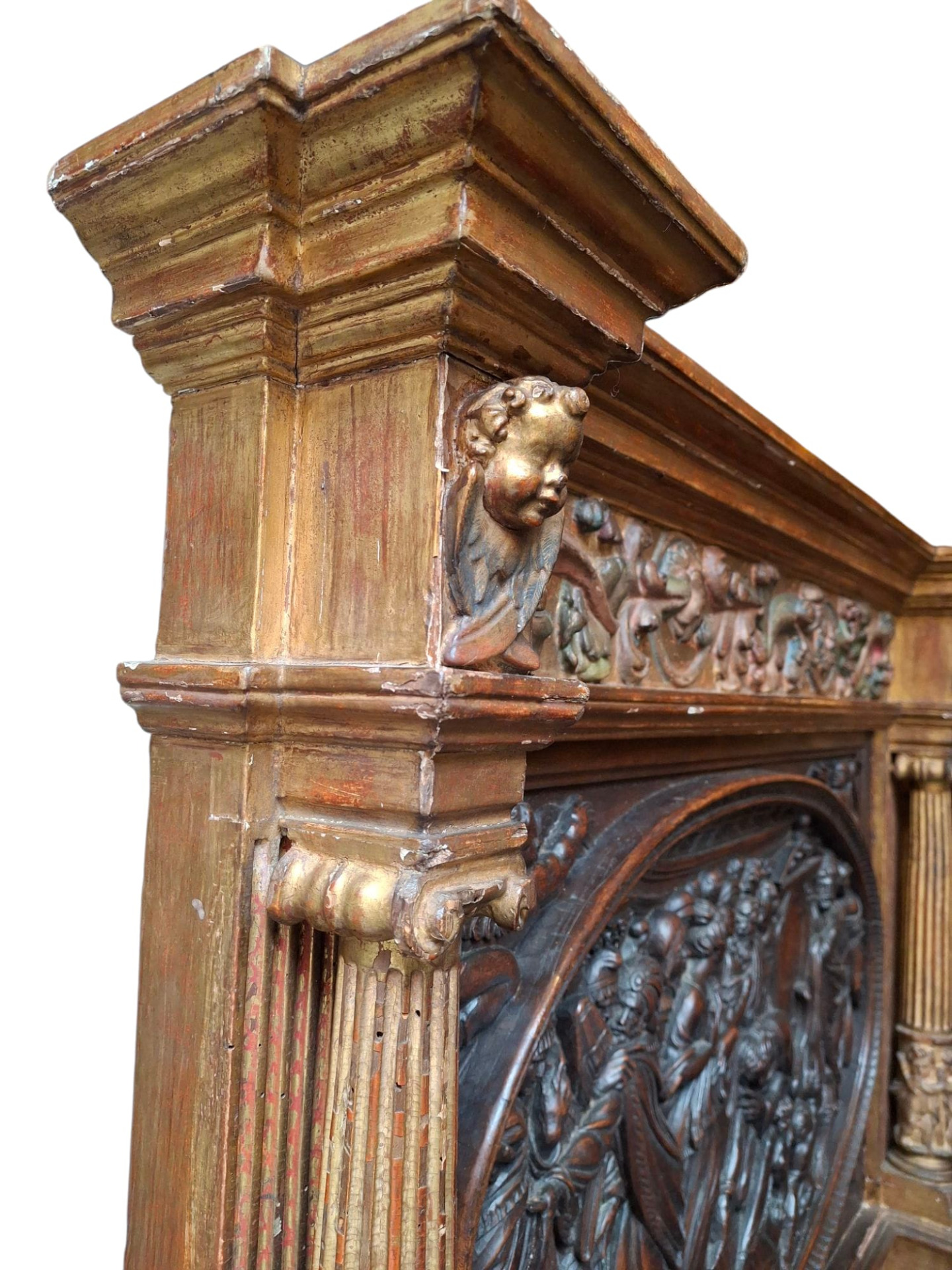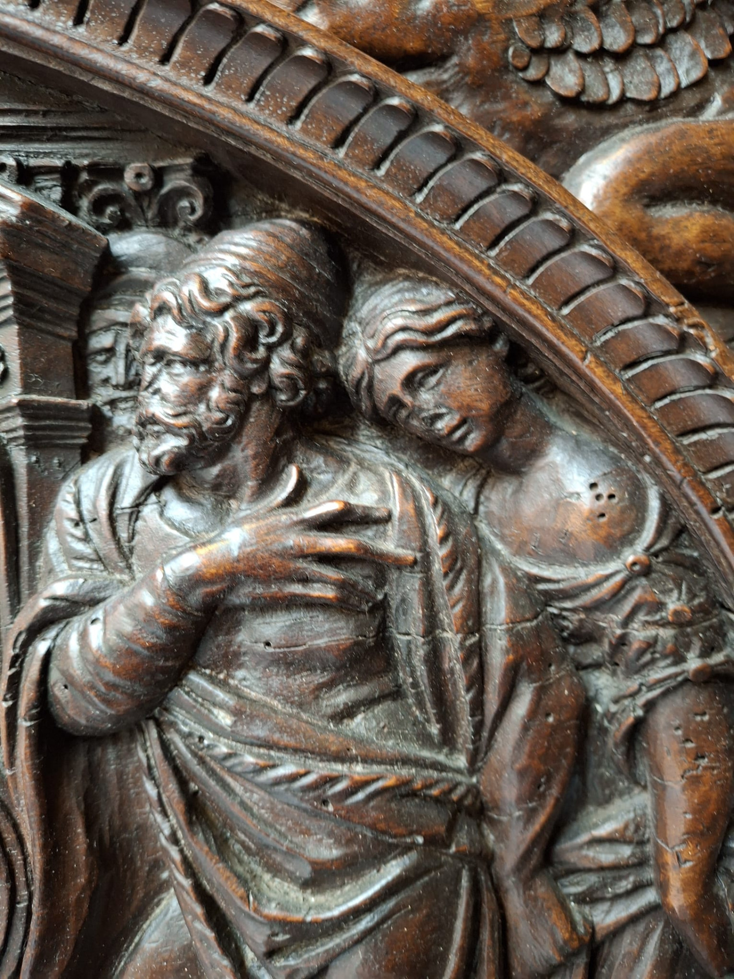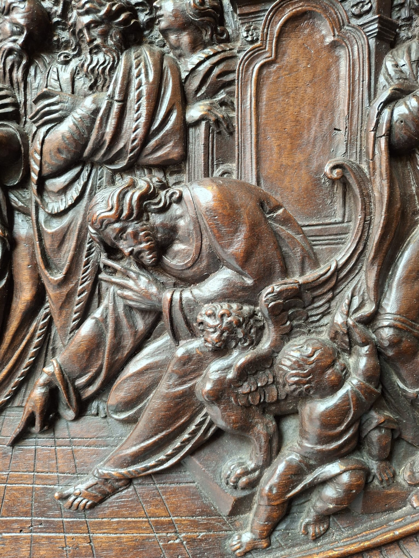 Jacopo Tatti detto il Sansovino (Firenze 1486 - Venezia 1570) ambito di, bassorilievo in legno raffigurante scena con Cristo e l'Adultera, in cornice legnea dorata e laccata del XVI secolo, misure del pannello ligneo 40x66 cm, misure massime della cornice 96x78 cm.