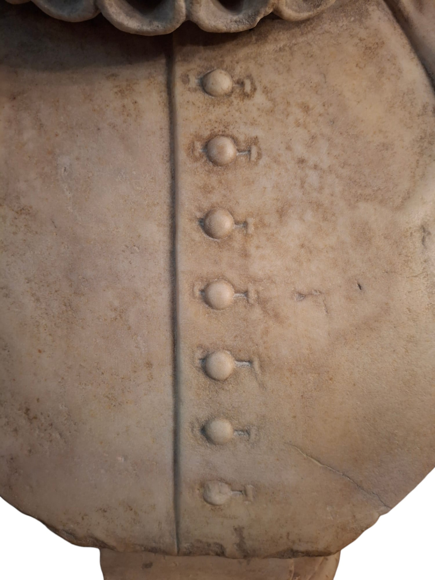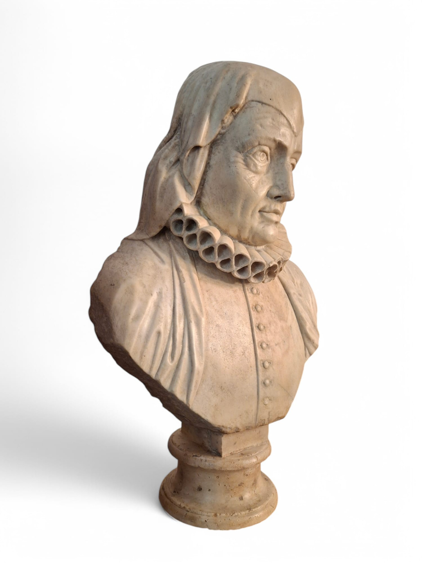 Noblewoman with ruff collar, marble bust from the late 16th century, travertine base, overall height 57 cm, base diameter 15 cm.
