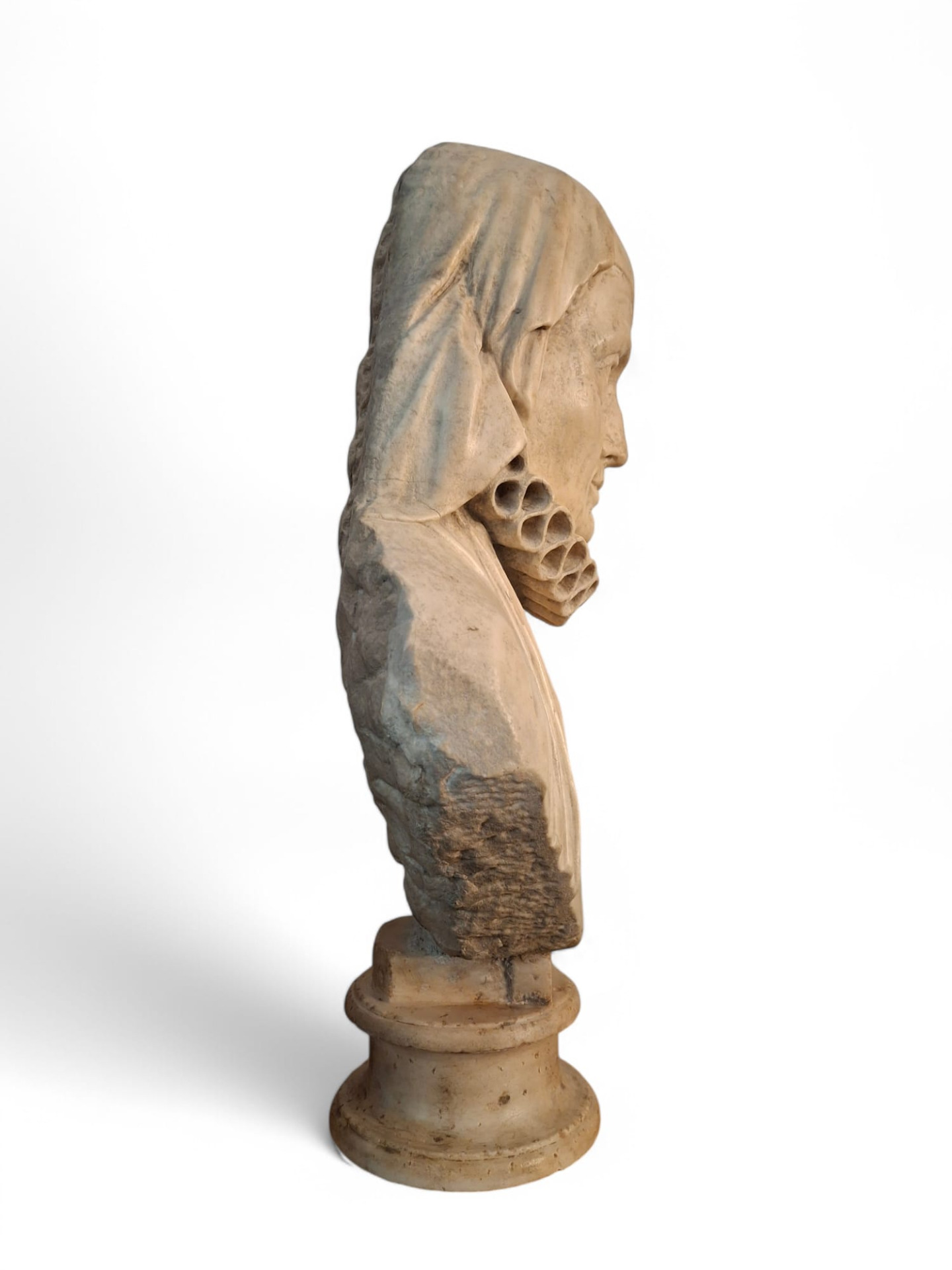 Noblewoman with ruff collar, marble bust from the late 16th century, travertine base, overall height 57 cm, base diameter 15 cm.