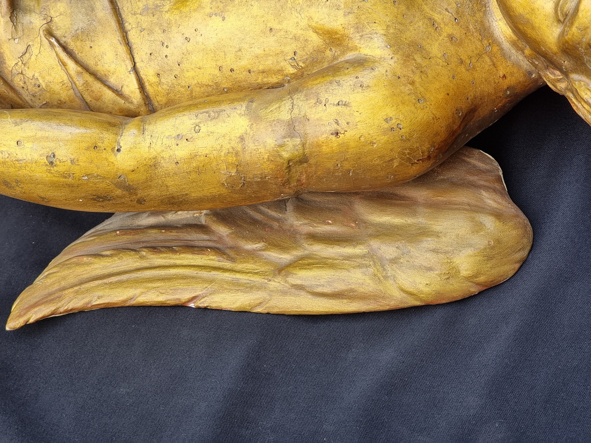 Suggestiva coppia di sculture lignee raffiguranti angeli in volo, scolpiti a tutto tondo e rivestiti da una raffinata doratura a foglia oro. Le figure, di forte espressività e movimento, sono rappresentate con un braccio sollevato, probabilmente per reggere un elemento oggi mancante – verosimilmente una corona o altro attributo simbolico, come spesso accadeva nei complessi altorilievi o sugli altari dedicati alla Madonna. Le due opere misurano rispettivamente: Angelo 1: altezza 103 cm (da mano a piede), larghezza circa 36 cm, profondità 23 cm Angelo 2: altezza 98 cm, larghezza circa 34 cm, profondità 21 cm Le sculture presentano evidenti segni del tempo e testimonianze di antichi interventi: mancanze (come un’ala sostituita), integrazioni visibili (rifacimento di alcune dita), e applicazioni successive di porporina, in particolare su mani e piedi. Il colore del bolo (arancio chiaro tendente al giallo) suggerisce una provenienza veneta. La qualità della doratura e l’eleganza delle forme confermano l’alta manifattura delle opere, nonostante le condizioni conservative. Gli angeli possono essere restaurati oppure lasciati nello stato attuale, valorizzandone la patina storica a seconda del gusto del collezionista. Spedizione internazionale disponibile. Contattaci per ulteriori informazioni.