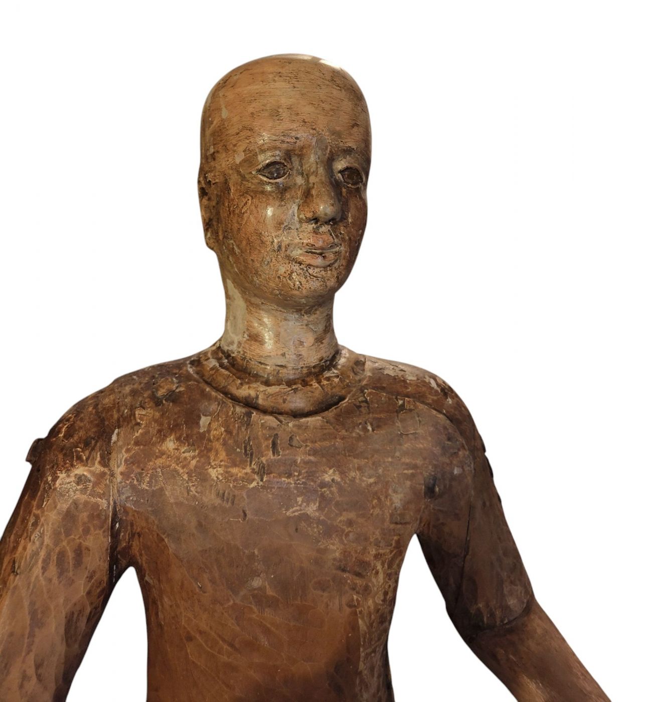 Raro manichino in legno policromo. Altezza cm 92 (base recente esclusa). Una mano presenta 2 dita danneggiate. Provenienza : Italia Centrale