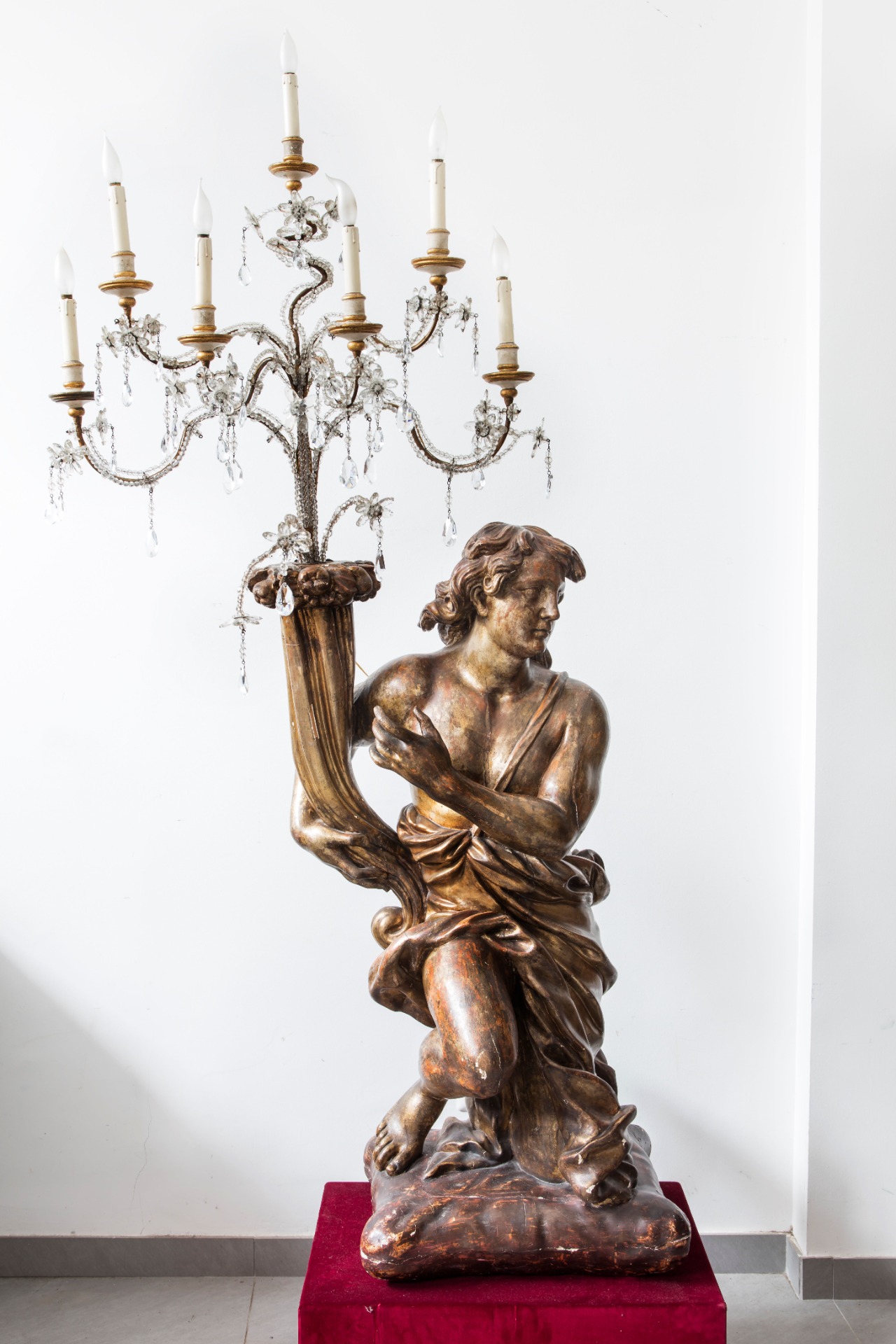 Scultore italiano del XVII secolo,  coppia di candelieri, legno scolpito e dorato modellato come figure virili genuflesse con cornucopie, cm 192x100x70  2023.109.10 Ad integrazione delle descrizioni, la galleria “Antichità Giglio” rende disponibili, a richiesta, condition report sullo...